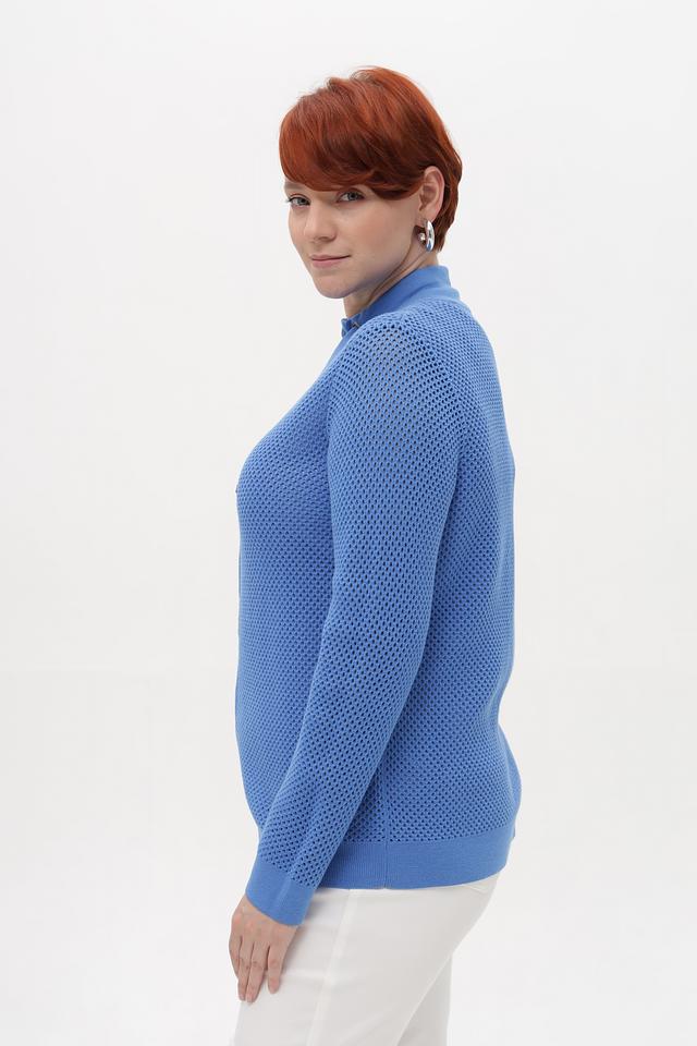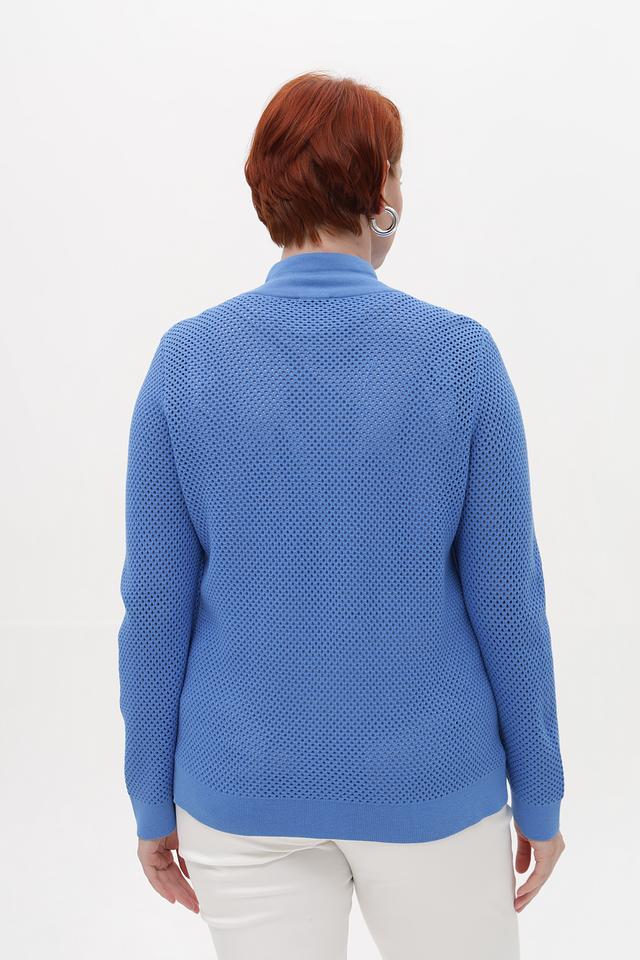 Женский жакет от бренда Lebek выполнен из мягкого трикотажа голубого цвета. Модель имеет прямой крой и застегивается на молнию по всей длине. Особенностью жакета является перфорация по всей поверхности, придающая изделию легкость и воздухопроницаемость.