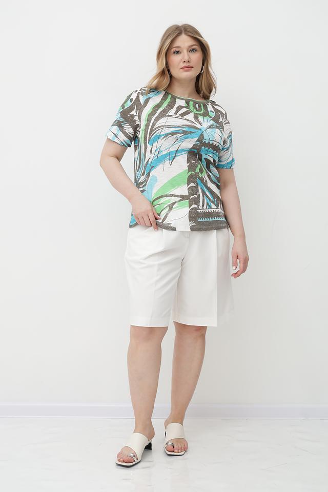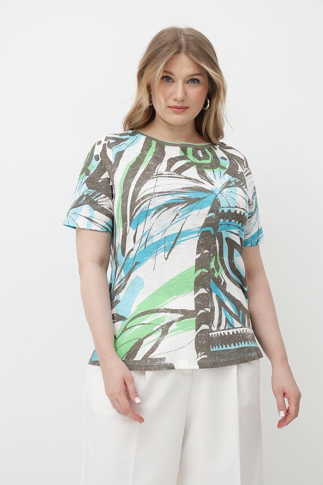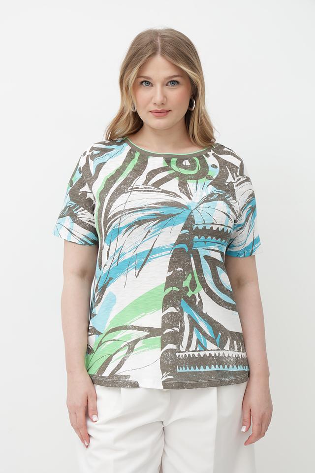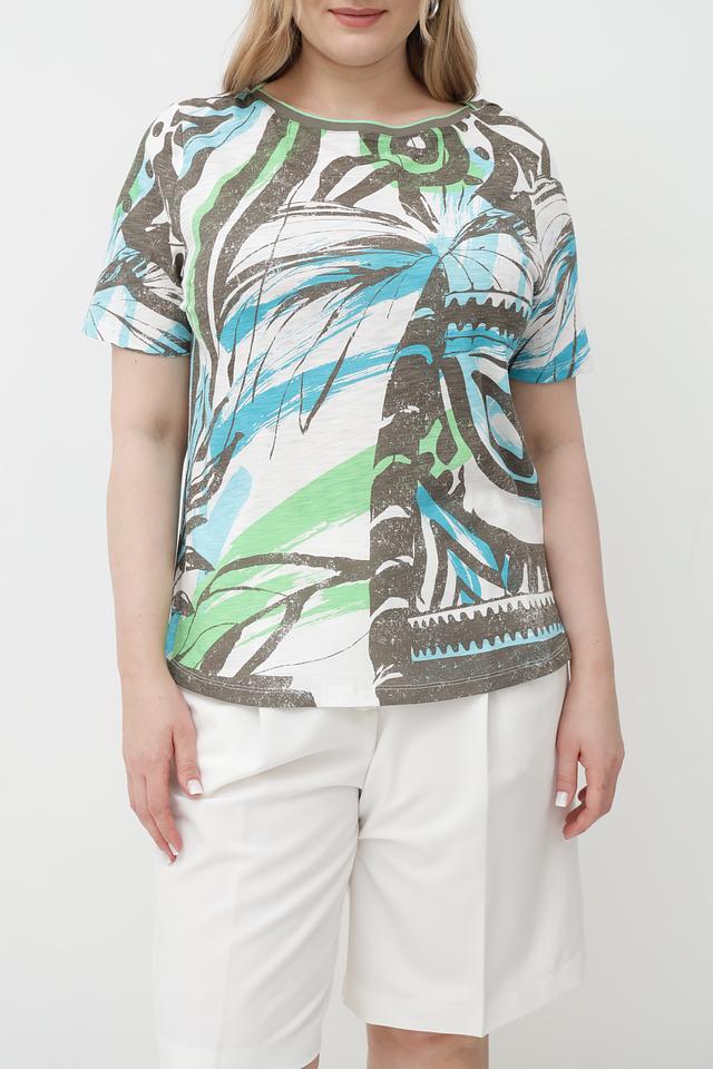 Особенностью данной футболки является оригинальный абстрактный принт, выполненный в сочетании бирюзового, зеленого и коричневого цветов. Принт создает эффектный визуальный акцент и делает эту футболку уникальной.