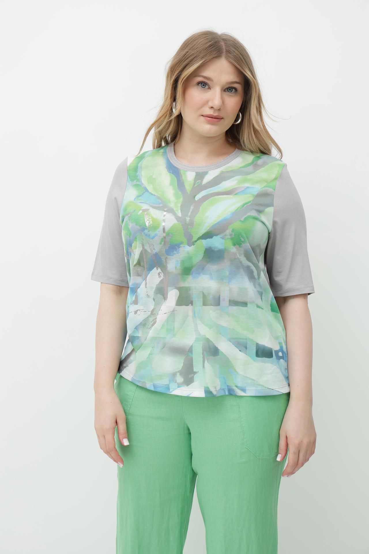 - Дизайн: Оригинальный принт в виде абстрактных листьев выполнен в освежающих зеленых и синих тонах. Передняя часть футболки украшена этим эффектным узором, в то время как спинка и рукава выполнены в однотонном сером цвете, создавая интересный контраст.