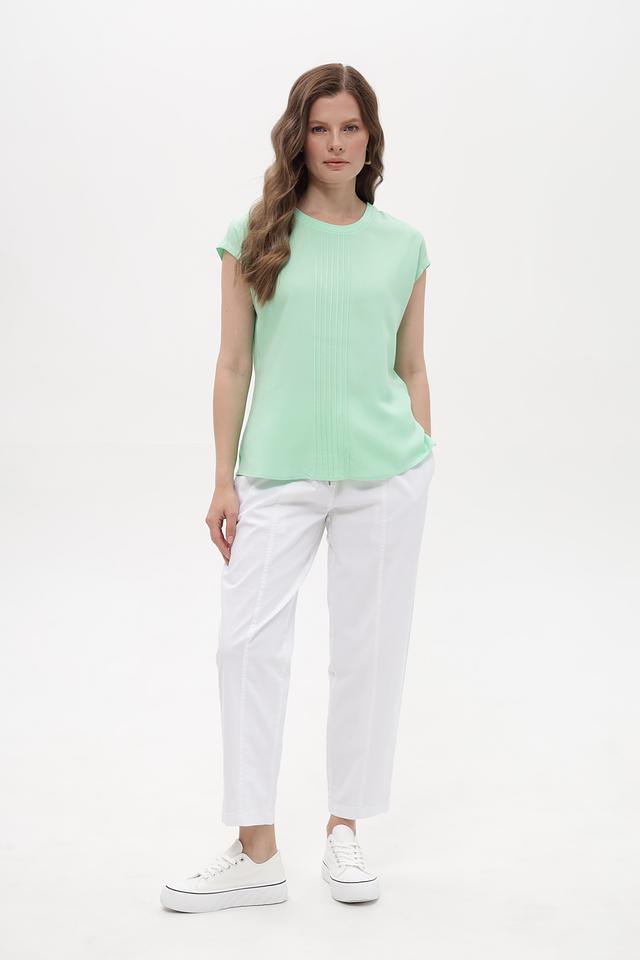 Блуза имеет прямой крой, короткие рукава и круглый вырез горловины. Особый акцент сделан на вертикальные декоративные складки, расположенные на передней части изделия, которые визуально вытягивают силуэт и придают блузе элегантный вид.
