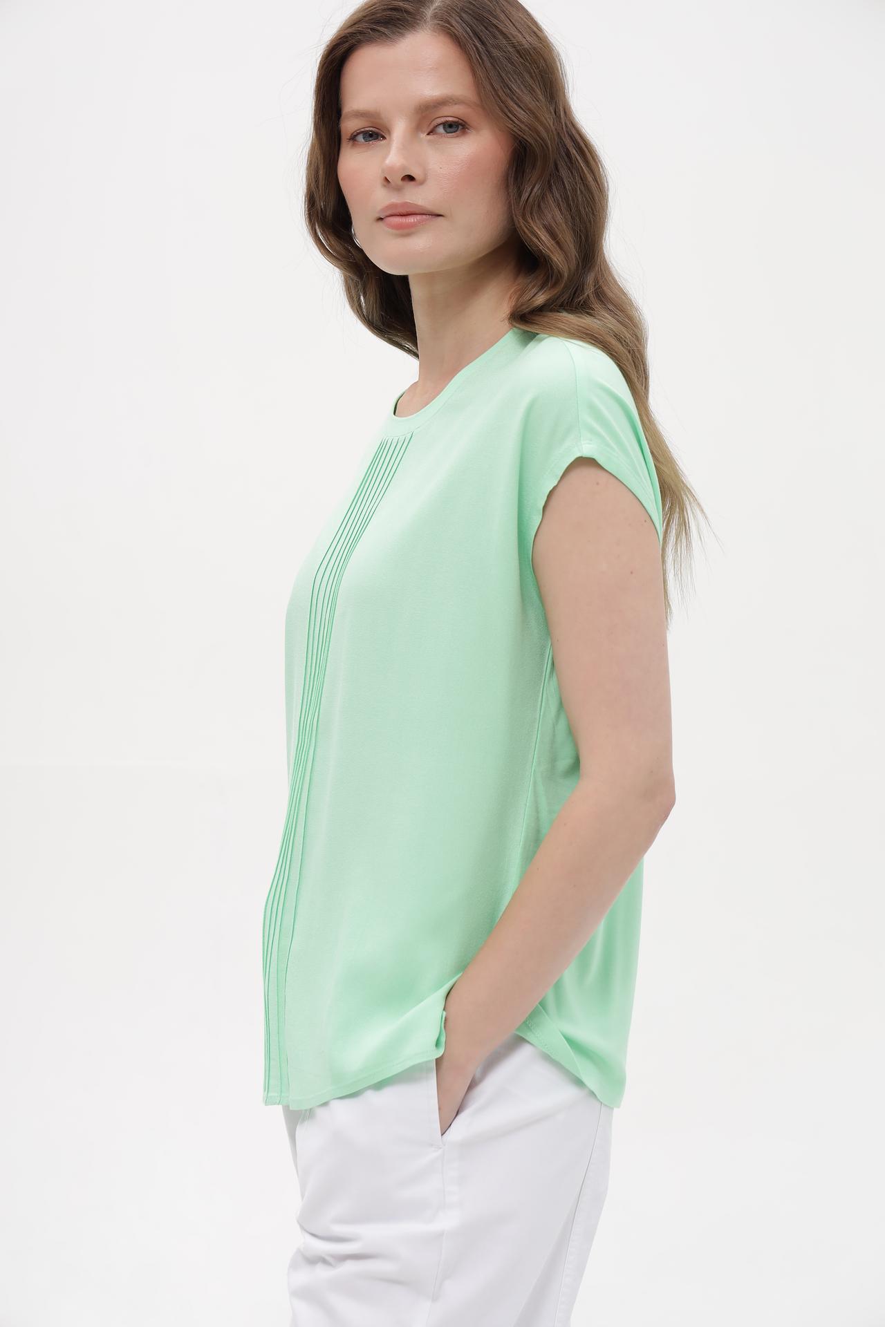 Блуза выполнена в трендовом мятном оттенке, который освежает образ и придает ему легкость. Декоративные складки, расположенные по центру, добавляют изысканности и оригинальности. Этот предмет гардероба идеально подходит как для повседневных образов, так и для создания стильных ансамблей для особых случаев.