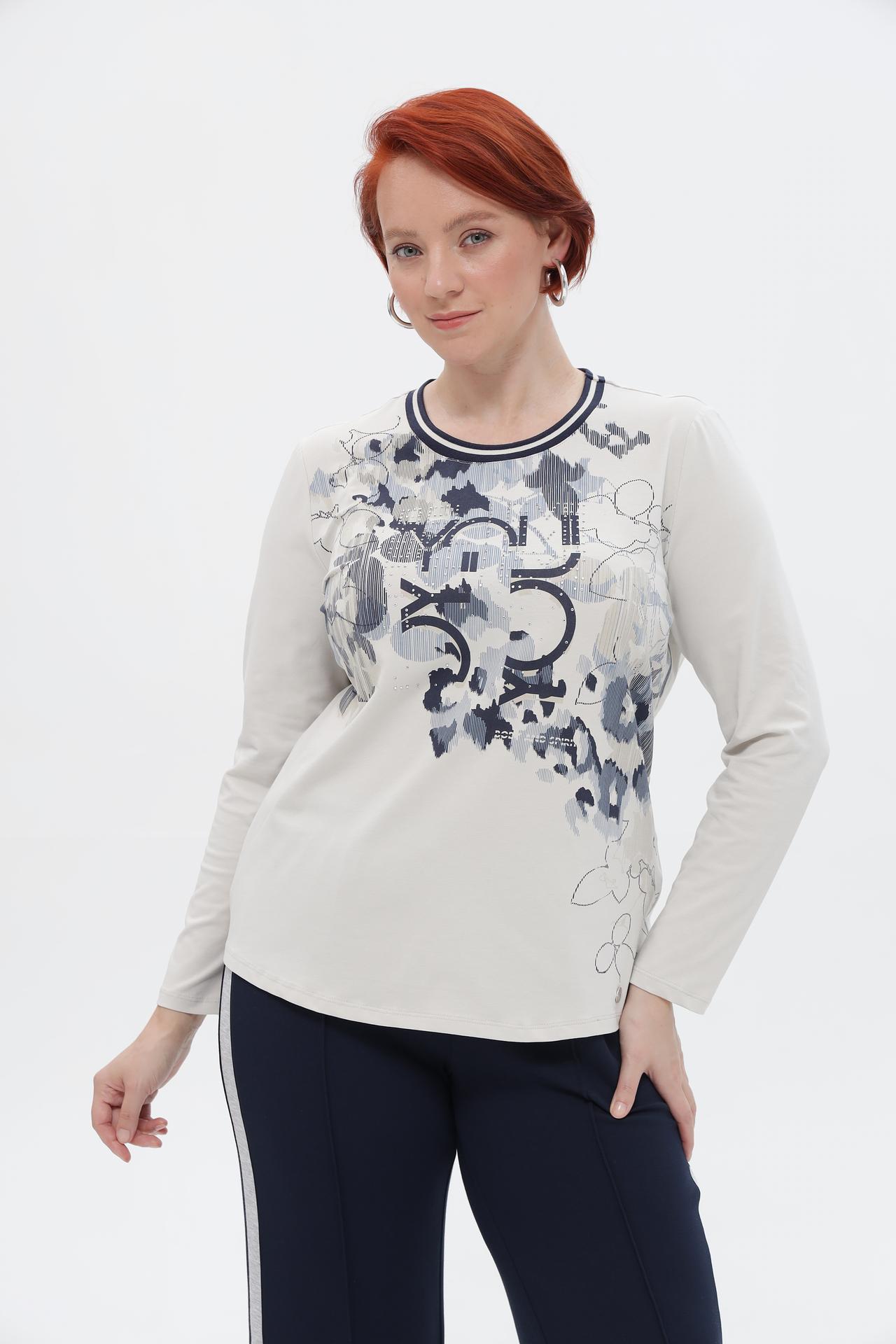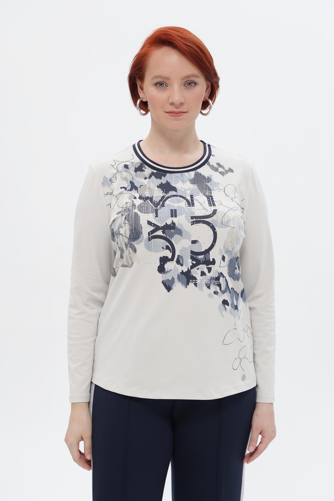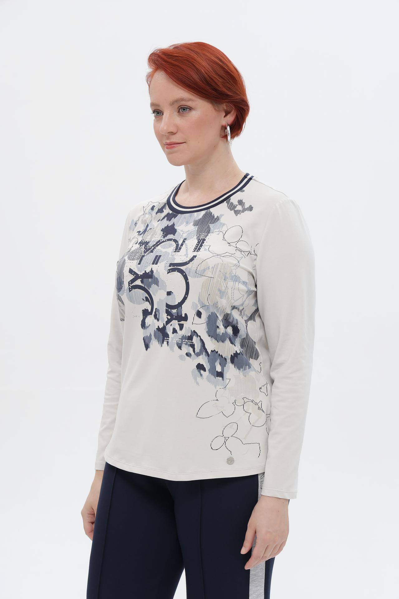 Дизайн футболки украшен оригинальным принтом в синих и серых тонах, который придает изделию особую изысканность. Круглый вырез горловины и длинные рукава делают ее универсальной для любого случая.