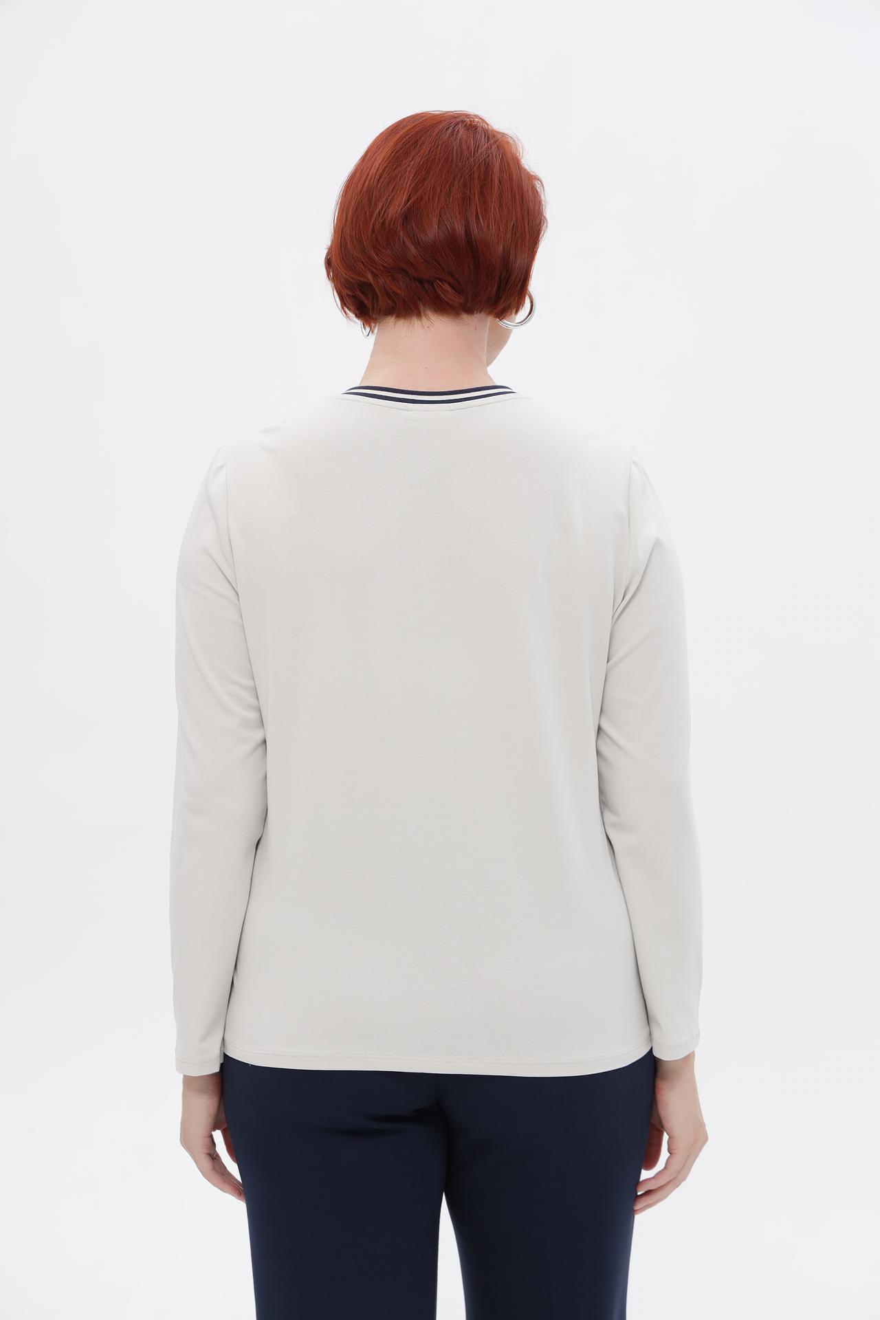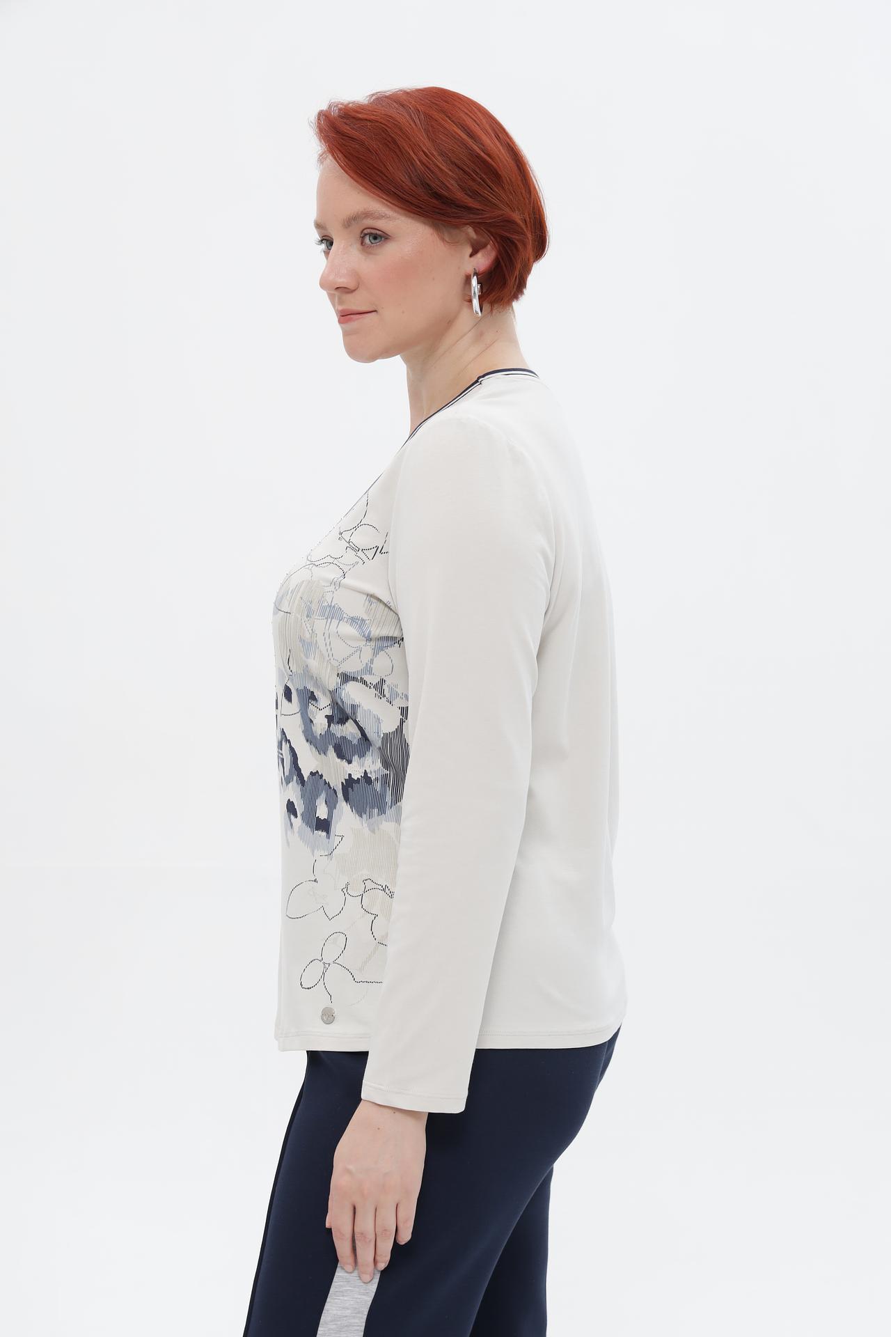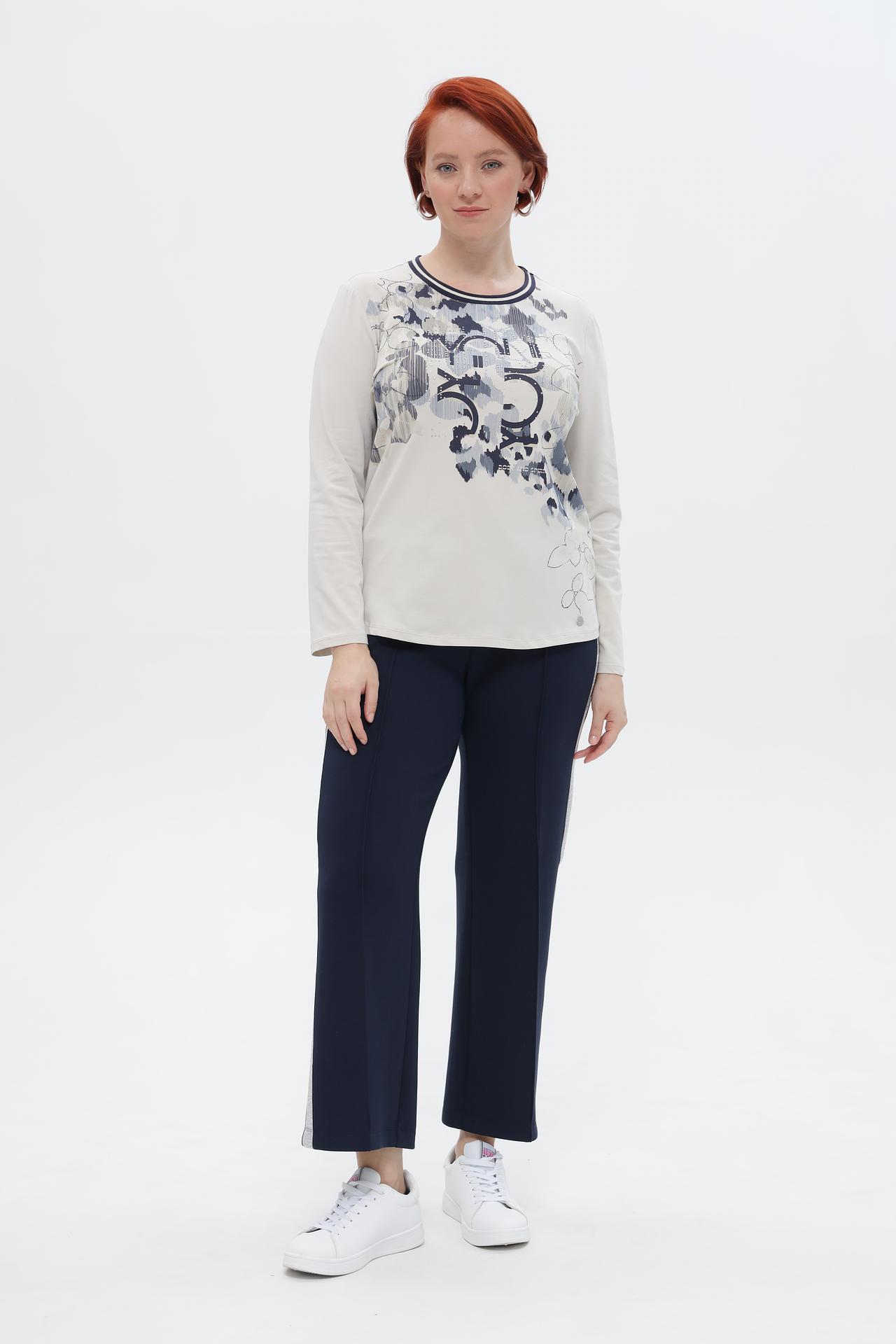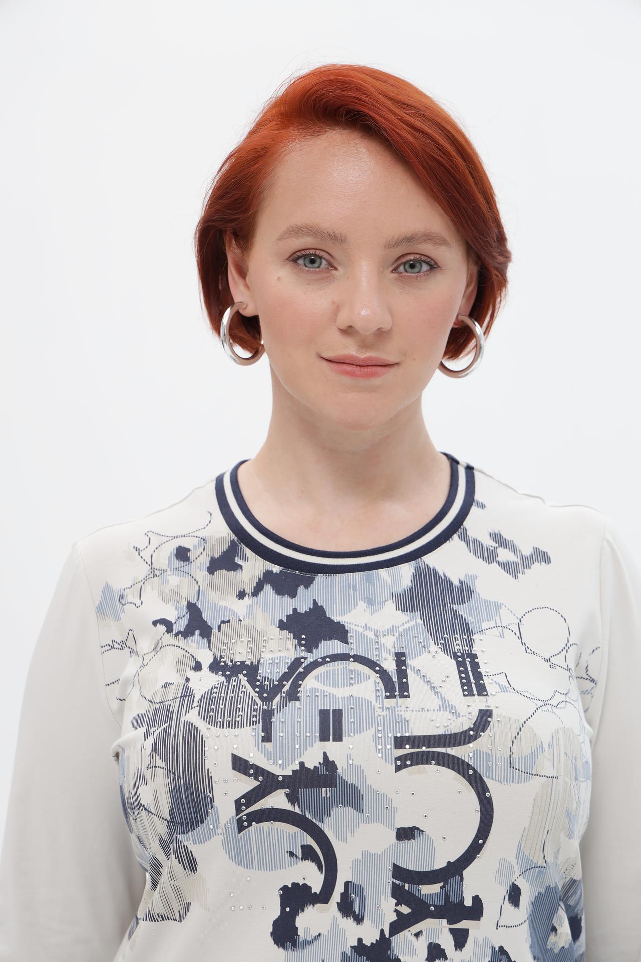 Дизайн футболки украшен оригинальным принтом в синих и серых тонах, который придает изделию особую изысканность. Круглый вырез горловины и длинные рукава делают ее универсальной для любого случая.