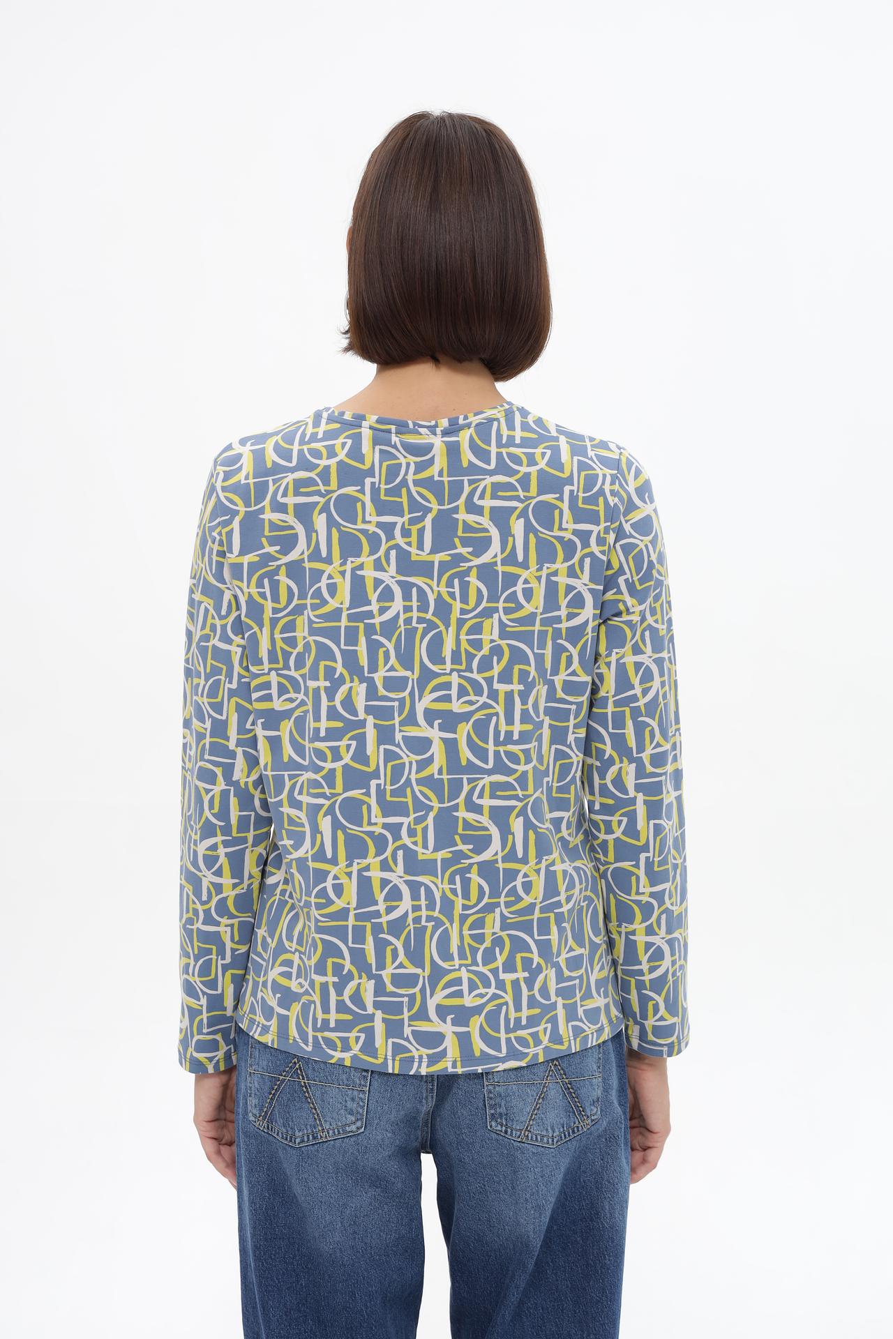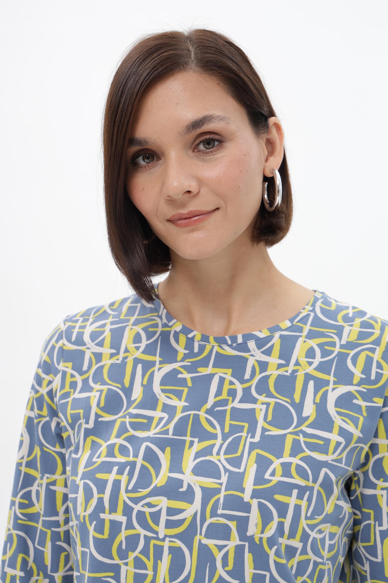 - Дизайн: Футболка украшена стильным геометрическим принтом в сине-желто-белых тонах. Этот яркий и современный узор делает модель акцентной деталью гардероба.
