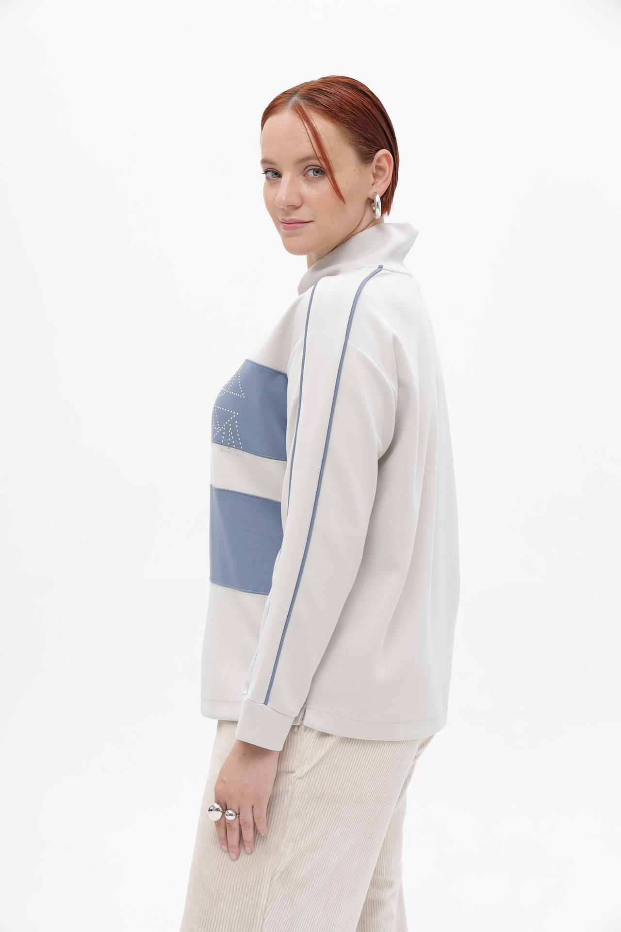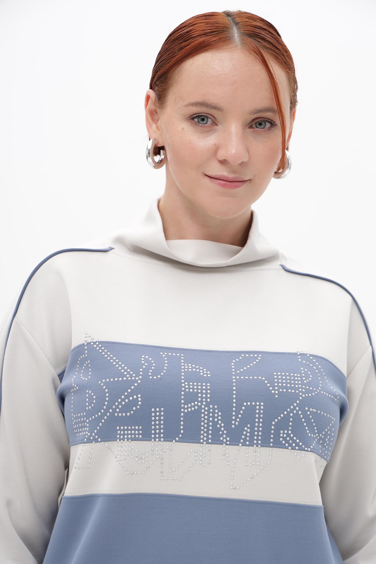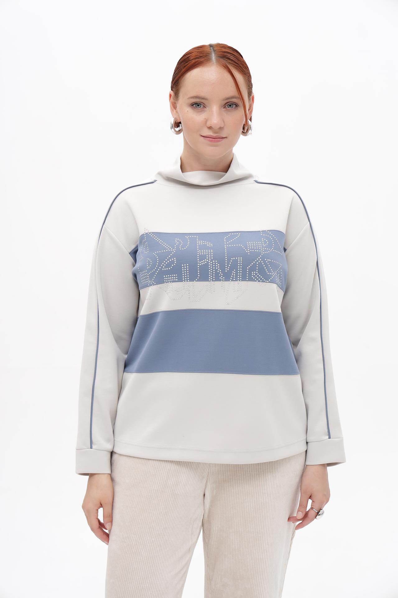 - Дизайн: Пуловер отличается оригинальным дизайном с сочетанием двух цветов и декоративной вставкой, украшенной блестящими кристаллами. Контрастная отделка вдоль рукавов и по вороту добавляет изысканности.