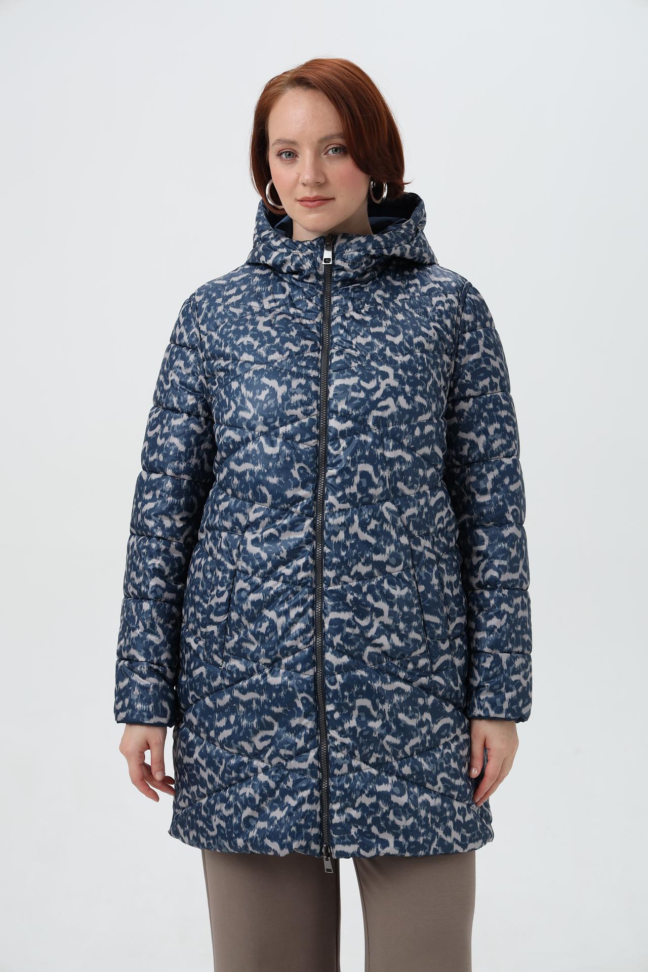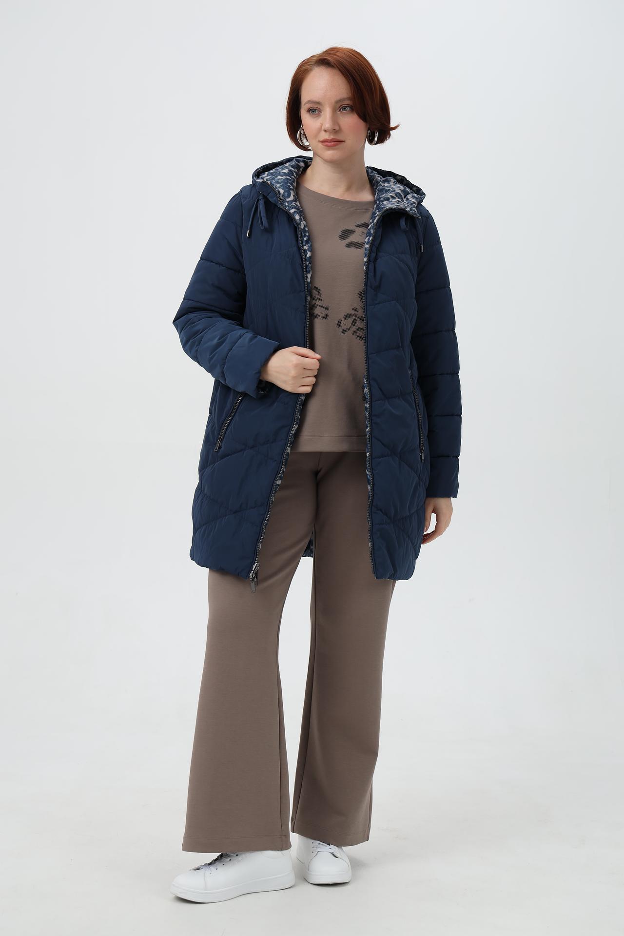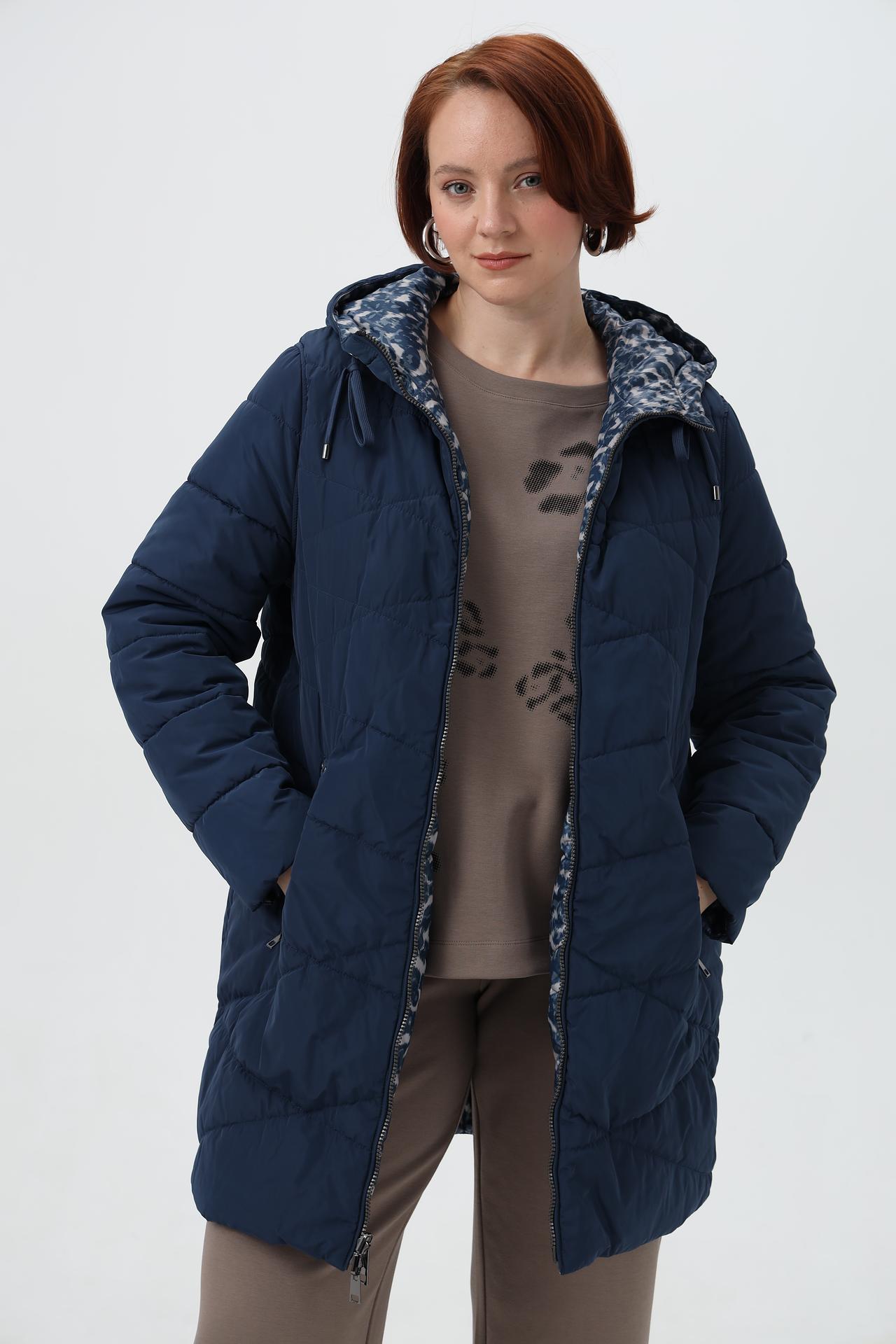 - Двусторонность: Возможность носить куртку как в однотонном темно-синем цвете, так и с эффектным принтом, делает ее универсальной для создания различных образов.