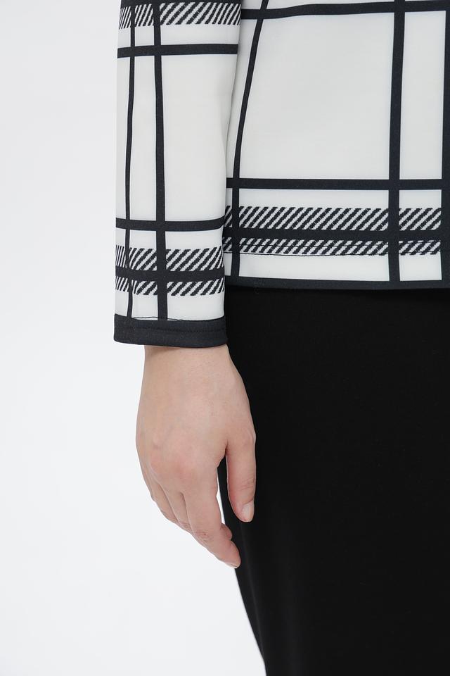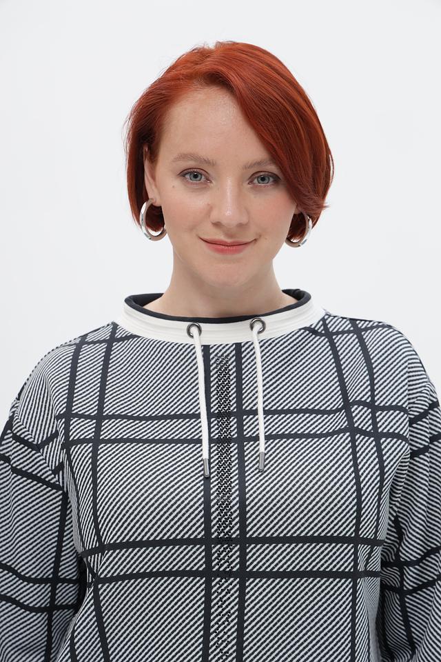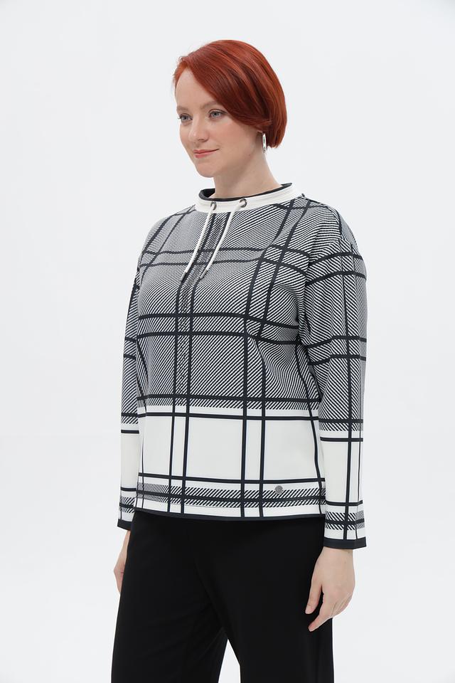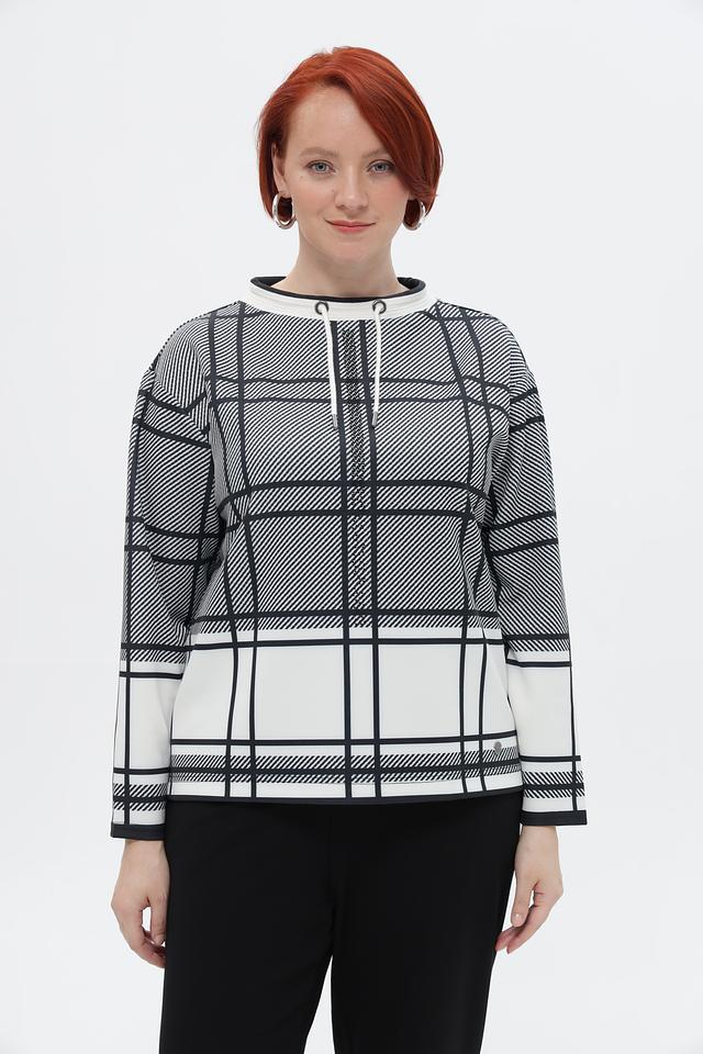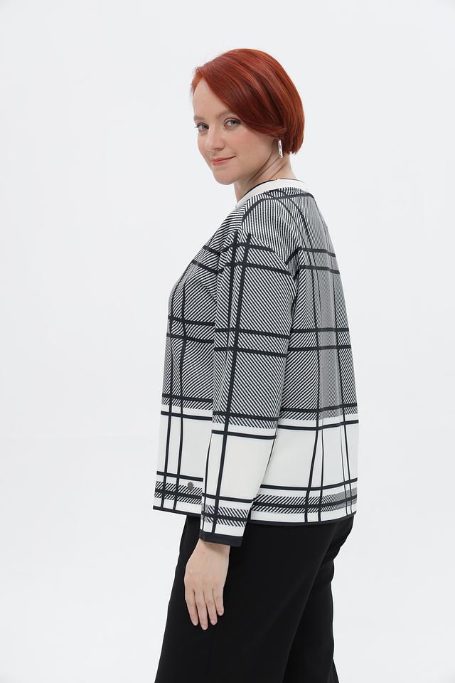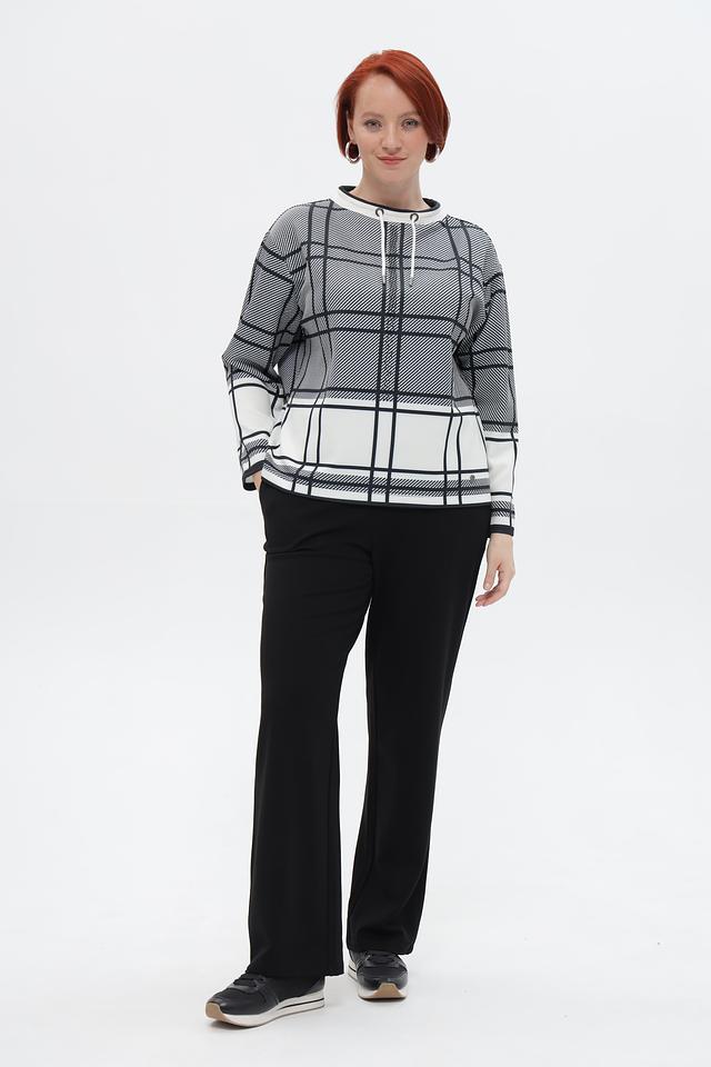 Особенность пуловера – актуальный черно-белый рисунок «клетка», который легко сочетается с различными элементами гардероба. Рукава модели – длинные, манжеты отделаны черной тесьмой, гармонирующей с принтом.