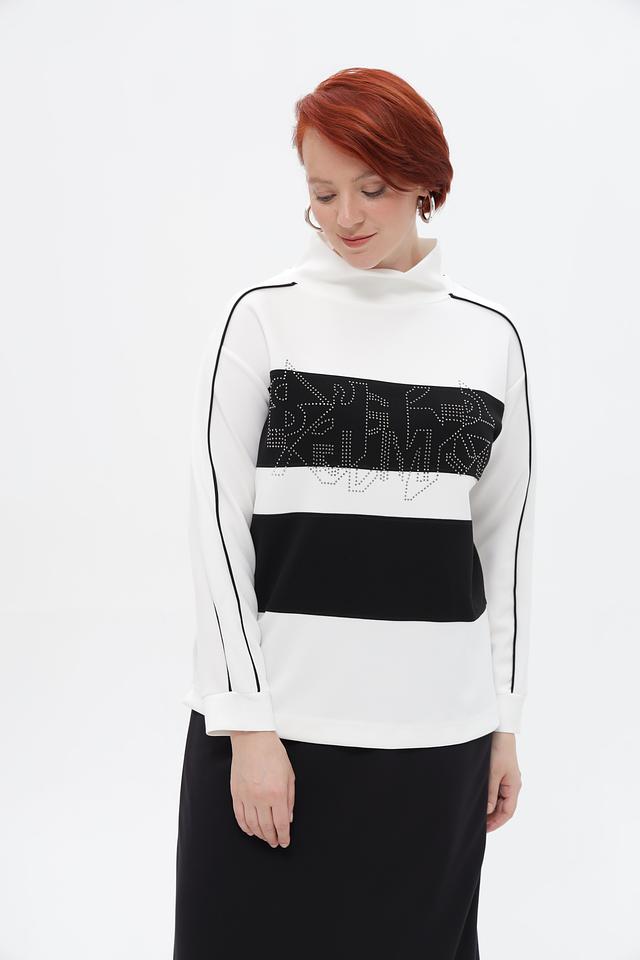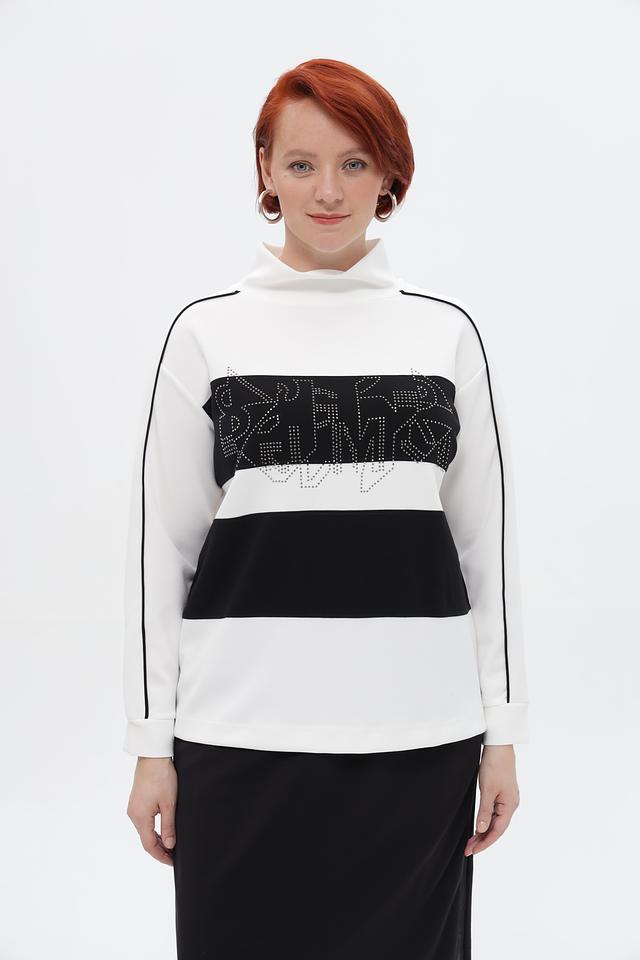 Стильный пуловер от бренда Lebek станет ярким акцентом вашего образа. Модель выполнена в белом цвете с черными вставками и эффектным декором из страз.