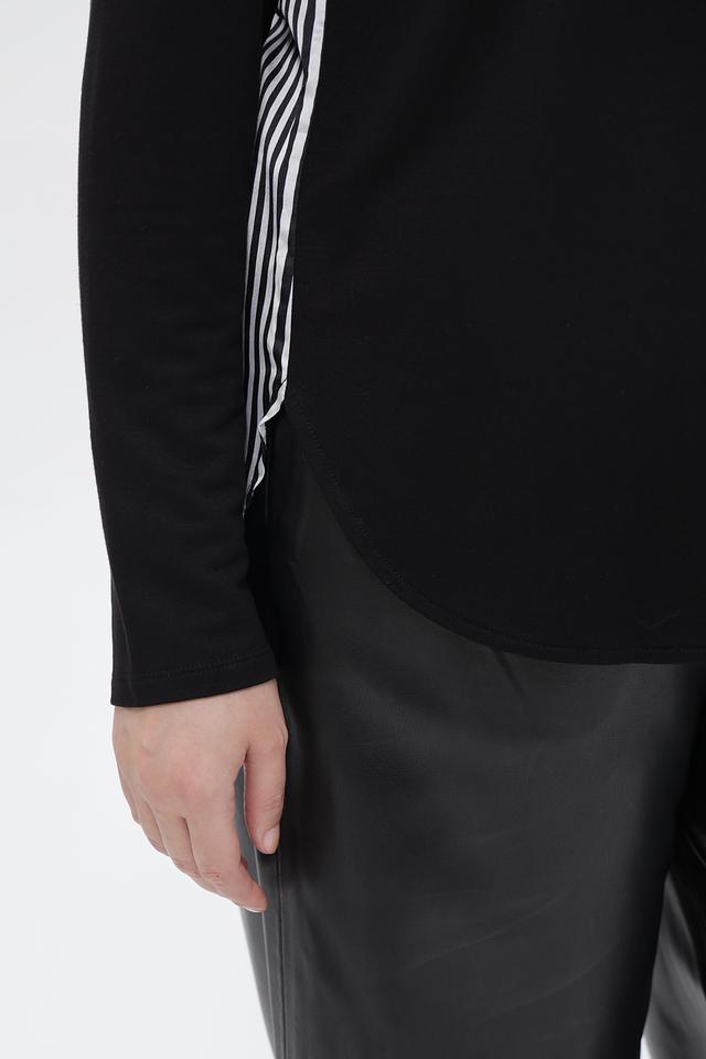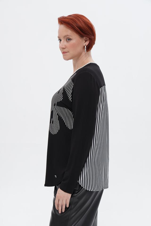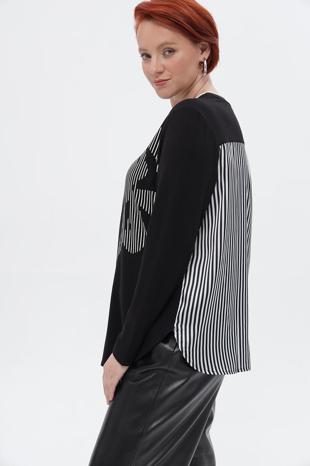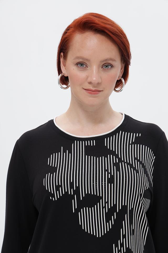 Женская футболка от бренда Lebek выполнена в чёрном цвете с эффектным принтом в виде лица, состоящего из белых вертикальных полос. Модель имеет круглый вырез горловины и длинные рукава, что делает её подходящей для прохладной погоды.