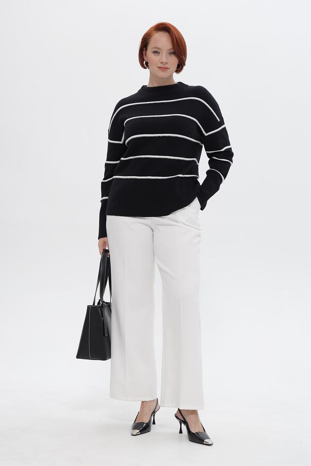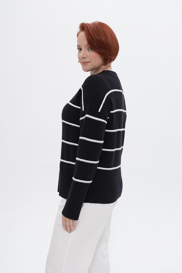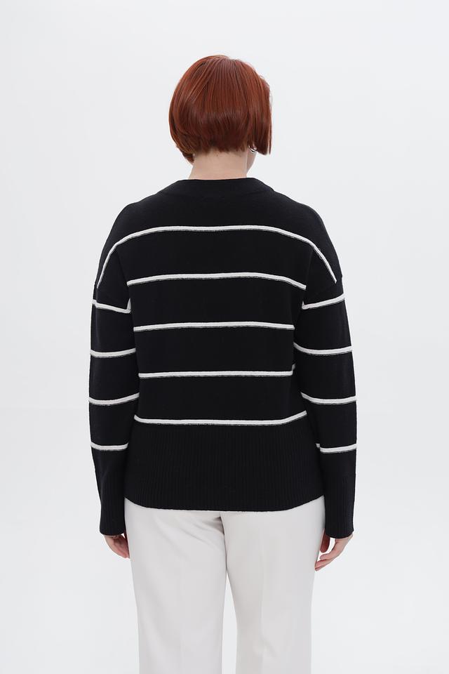 Пуловер украшен горизонтальными полосами белого цвета, что придает ему свежий и современный вид. Свободный крой обеспечивает комфортную посадку по фигуре и не сковывает движений.