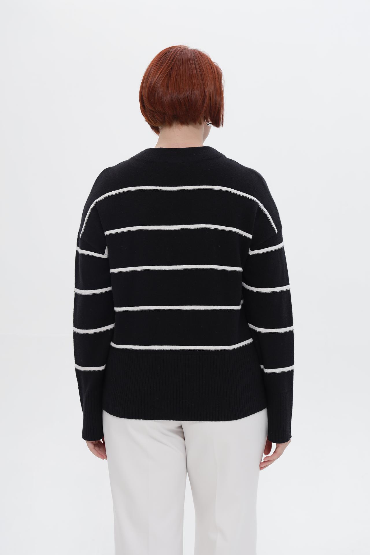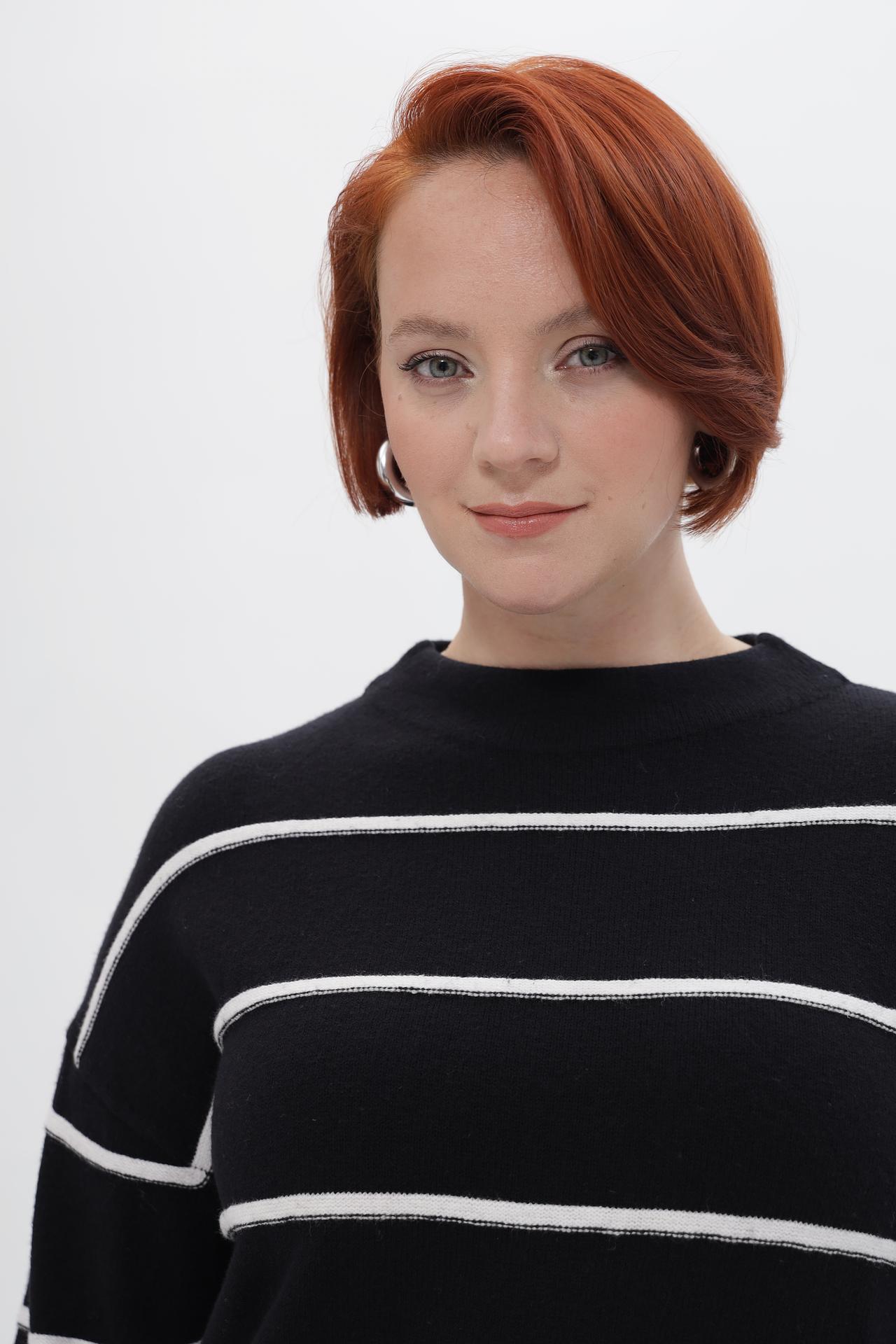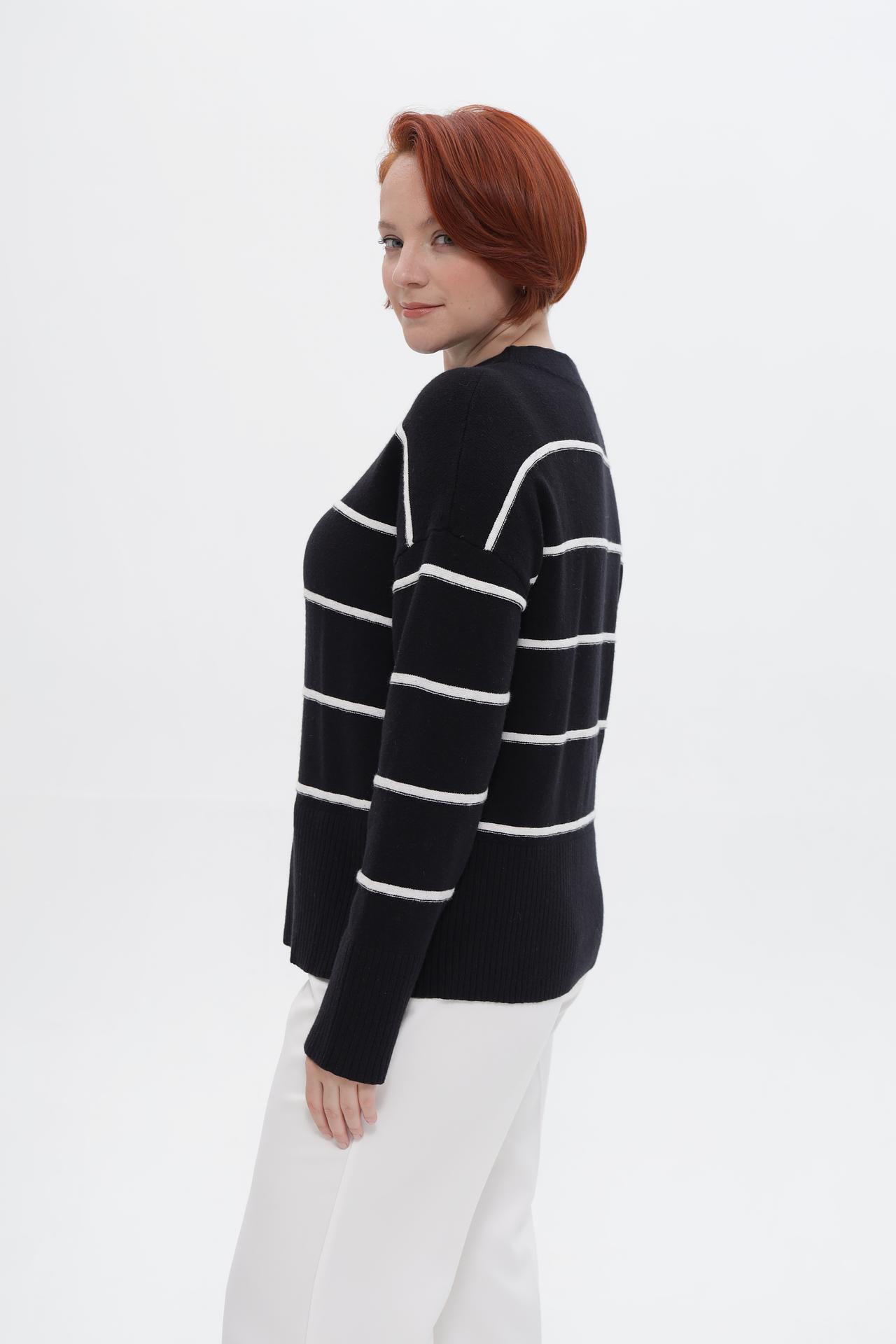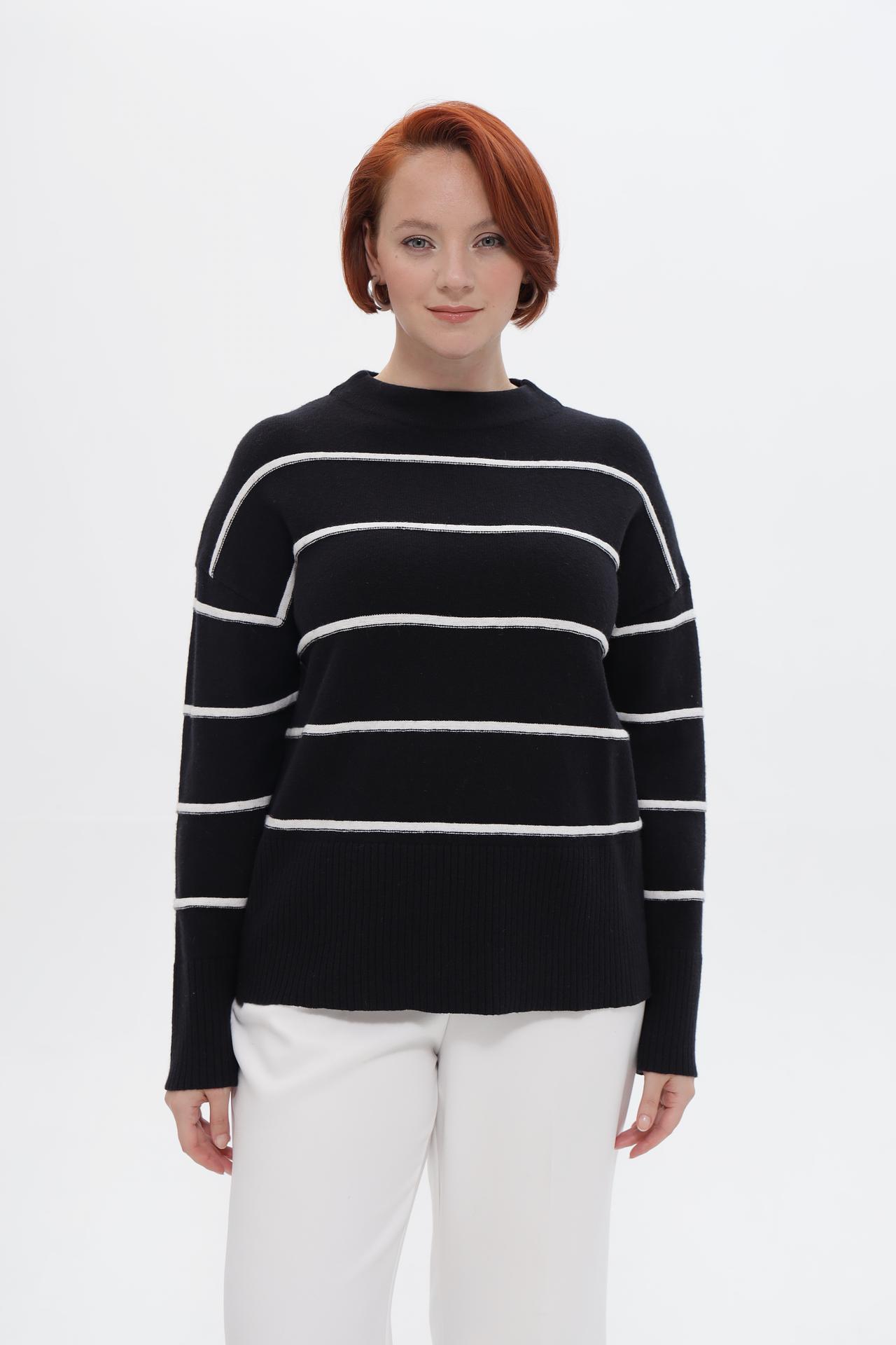 - Дизайн: Классический крой и актуальный принт в горизонтальную полоску делают пуловер универсальным элементом гардероба. Контрастные белые полосы добавляют динамики и визуального интереса.