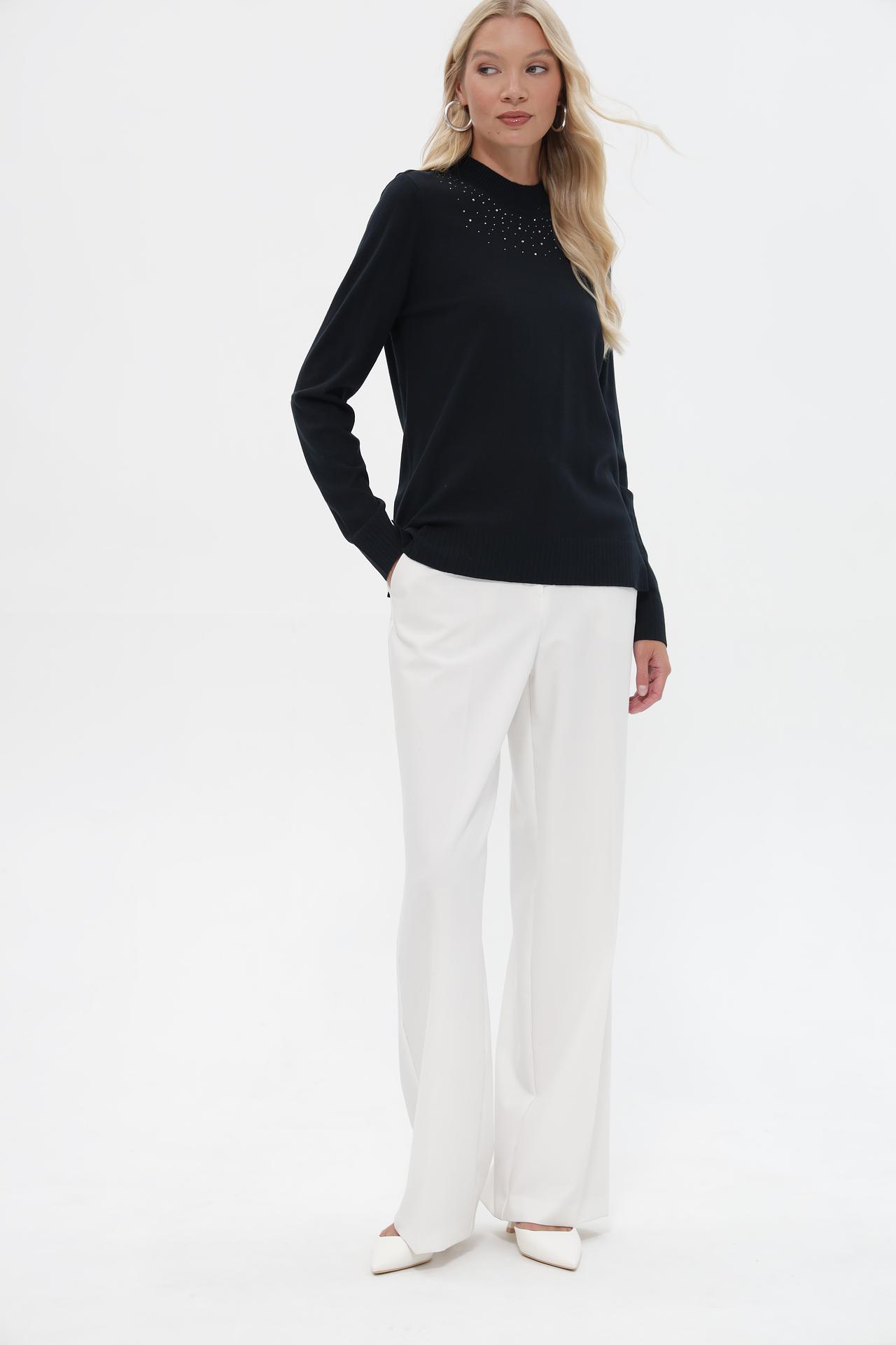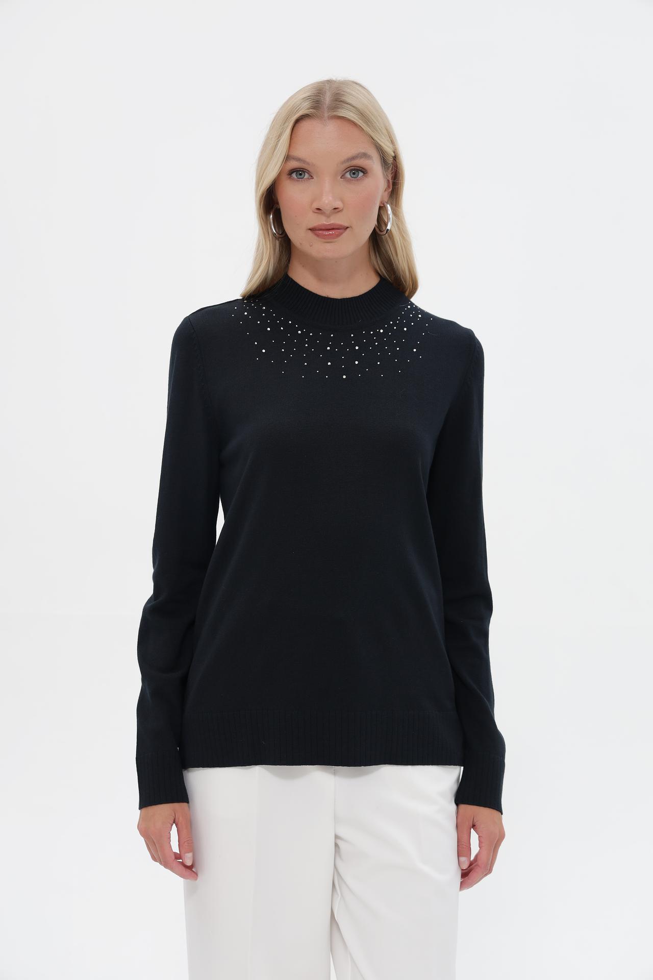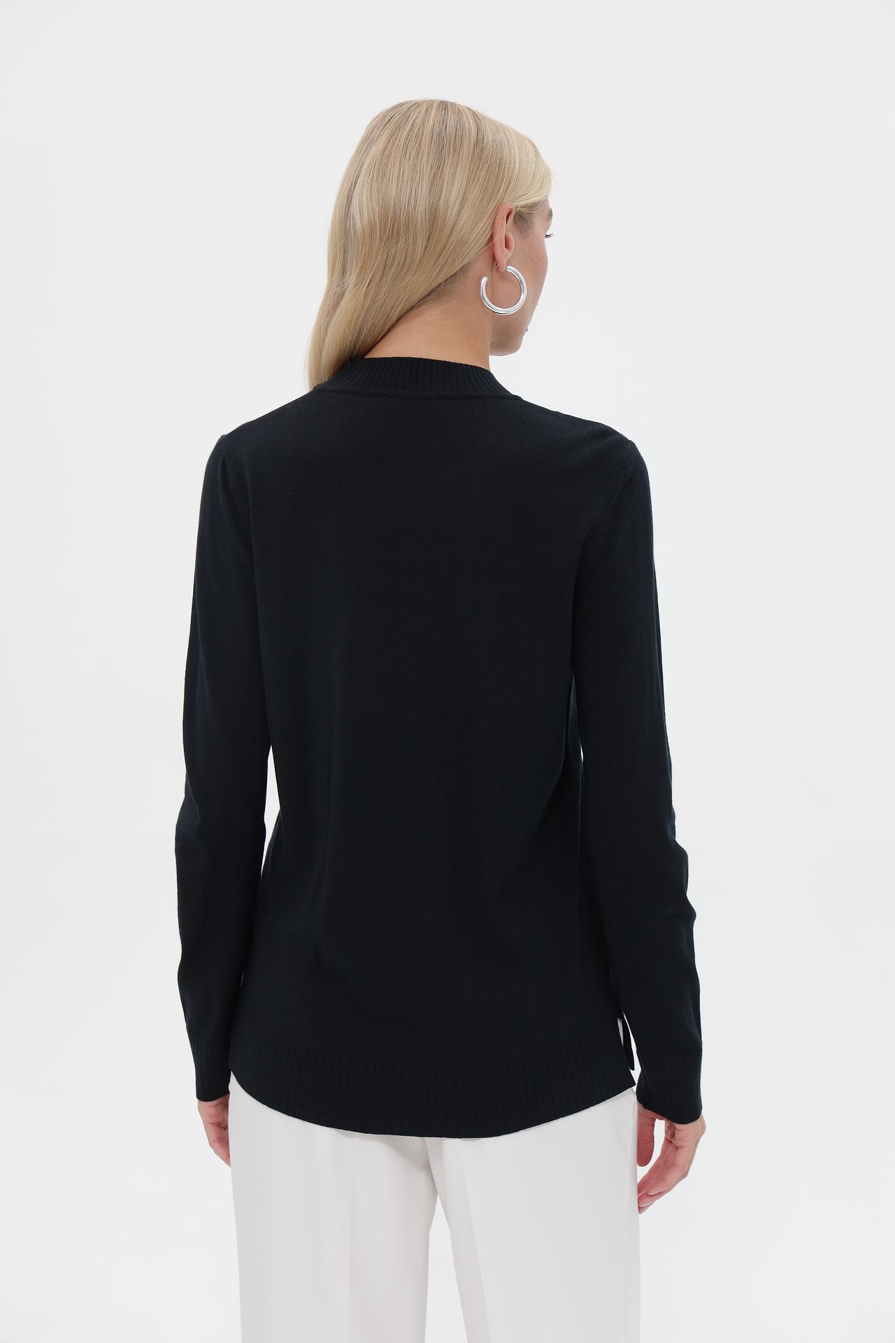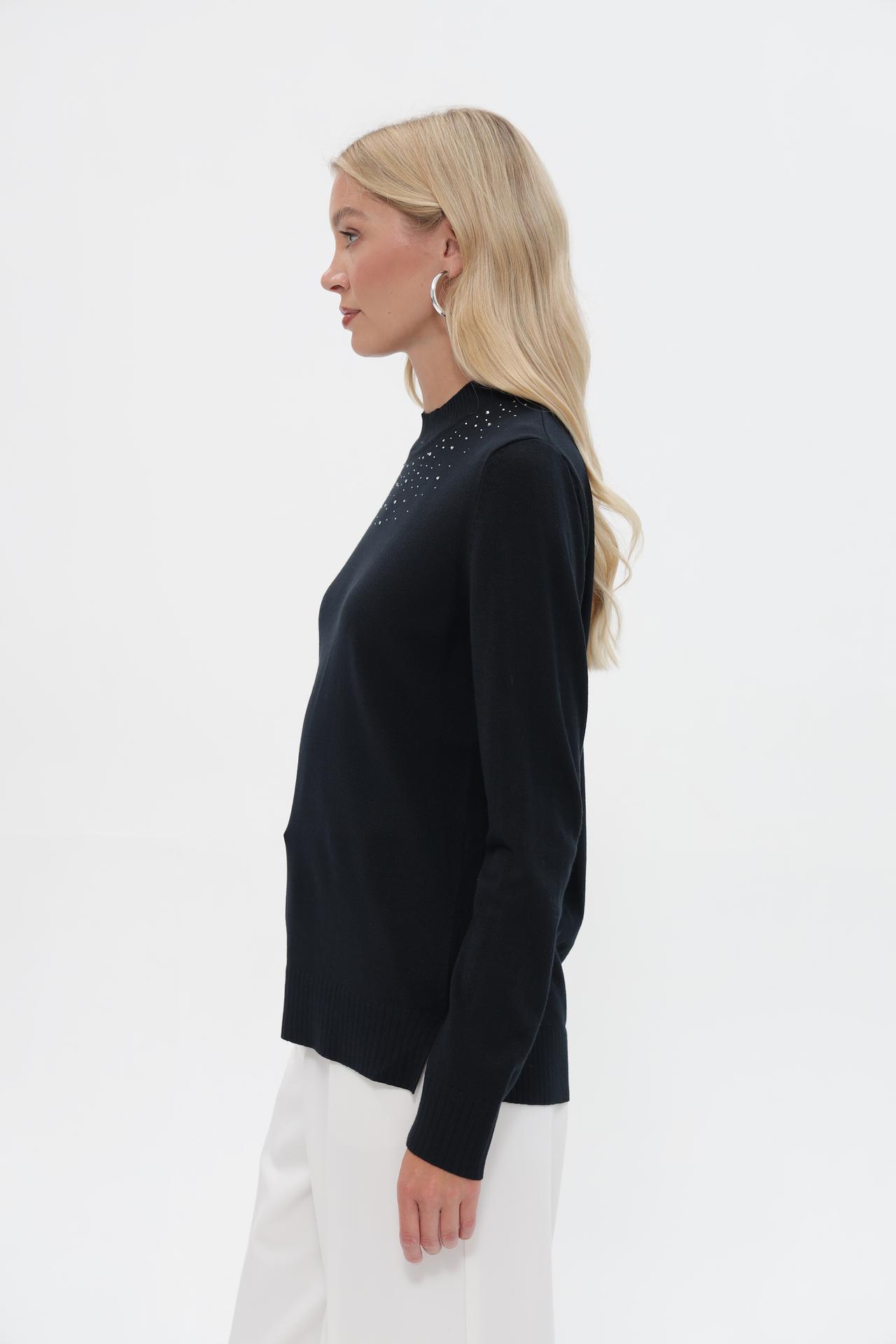 - Универсальность: Чёрный цвет и лаконичный крой позволяют сочетать пуловер с юбками, брюками и джинсами, создавая как деловые, так и расслабленные наряды. Этот пуловер — идеальное дополнение к вашему стилю.