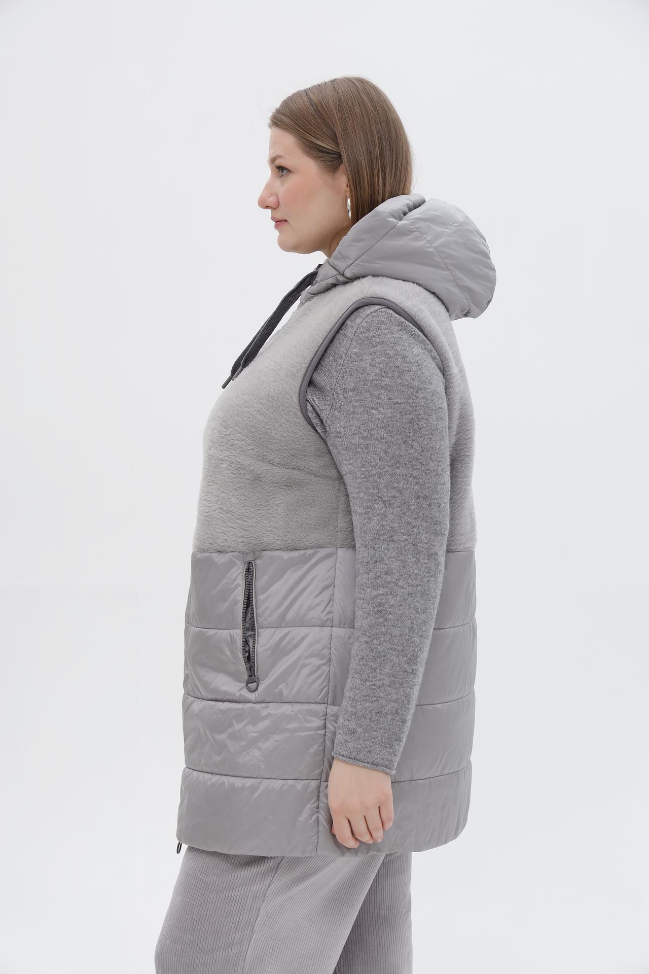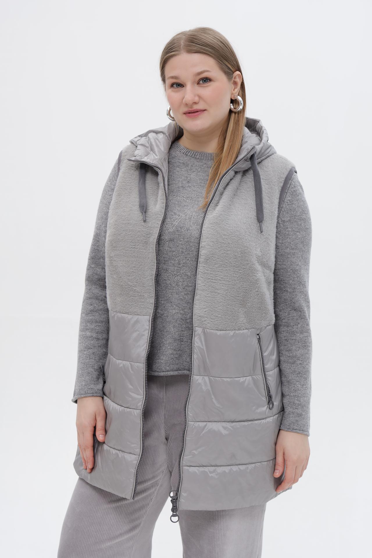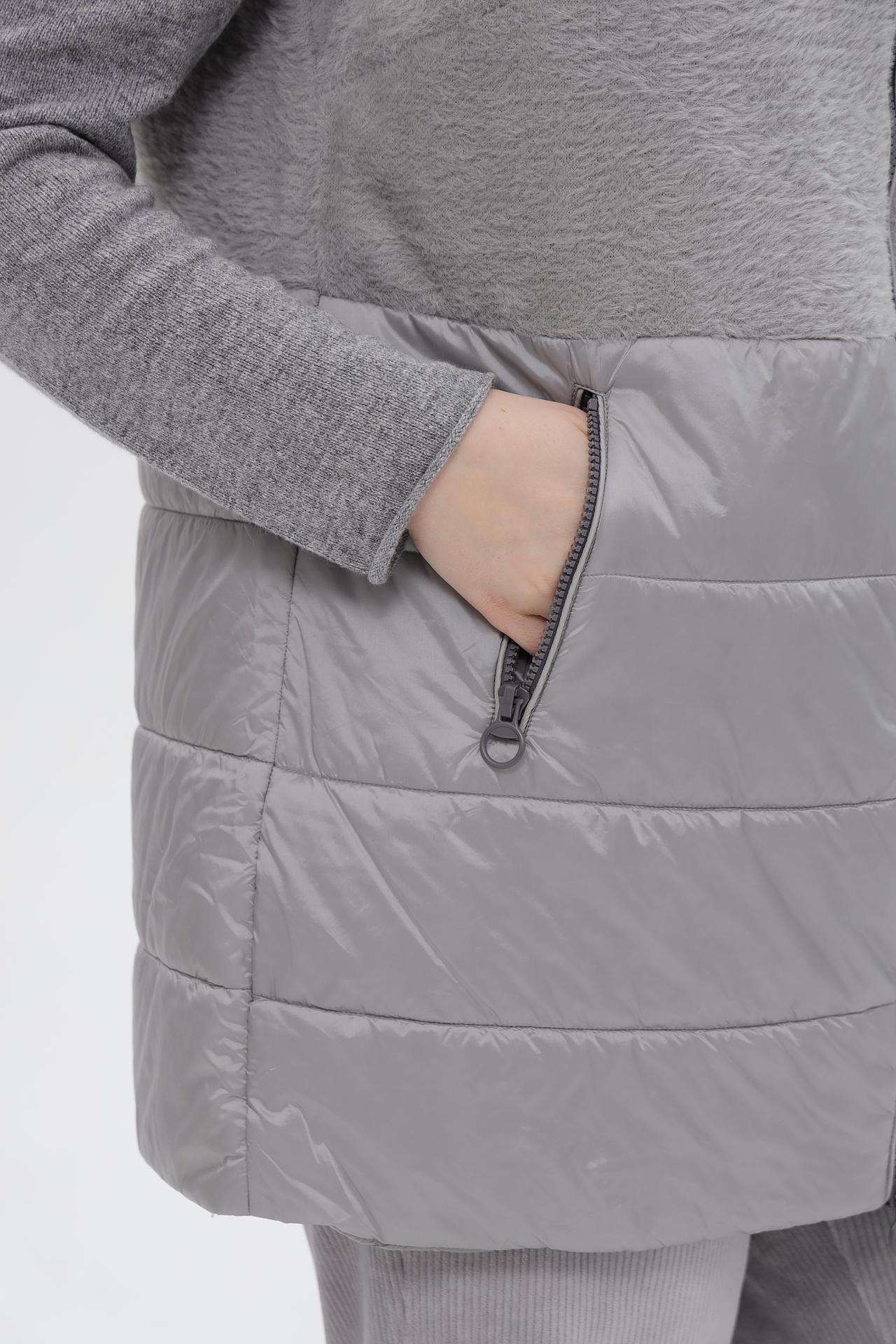 Жилет сочетает в себе два типа материалов: верхняя часть выполнена из мягкой ворсистой ткани, а нижняя — из гладкого стеганого полиамида, что придает изделию оригинальность и дополнительный комфорт.