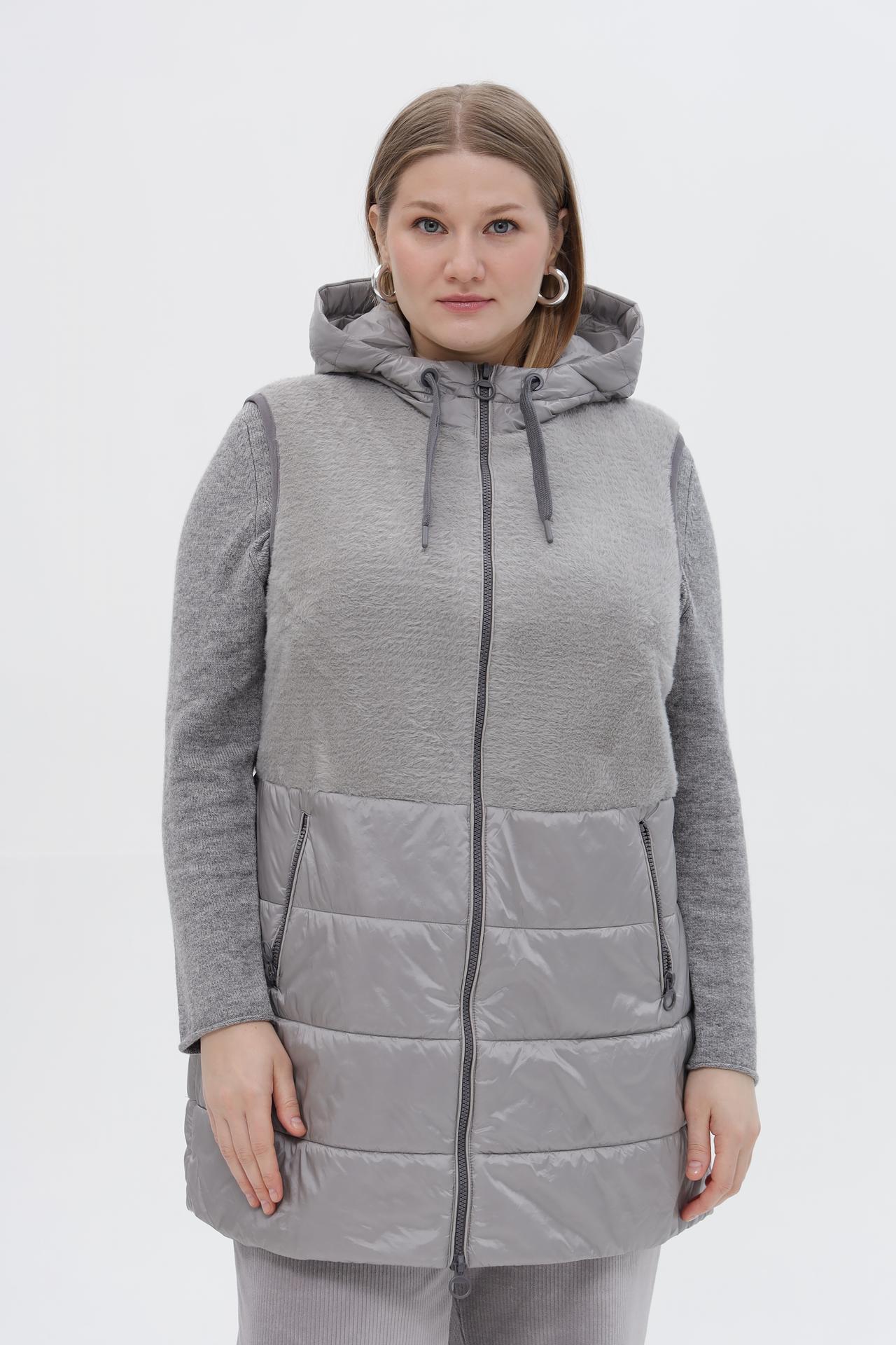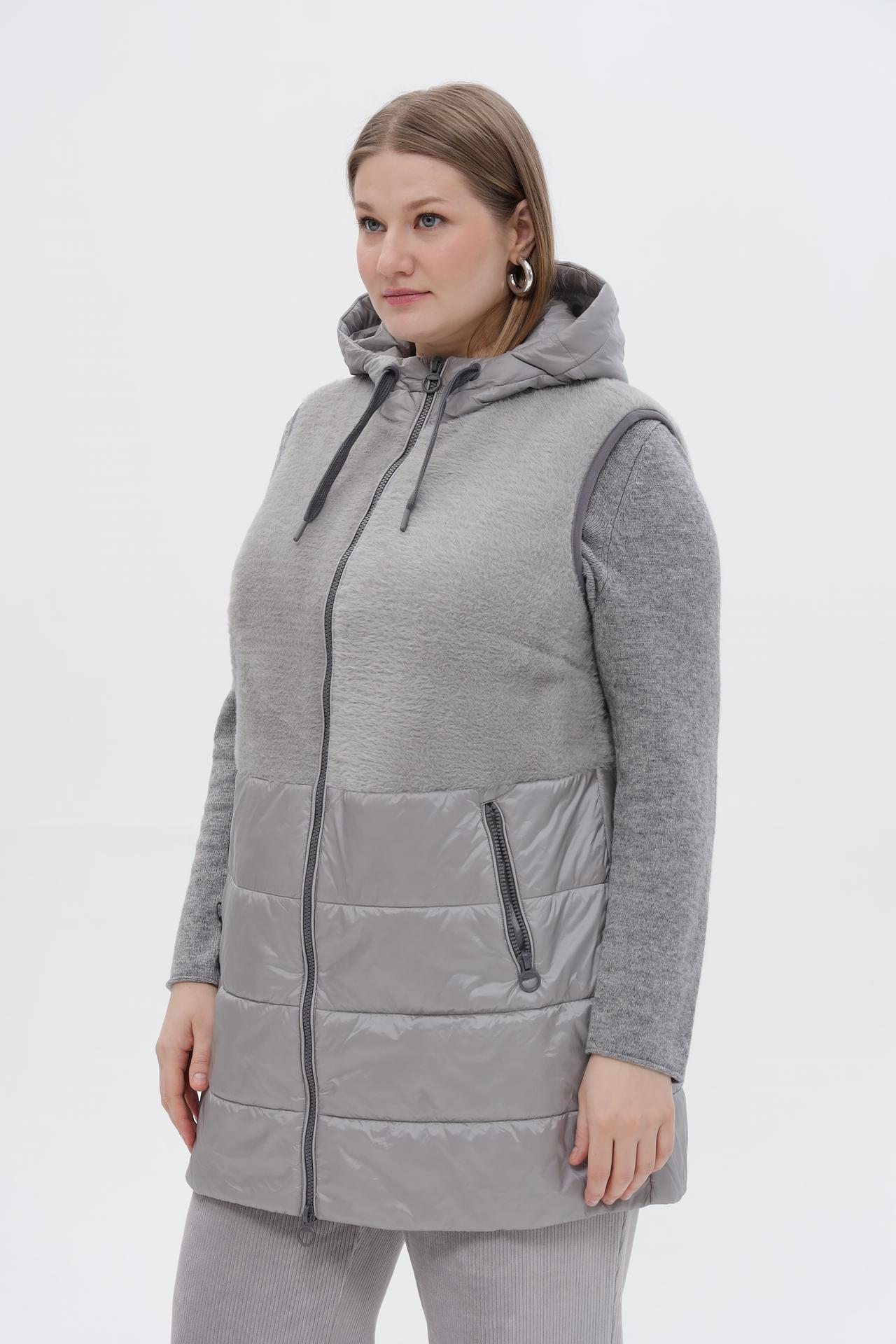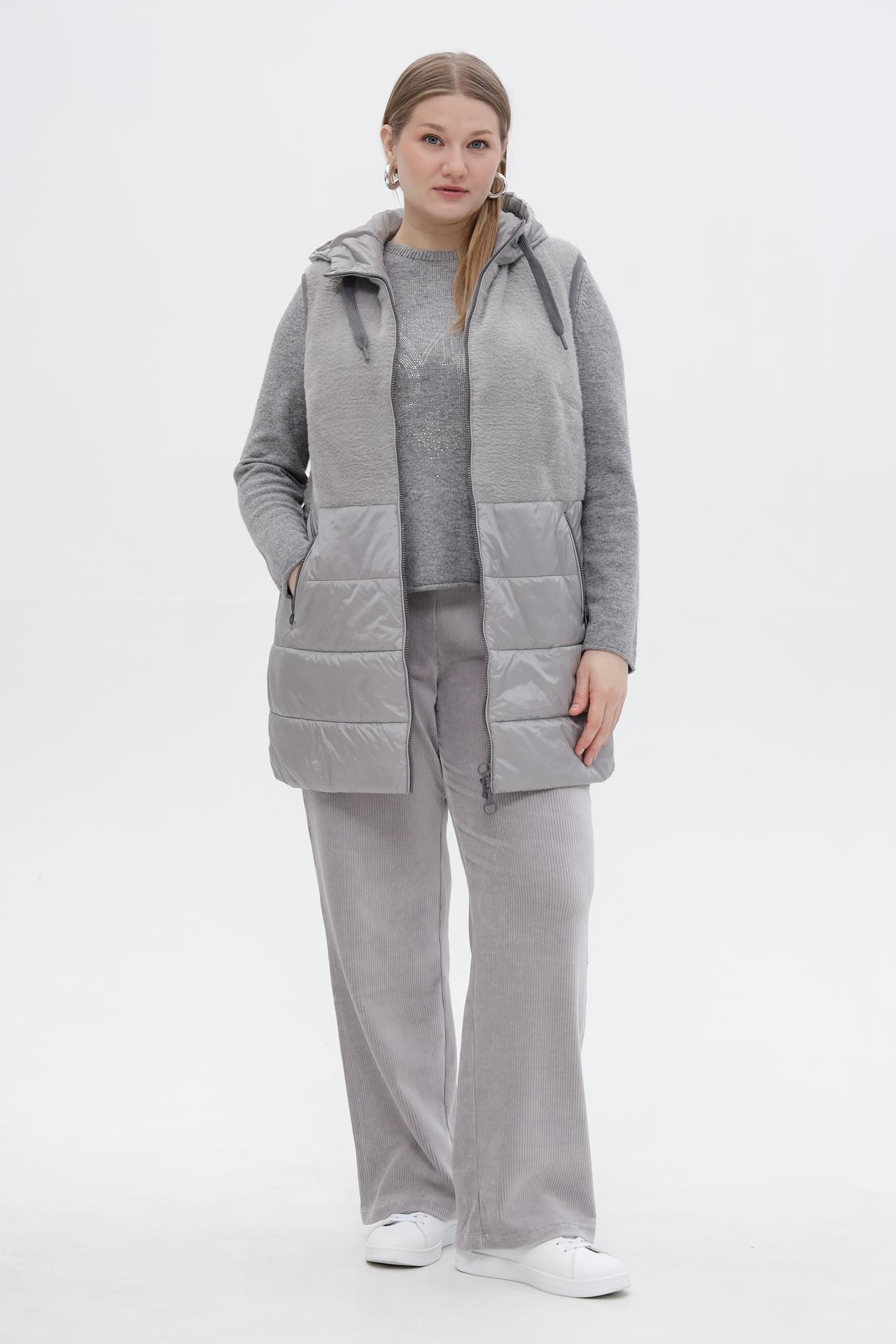 Жилет сочетает в себе два типа материалов: верхняя часть выполнена из мягкой ворсистой ткани, а нижняя — из гладкого стеганого полиамида, что придает изделию оригинальность и дополнительный комфорт.