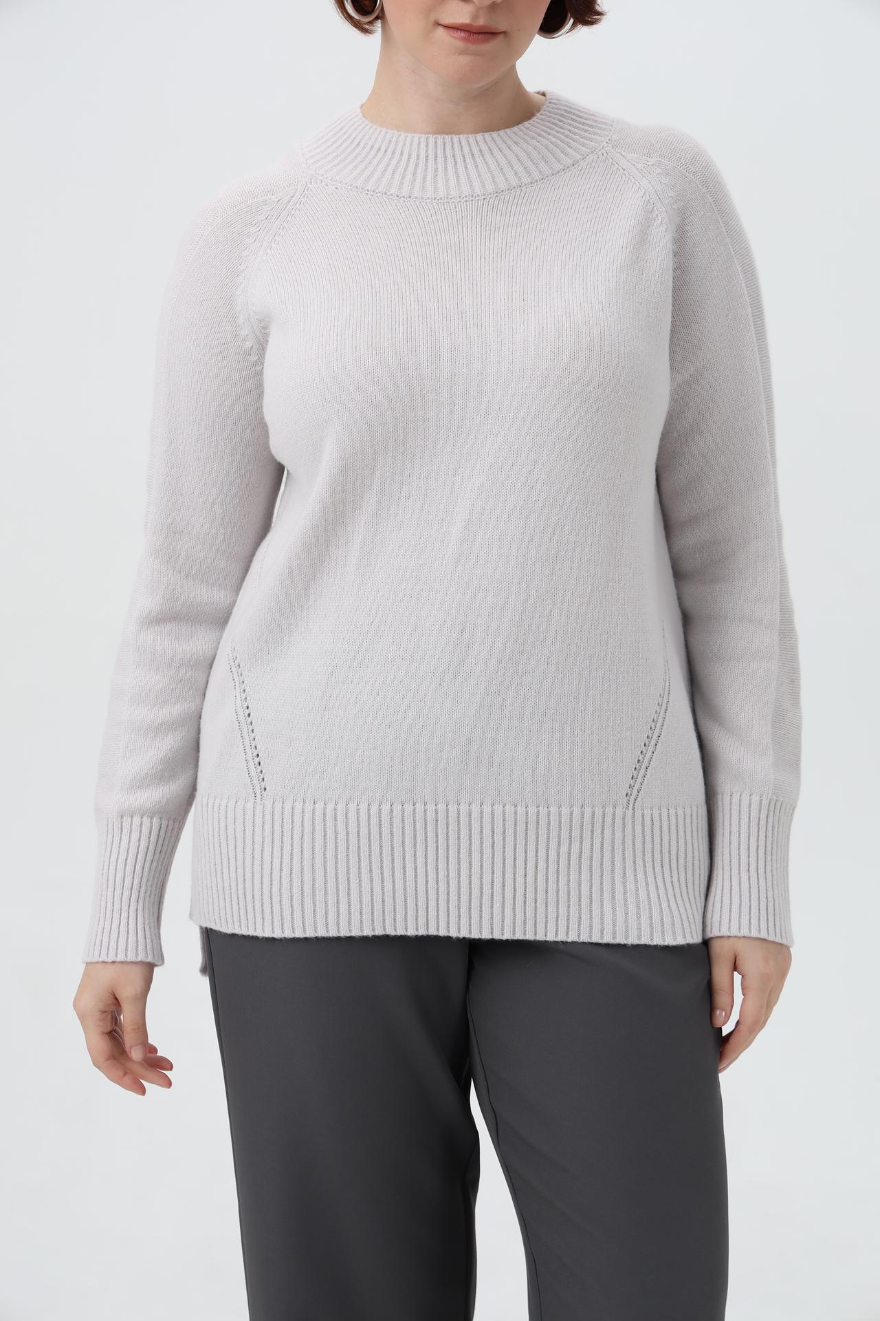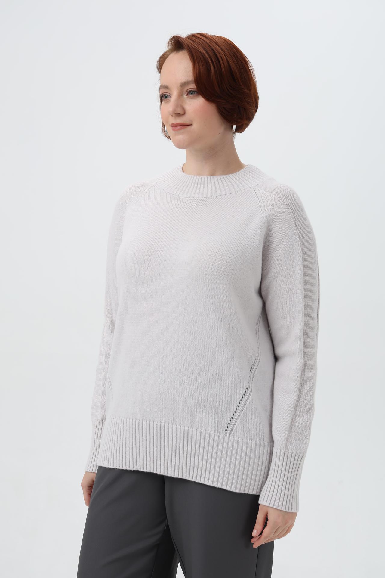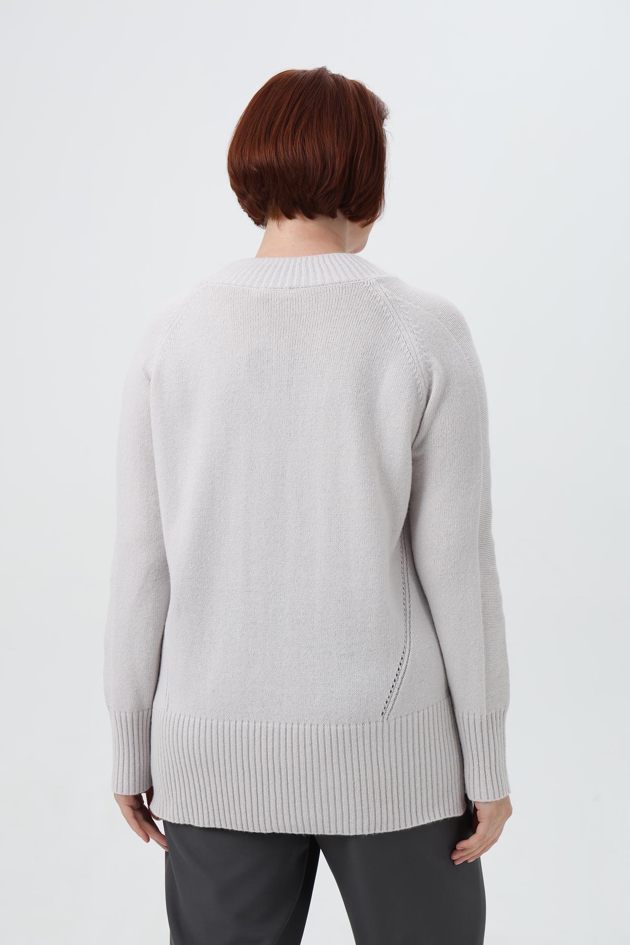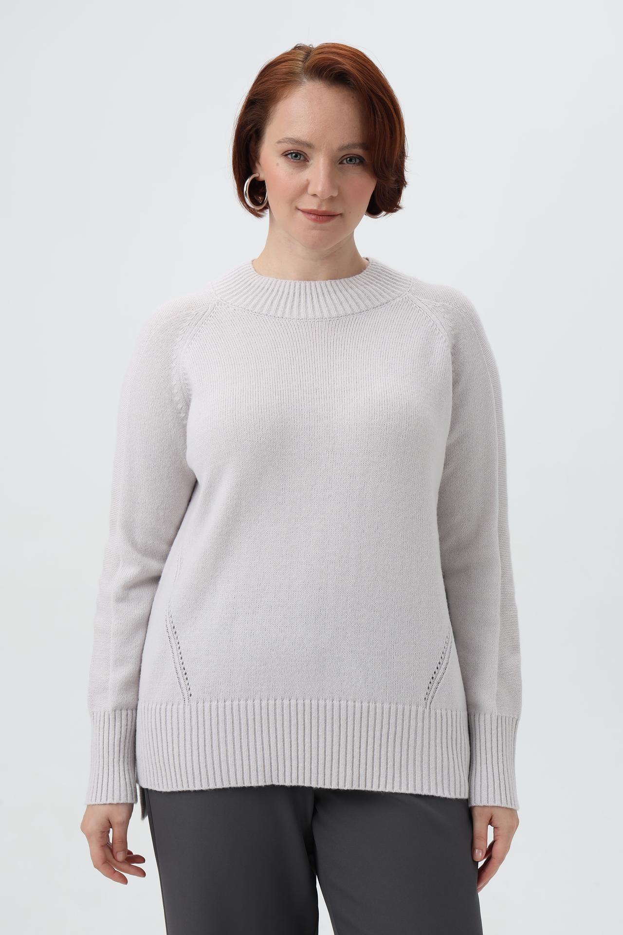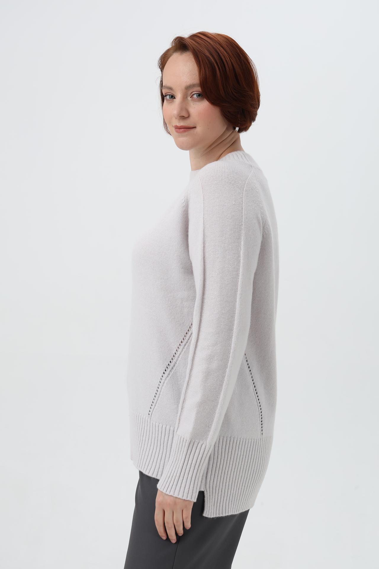 - Детали: По бокам пуловера расположены декоративные вставки с небольшими перфорированными узорами, которые добавляют изделию оригинальности и воздушности.