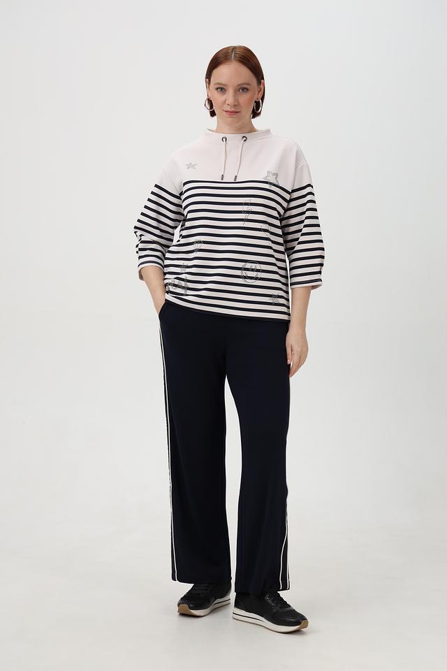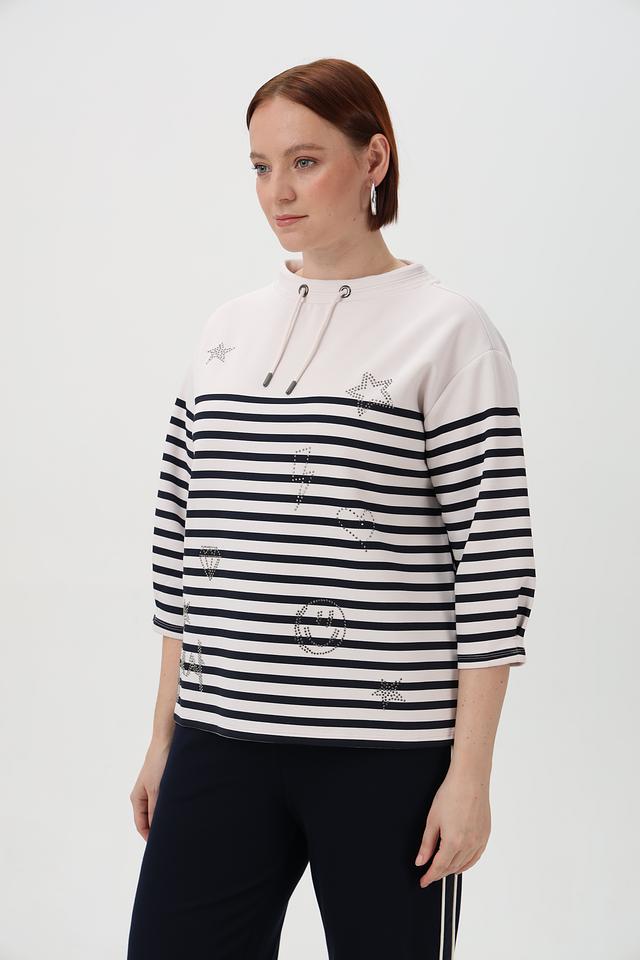 Этот пуловер от Barbara Lebek – идеальный выбор для тех, кто ценит комфорт и стиль. Выполнен в классической бело-синей полоску, украшен аппликациями в виде звезд, молний и смайликов, инкрустированными стразами. Модель имеет удобный круглый вырез горловины, дополненный шнурками на капюшоне.