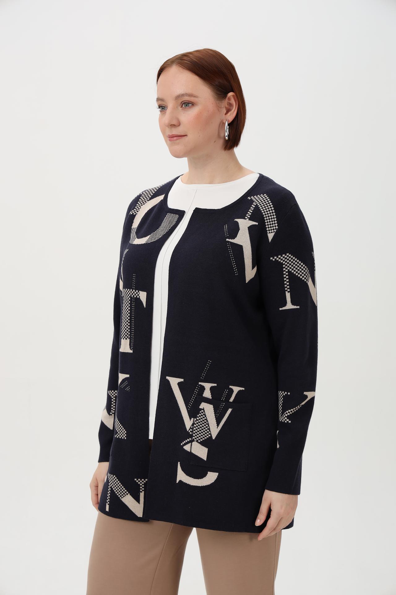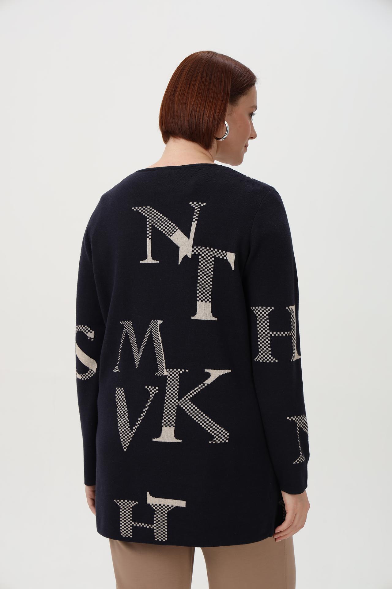 - Принт: Яркий и выразительный принт из букв в контрастных тонах (темно-синий и бежевый) делает этот жакет особенно привлекательным. Он добавляет образу динамики и подчеркивает вашу индивидуальность.