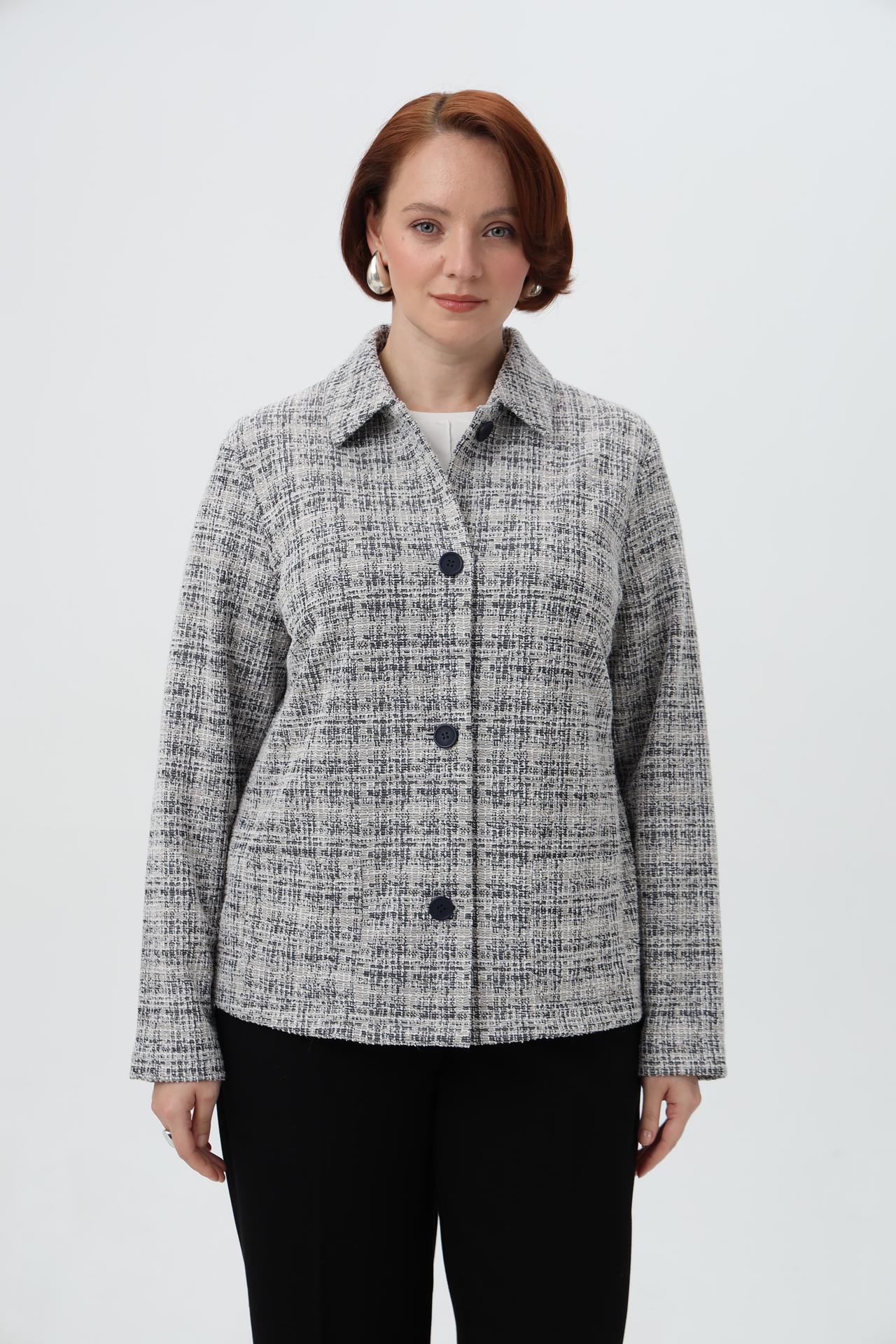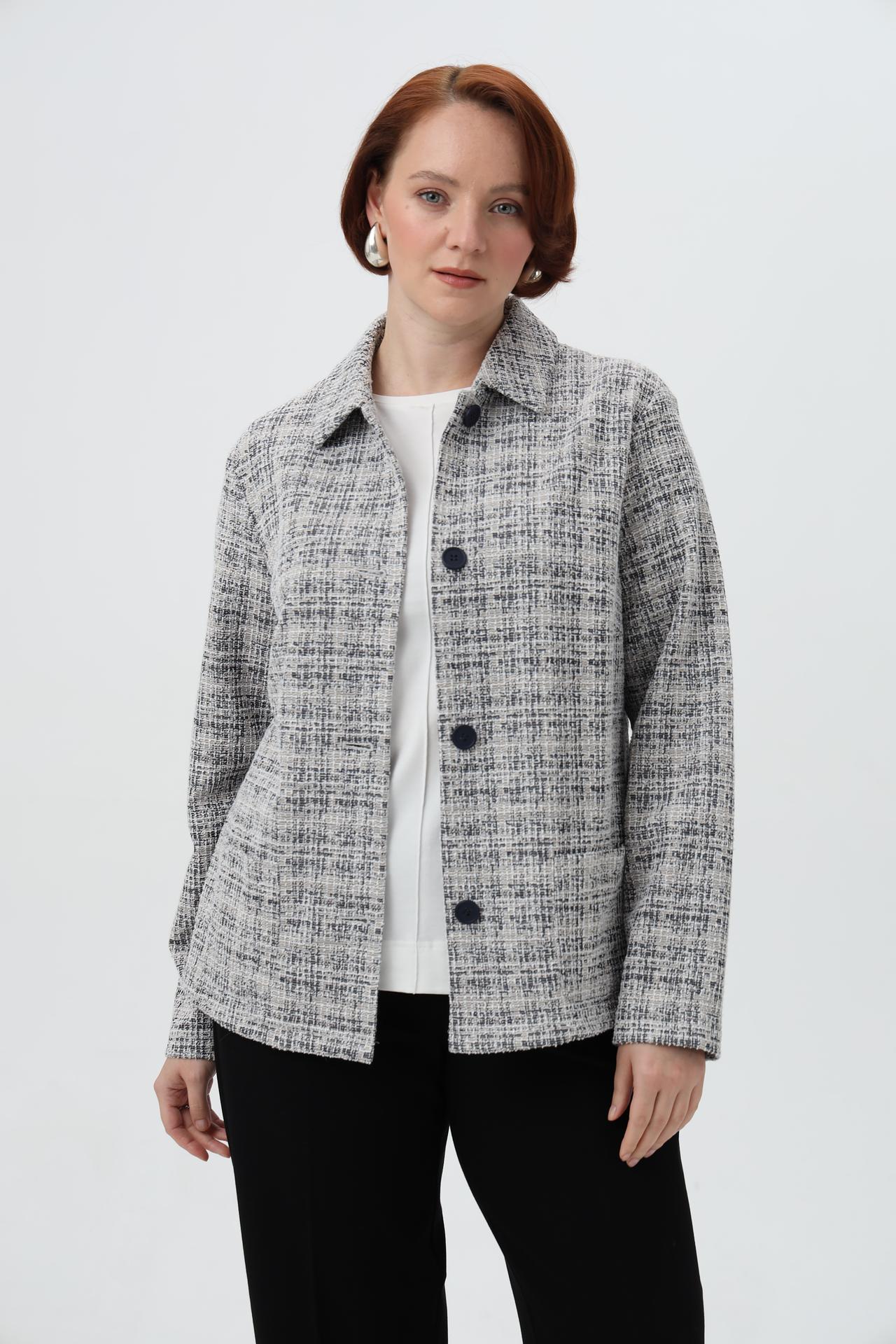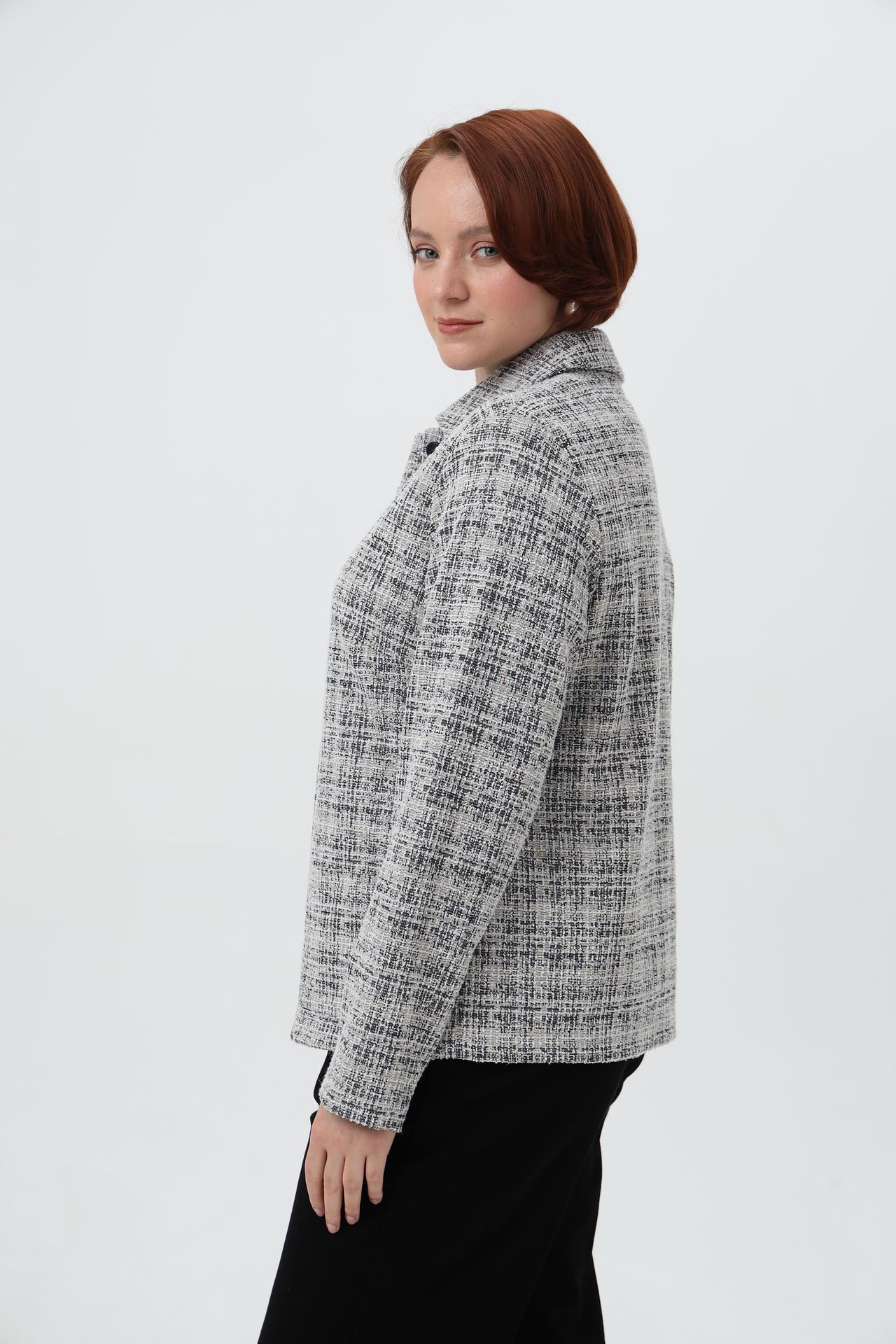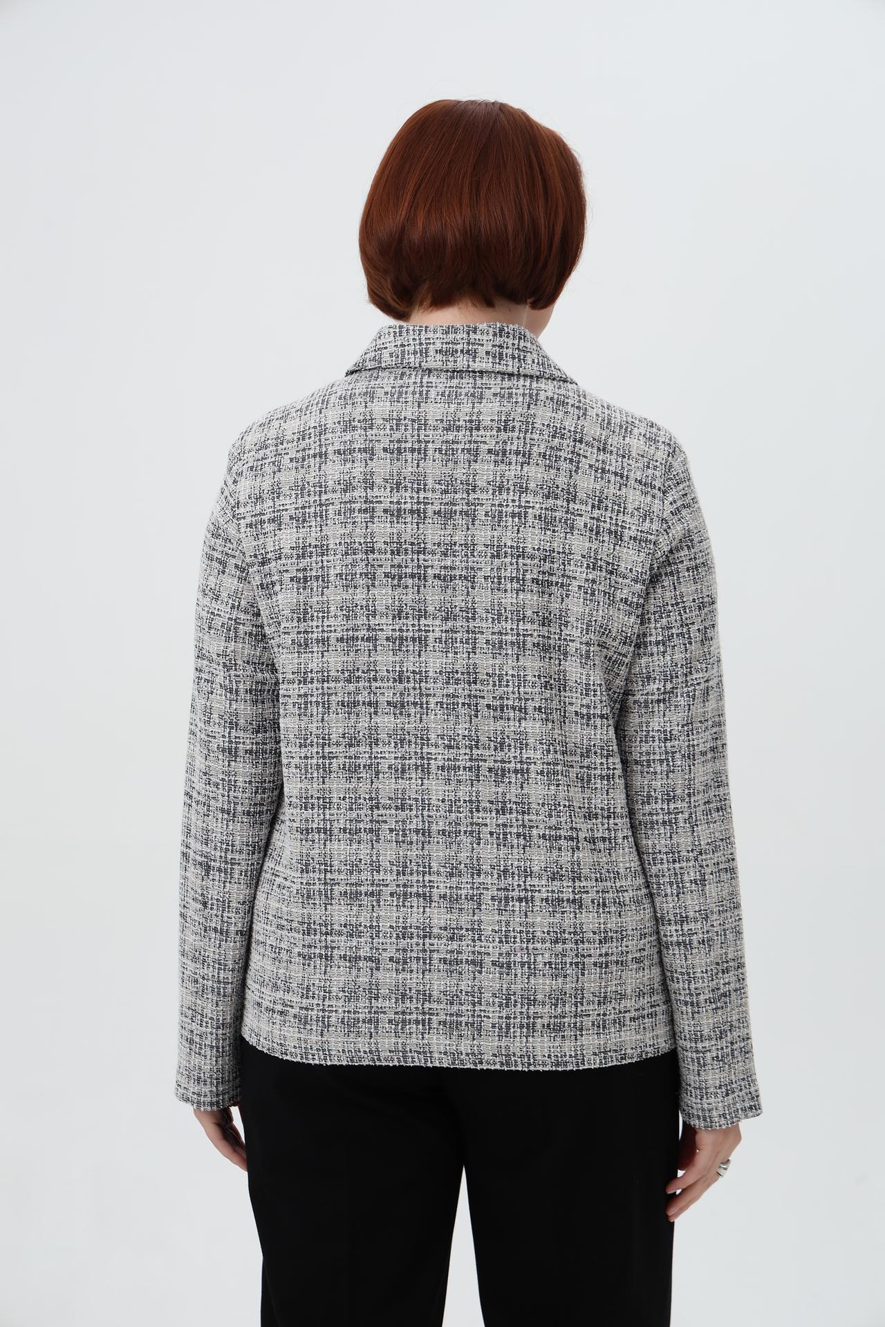 - Дизайн: Классический воротник, прямой крой и застежка на пуговицах придают жакету элегантность. Текстурная ткань в серо-синюю клетку выглядит актуально и стильно.