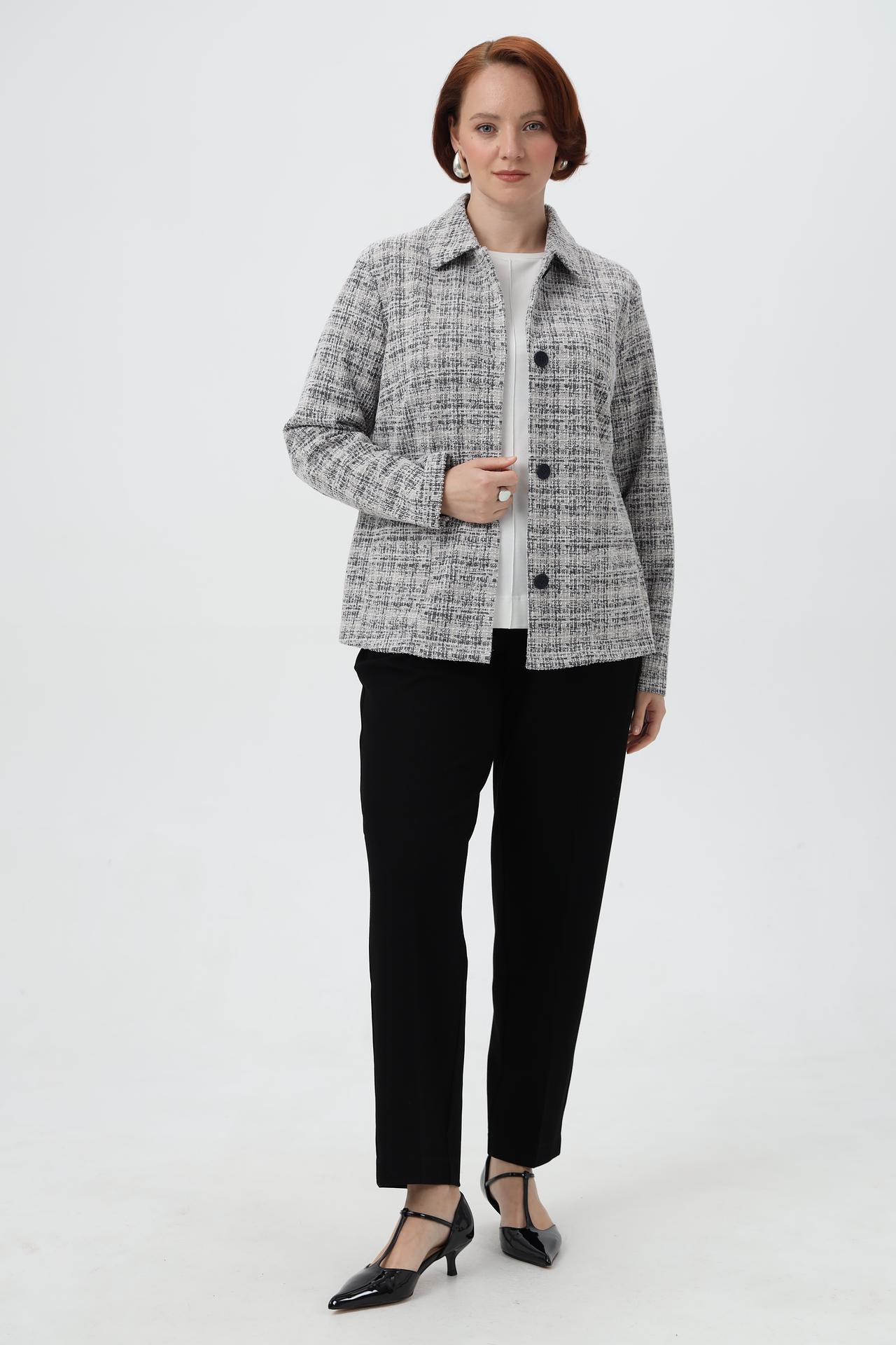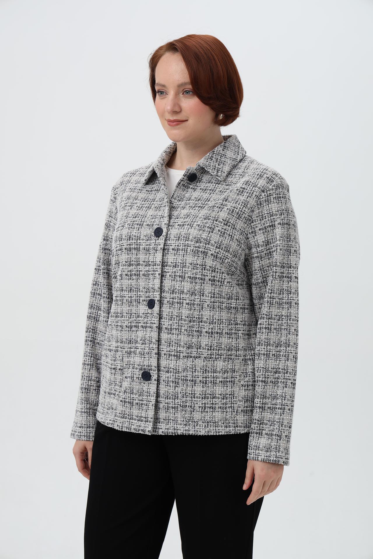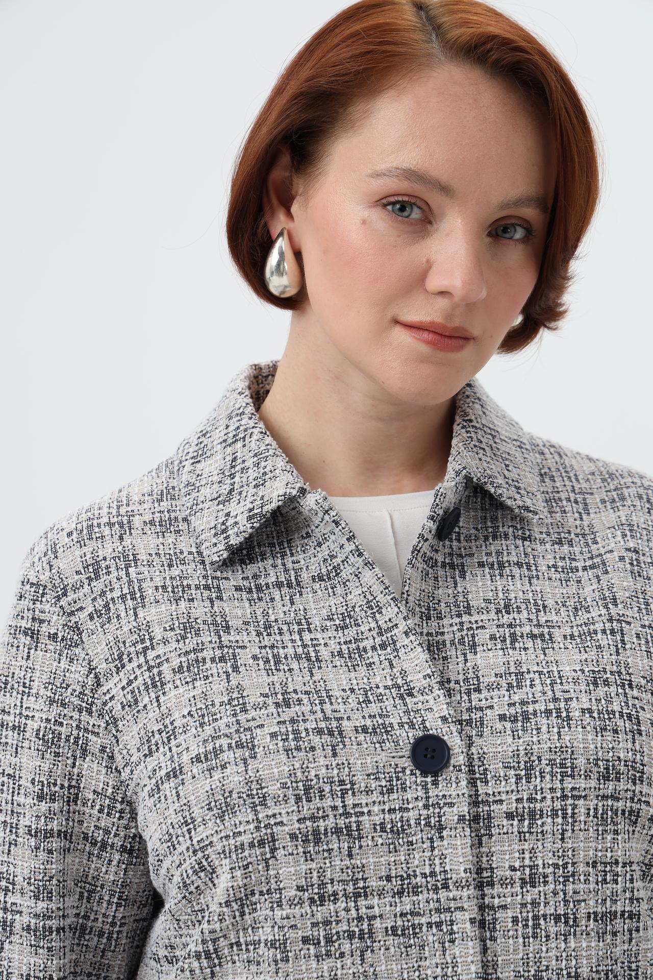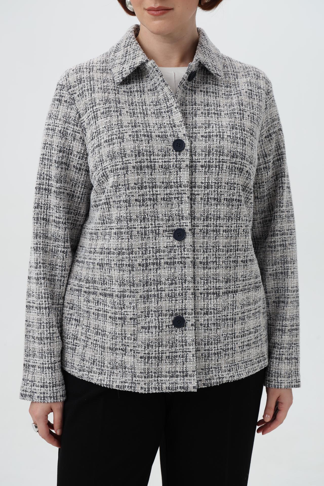 - Дизайн: Классический воротник, прямой крой и застежка на пуговицах придают жакету элегантность. Текстурная ткань в серо-синюю клетку выглядит актуально и стильно.