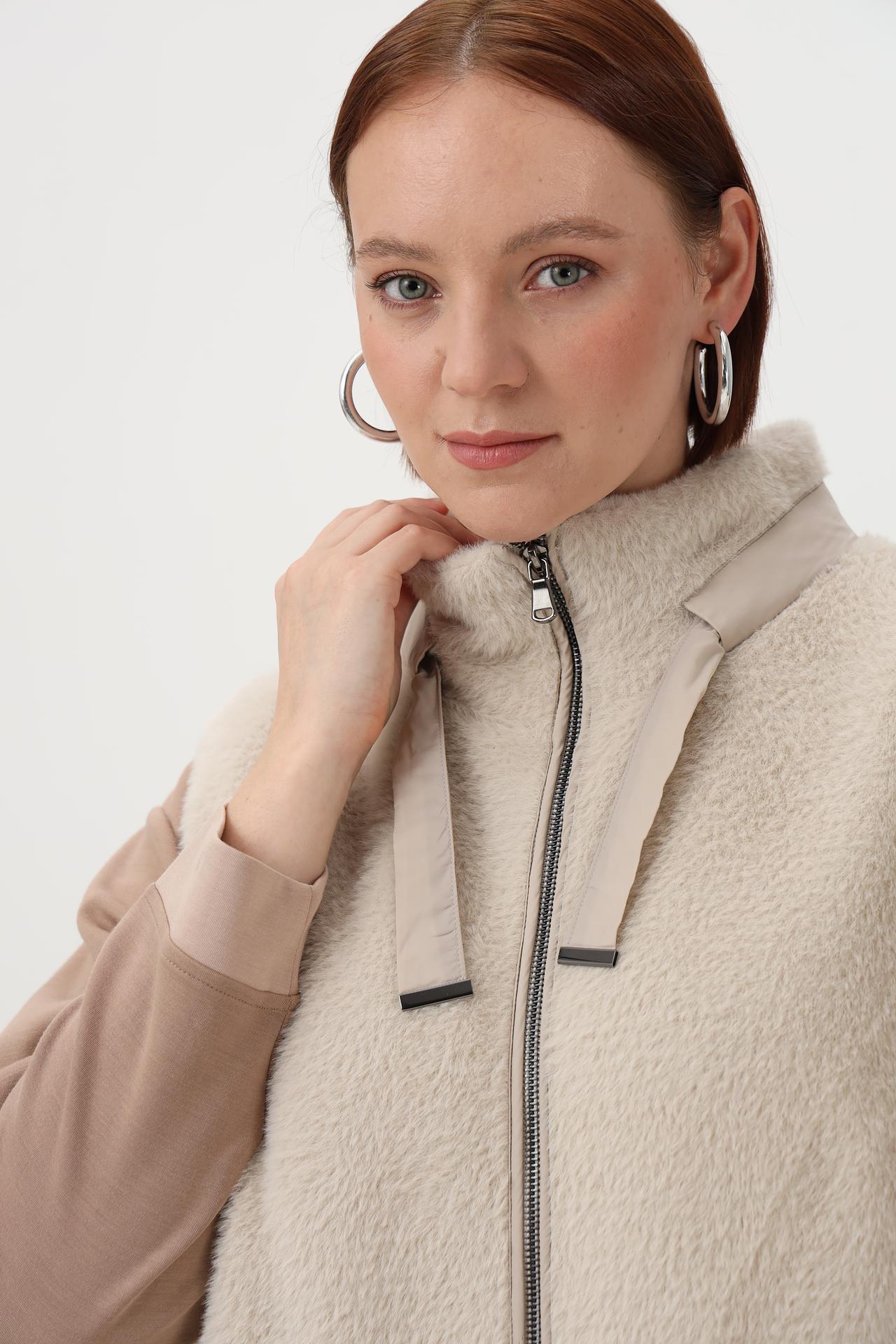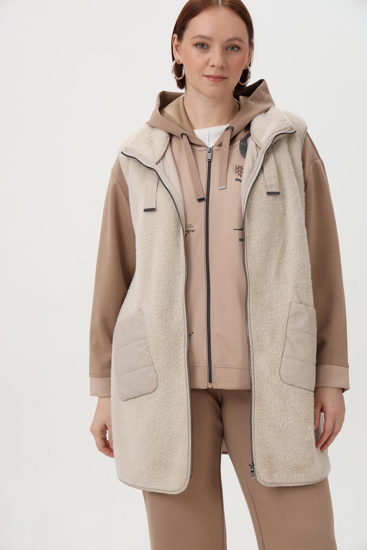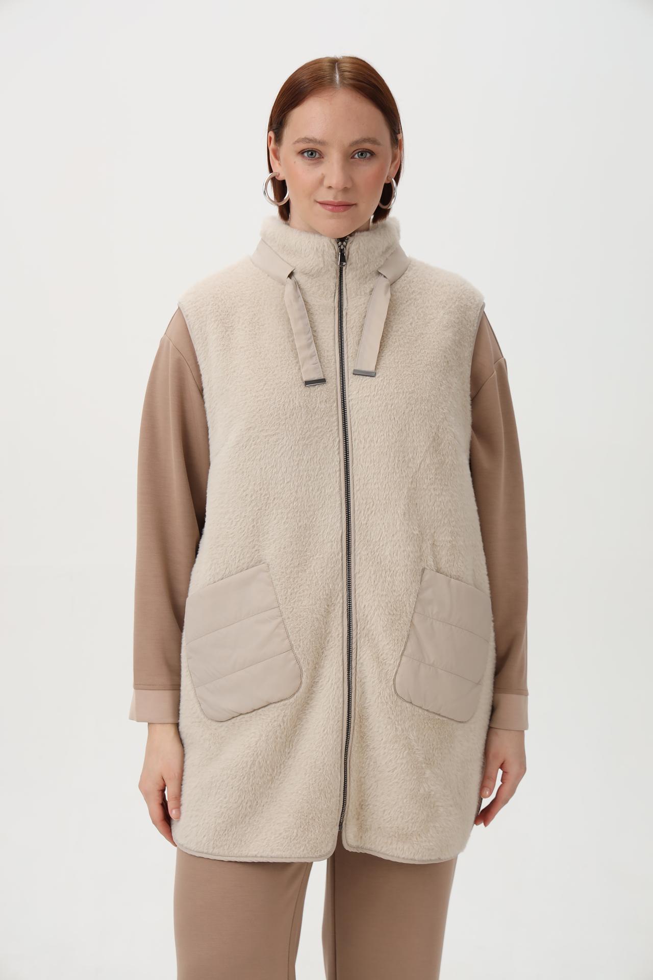 Стильный и уютный женский жилет от Lebek — идеальный выбор для создания многослойных образов в прохладную погоду. Модель выполнена в классическом бежевом цвете и отличается универсальным дизайном, который легко впишется в ваш гардероб. Верхняя часть жилета изготовлена из мягкой и приятной на ощупь ткани с ворсом, напоминающей овчину, а вставки на карманах выполнены из стеганого полиамида, добавляющего фактурности и практичности.