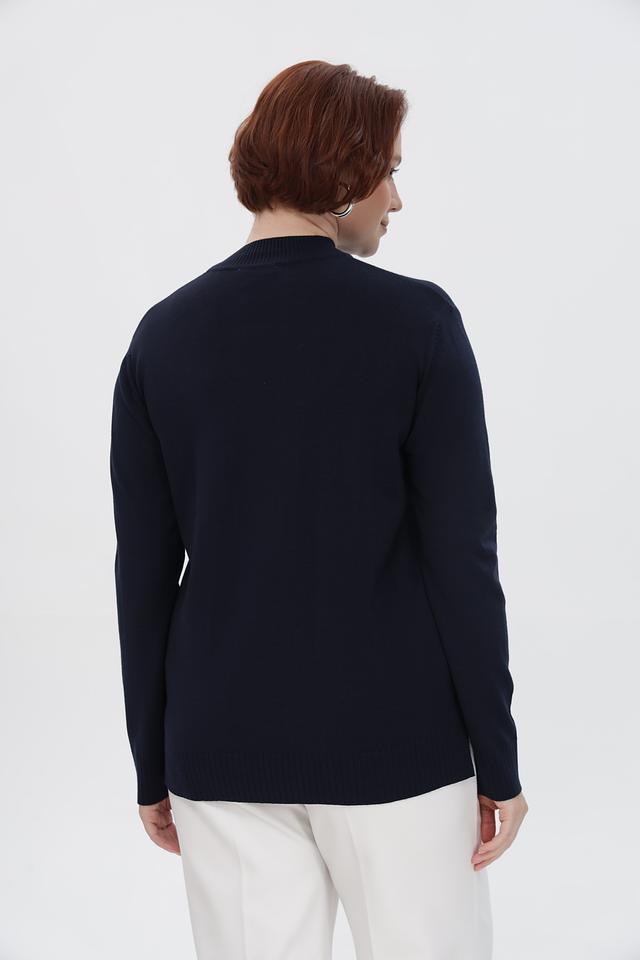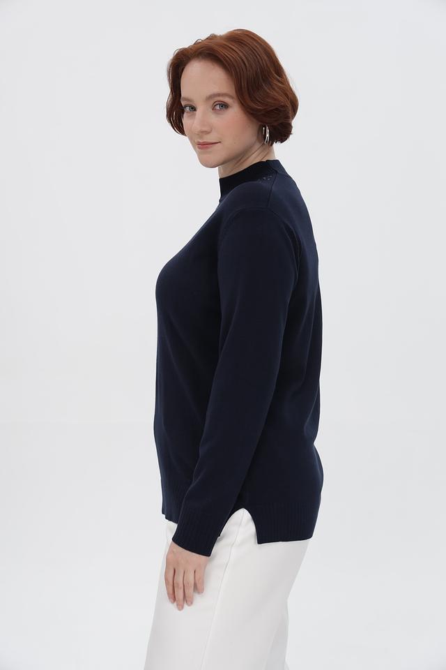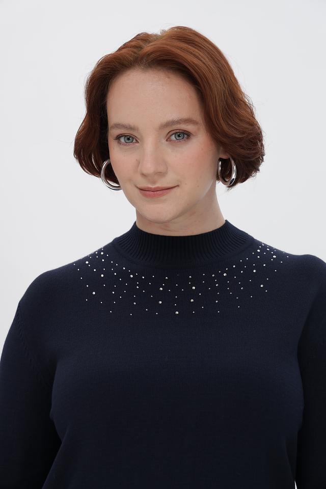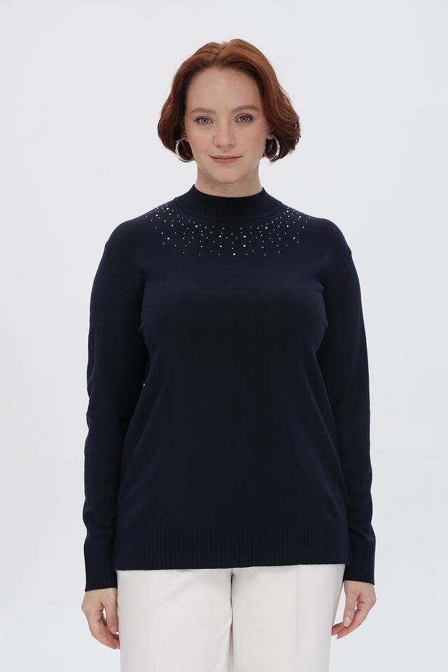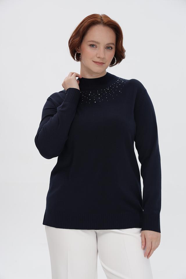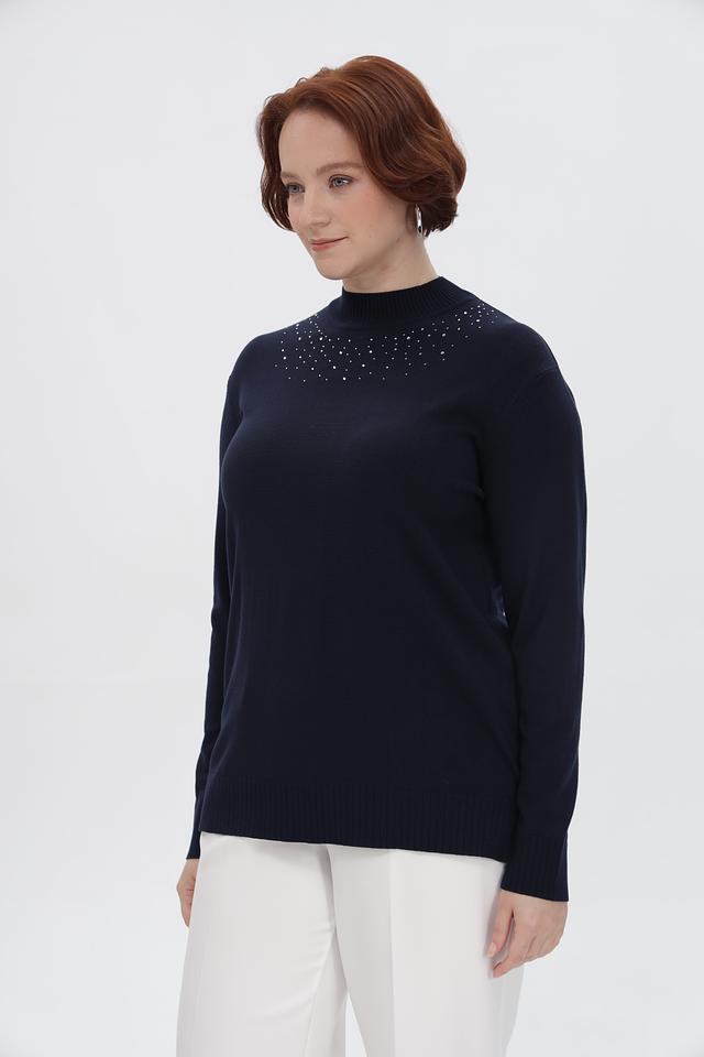 Особенность пуловера — декоративная отделка в виде небольших камней, расположенных в верхней части изделия. Эта деталь придает образу изысканность и делает пуловер подходящим для особых случаев.
