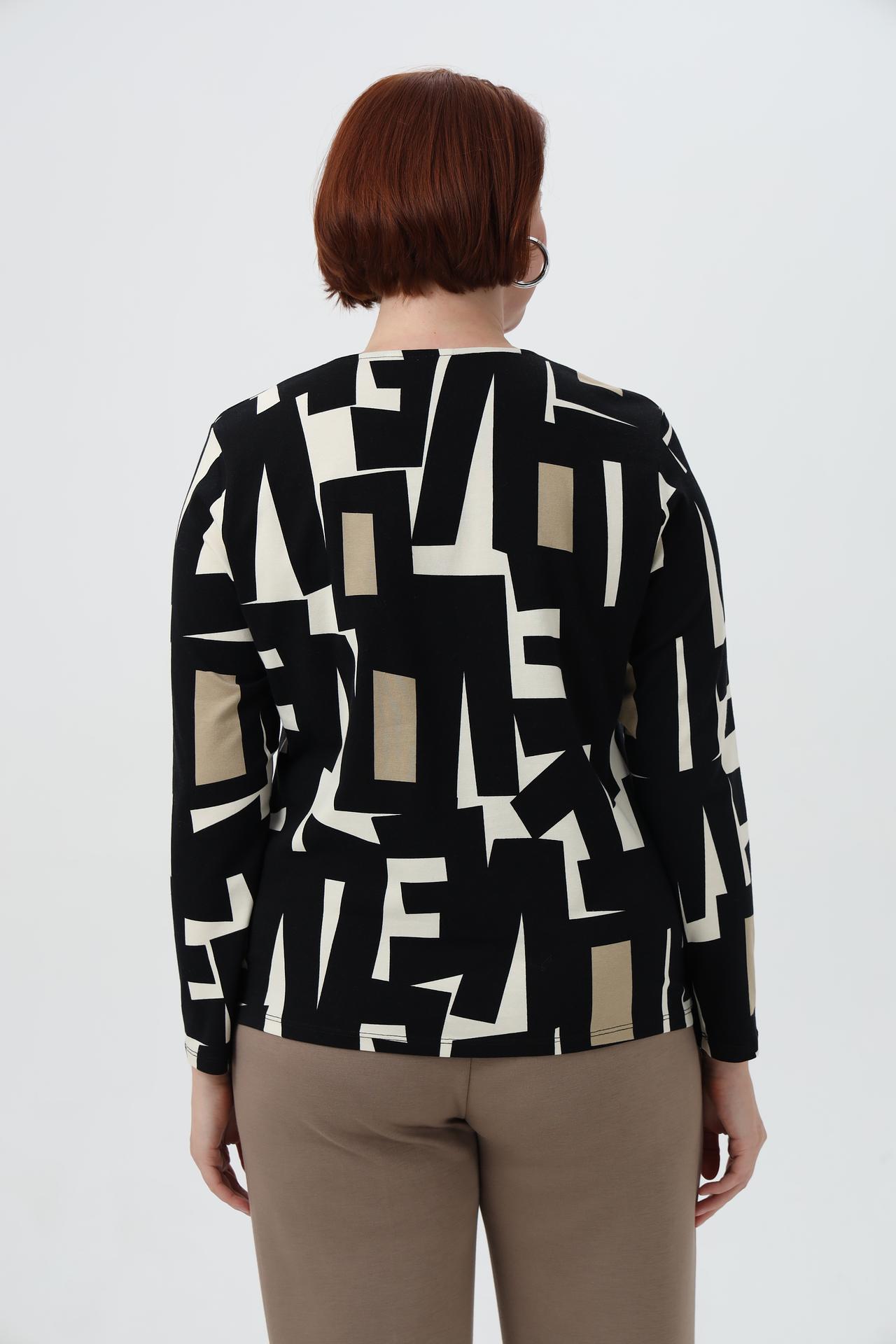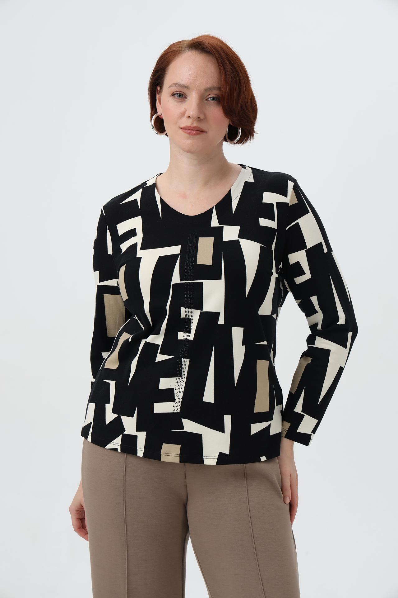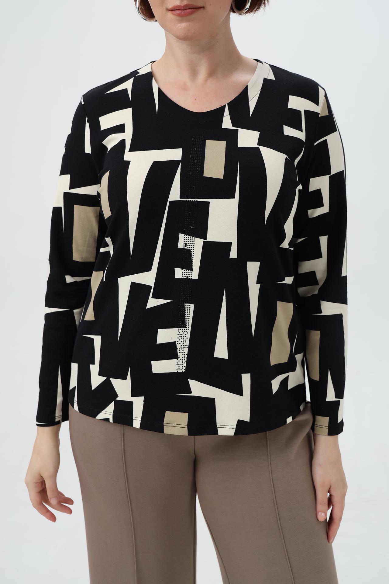 Футболка Lebek - это стильное и комфортное решение для вашего гардероба. Оригинальный геометрический принт в сочетании с деликатным декором из страз придаст образу изысканности. Модель с длинным рукавом и V-образным вырезом идеально подойдет для создания как повседневных, так и более элегантных образов. Высококачественная вискоза с добавлением эластана обеспечивает приятные тактильные ощущения и отличную посадку по фигуре.