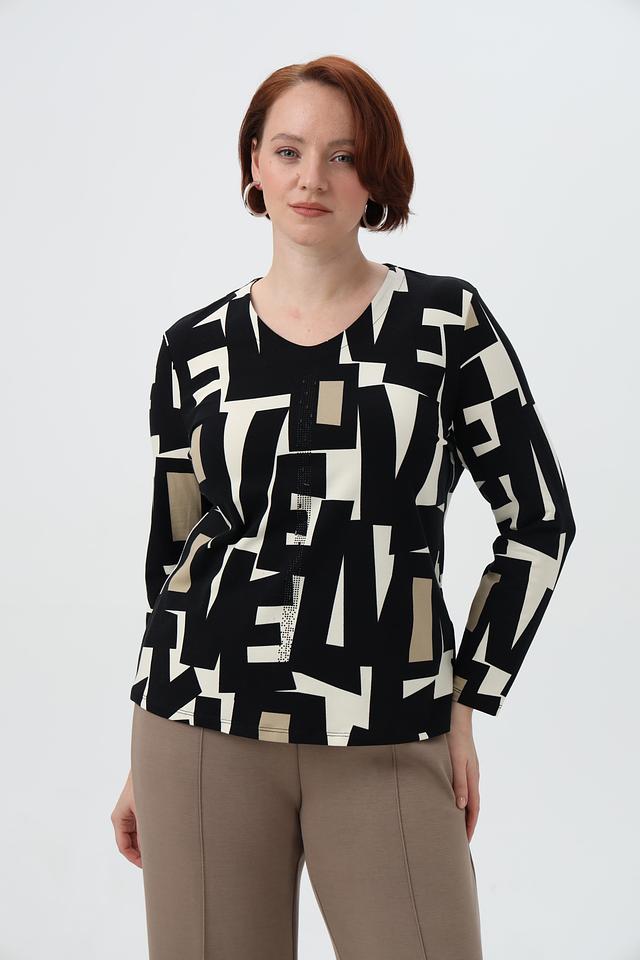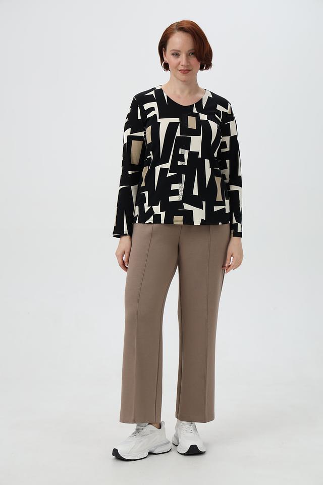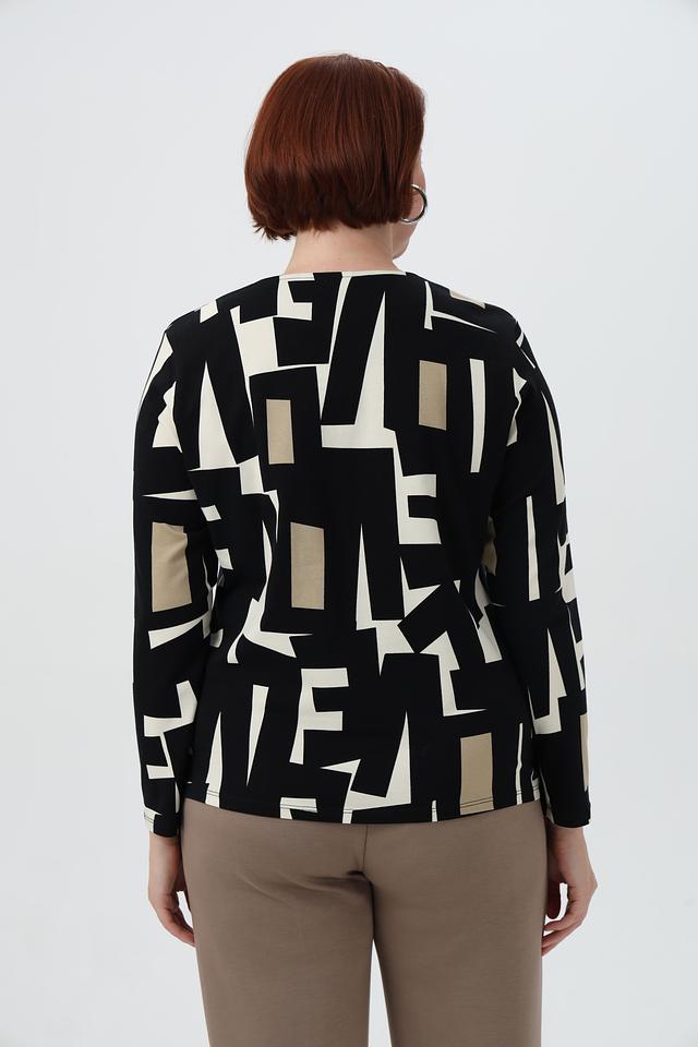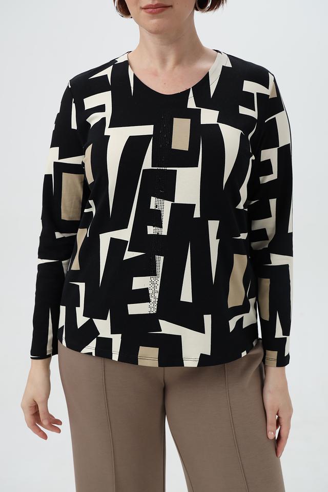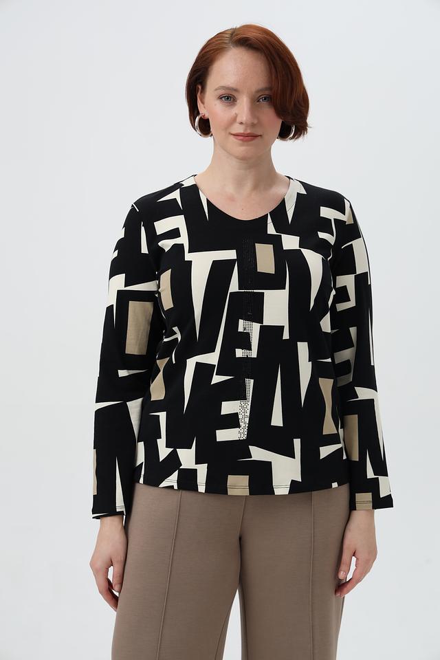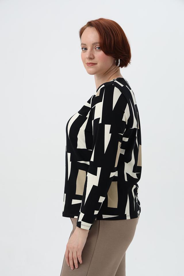 Особенность этой модели – оригинальный абстрактный принт в бежевых, чёрных и кремовых оттенках, который добавит образу индивидуальности и стиля. Лонгслив прекрасно сочетается с юбками, брюками и джинсами, позволяя создавать разнообразные образы для работы, отдыха или особых случаев.