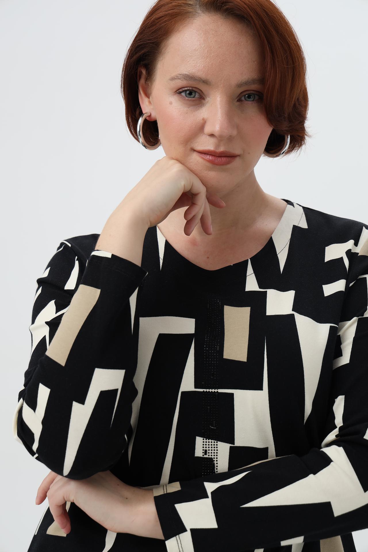 - Дизайн: Яркий геометрический принт в черно-бежевой гамме привлекает внимание. Вертикальная линия декора из страз по центру выреза визуально вытягивает силуэт, делая его более стройным.