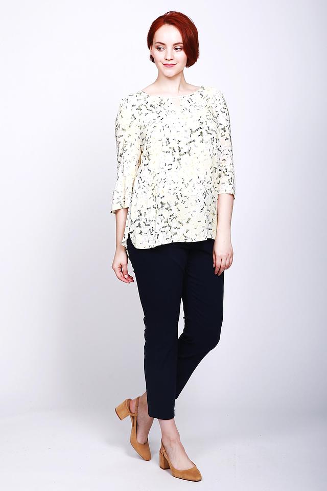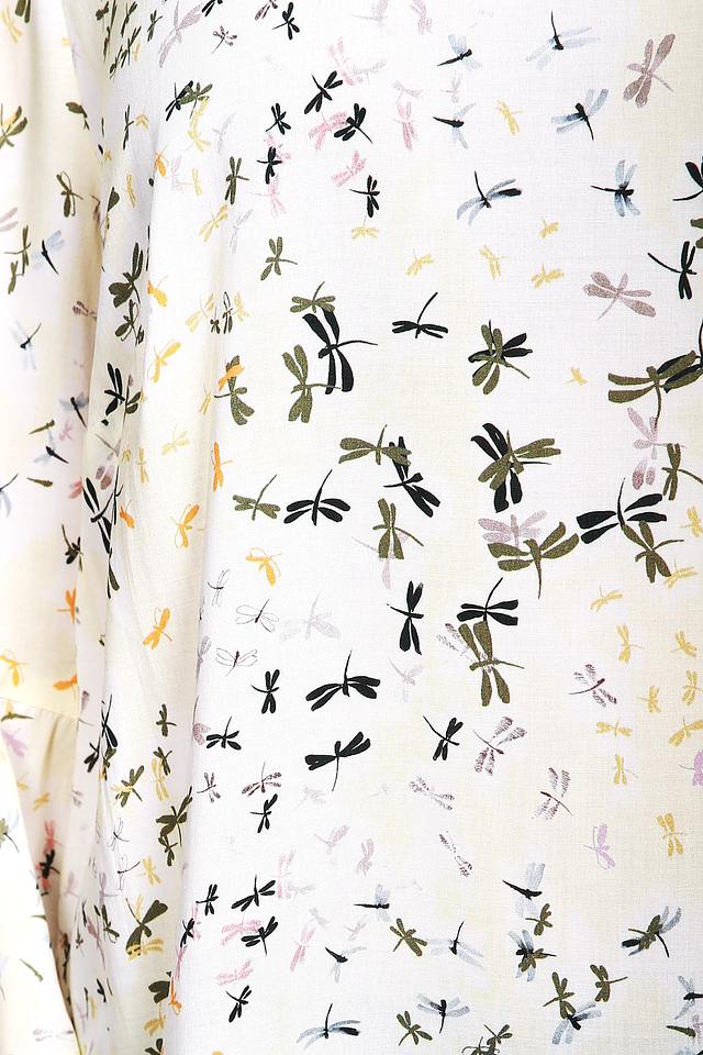 Нежный принт с разноцветными стрекозами на светлом фоне смотрится свежо и небанально. Такой узор легко сочетать с однотонными брюками, юбками или джинсами, создавая гармоничные комплекты.