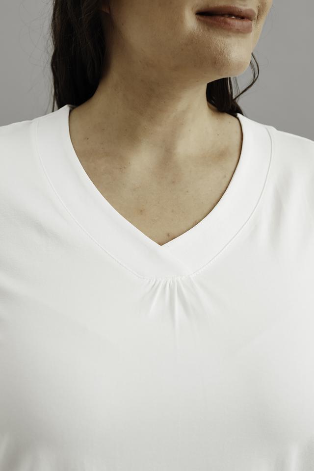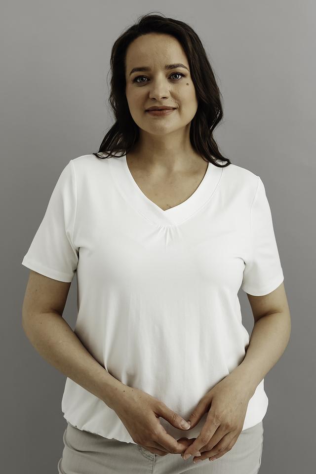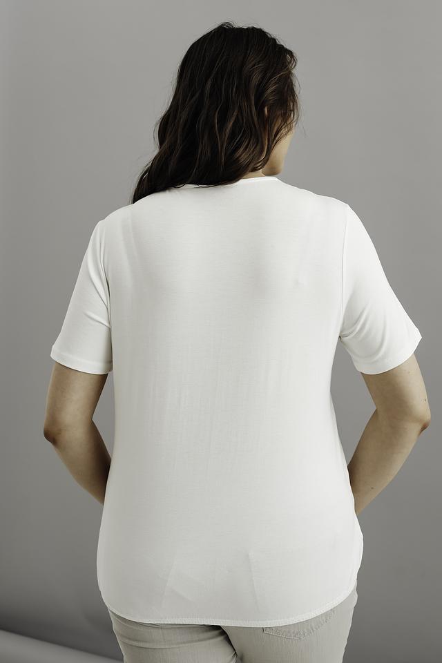 Модель имеет прямой крой и короткие рукава, что обеспечивает свободу движений и комфорт в жаркую погоду. V-образный вырез горловины украшен деликатной сборкой, придающей футболке женственность и изящество.