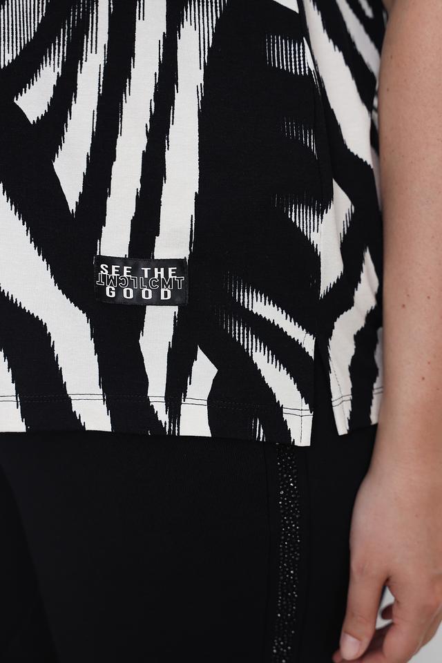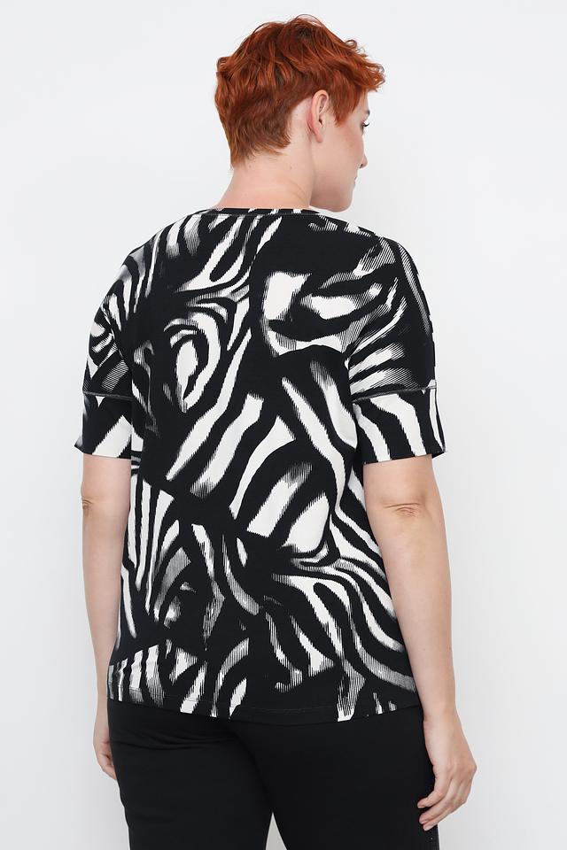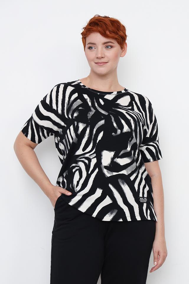 Основной цвет футболки – чёрный, украшенный ярким принтом в виде полос зебры. Принт выполнен в белом цвете, создавая контрастный и эффектный образ. Футболка имеет круглый вырез горловины и короткие рукава, что делает её идеальной для тёплой погоды.
