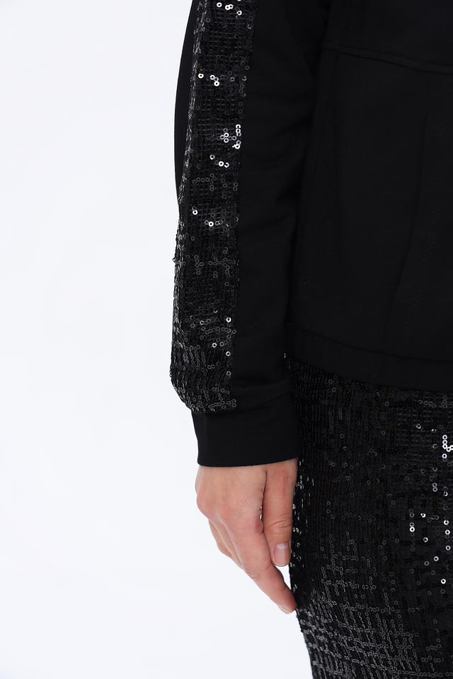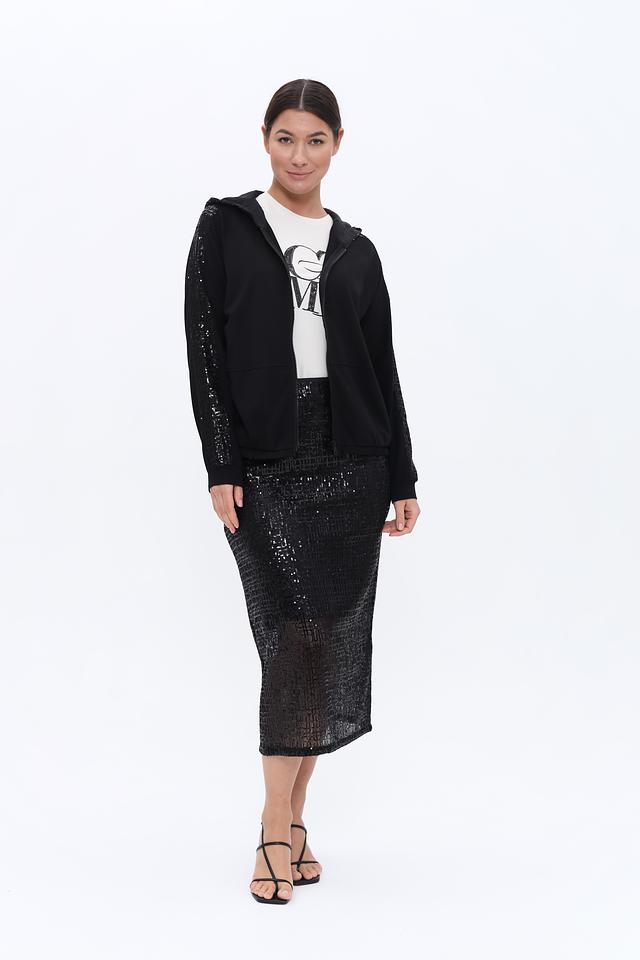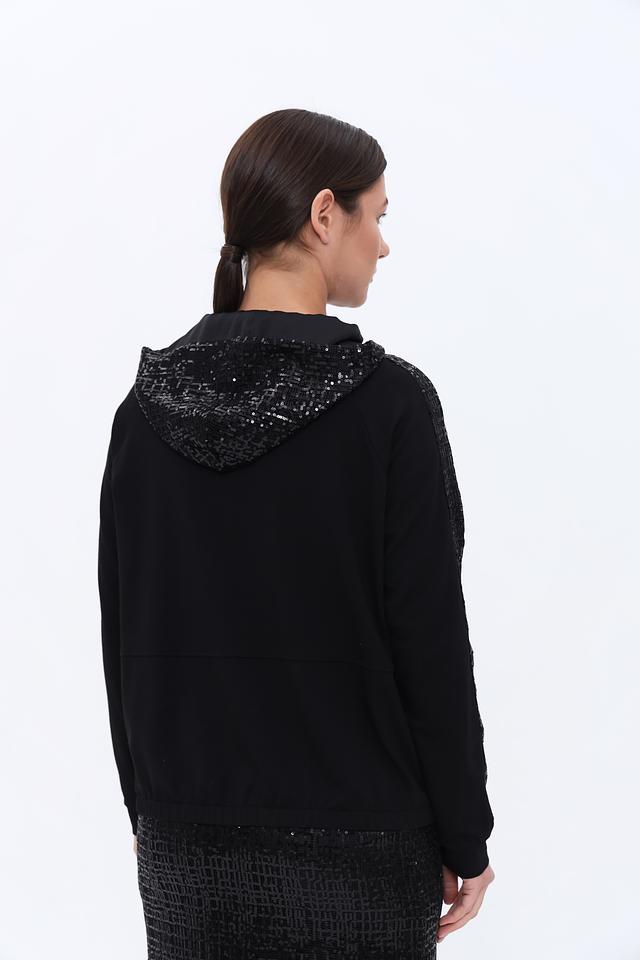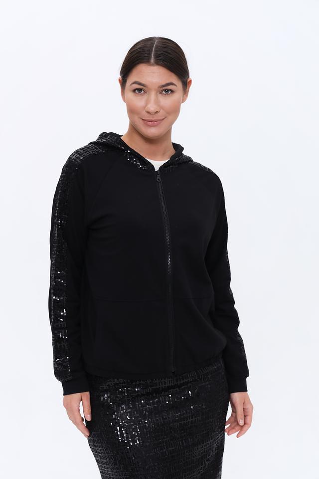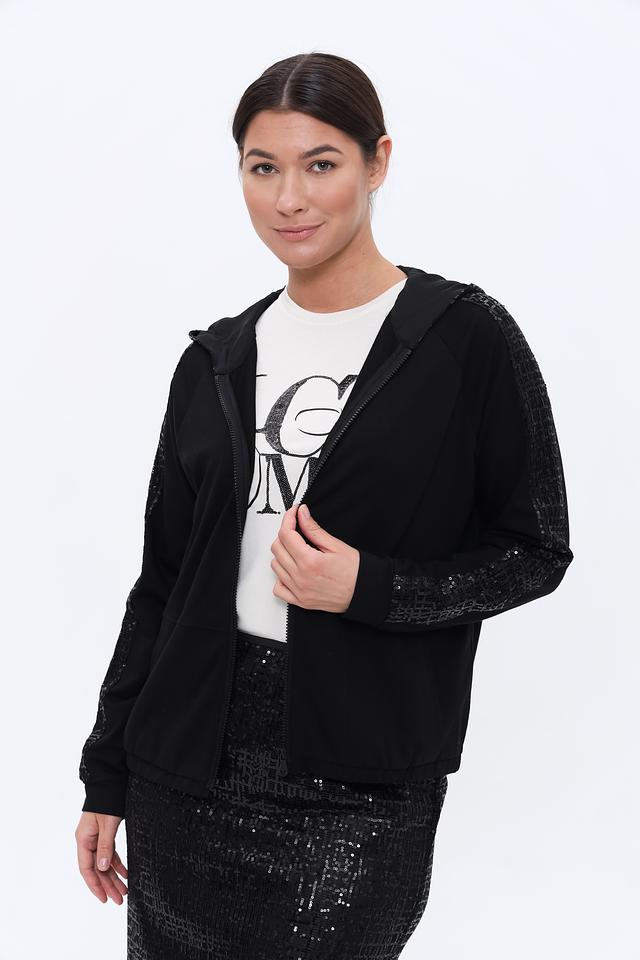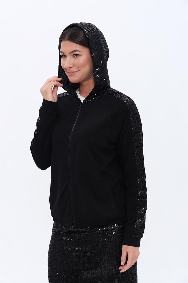 Чёрный жакет Lecomte с пайетками на рукавах – стильное и комфортное решение для создания модных образов. Модель на молнии с капюшоном, выполнена из мягкого трикотажа с добавлением хлопка и модала. Состав: хлопок 47%, модал 47%, эластан 6%