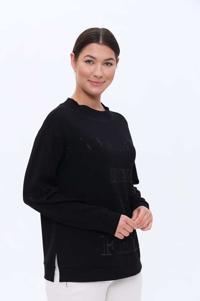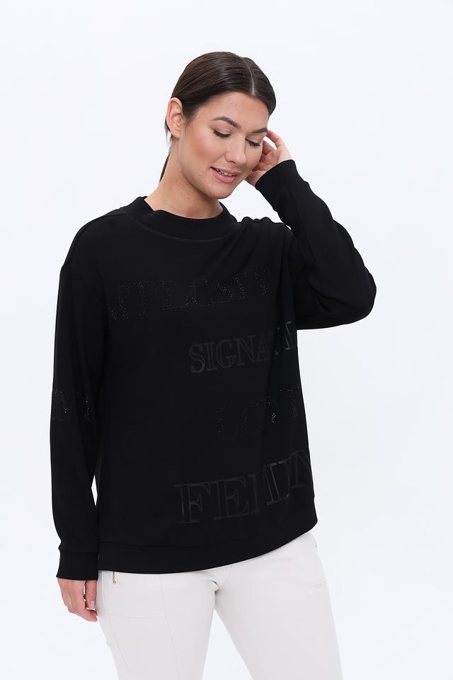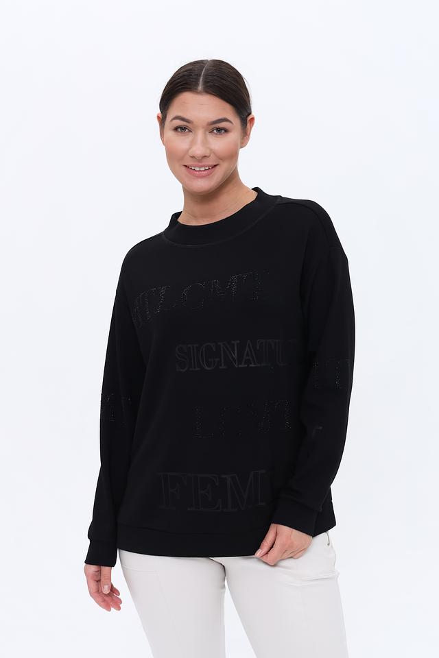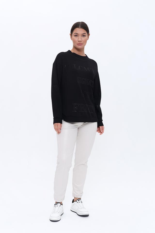 Пуловер имеет прямой крой и круглый вырез горловины. Главной особенностью является крупный принт с логотипом бренда, выполненный в технике тиснения. Этот элемент придает изделию современный и узнаваемый вид.