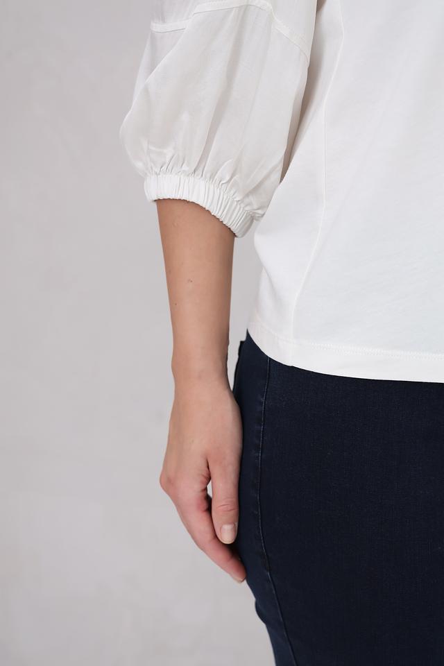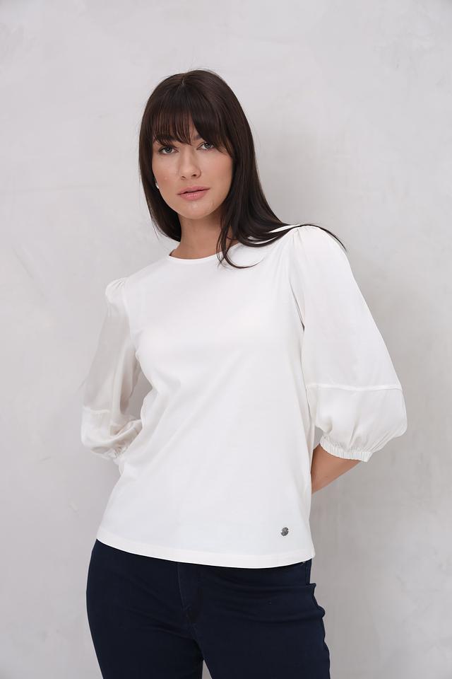 Белая блуза Lecomte с рукавами-фонариками – элегантный выбор для создания женственного образа. Модель выполнена из лёгкой ткани, обеспечивающей комфорт в течение дня, и имеет аккуратный круглый вырез. Состав: хлопок 50%, модал 50%
