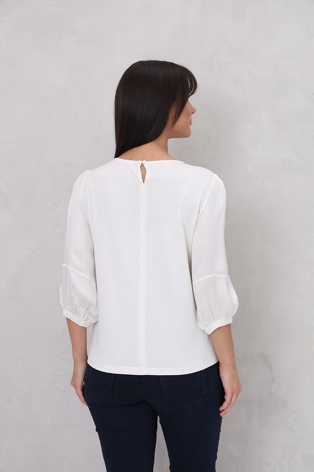 Блуза имеет свободный крой, который не сковывает движений, и рукава-фонарики, придающие ей романтичный вид. Круглый вырез горловины делает модель универсальной и подходящей для любого типа фигуры.