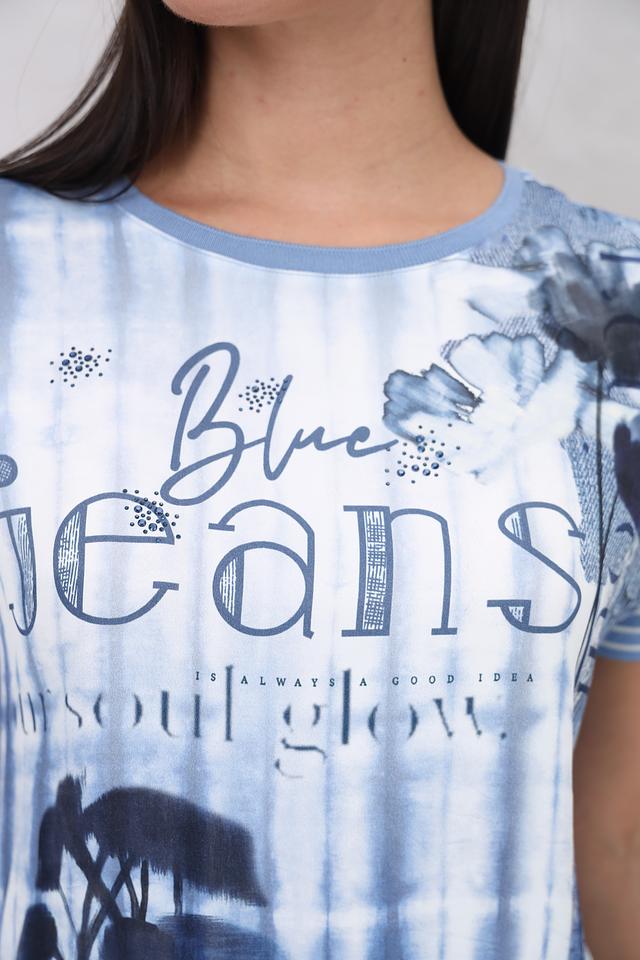Основной цвет футболки – голубой, но она украшена оригинальным принтом в виде абстрактных цветочных мотивов и надписью "Blue Jeans". Принт выполнен в различных оттенках синего и белого, создавая эффект tie-dye. Футболка имеет короткий рукав и округлый вырез горловины.