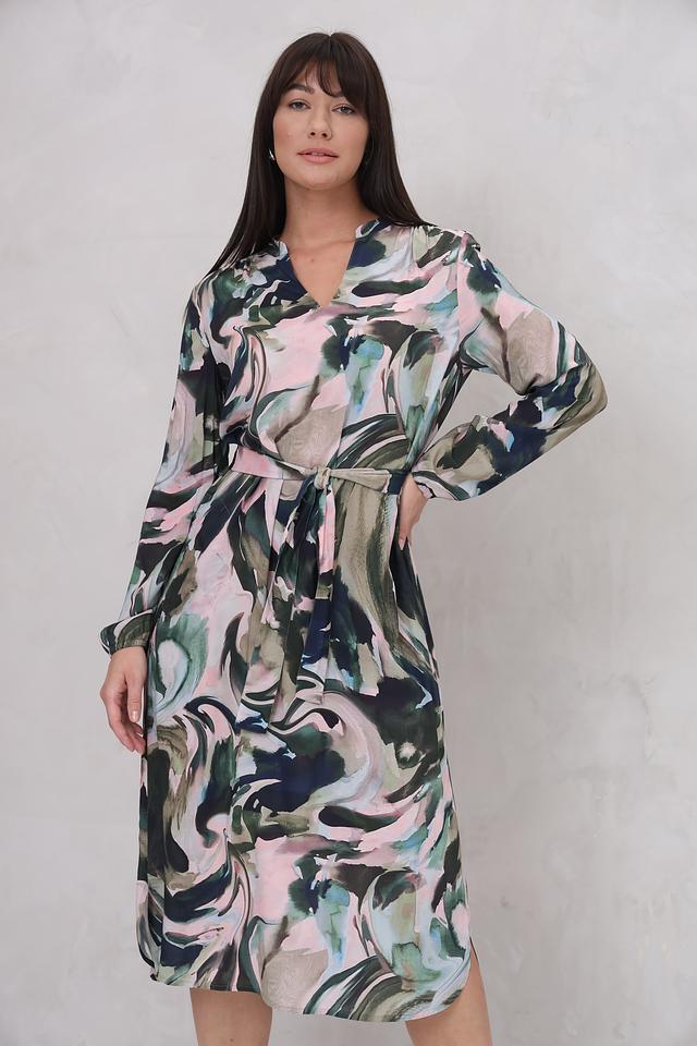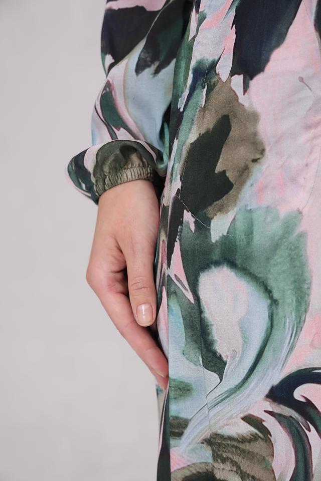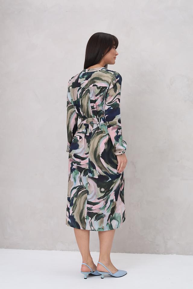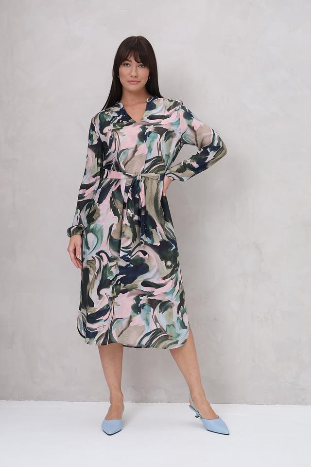 Особенностью этого платья является яркий цветочный принт, который придает ему неповторимый шарм и индивидуальность. Подчеркнуть талию и создать более женственный силуэт позволяет притачной пояс. Это платье идеально подойдет для создания стильных и комфортных образов.
