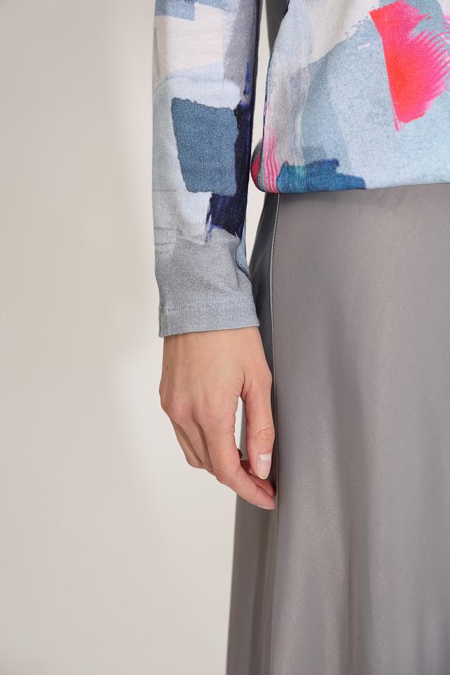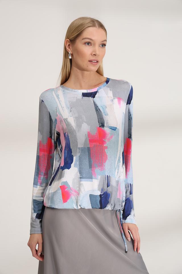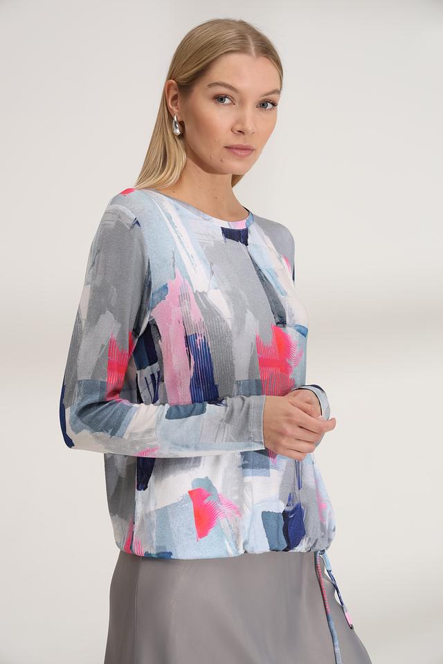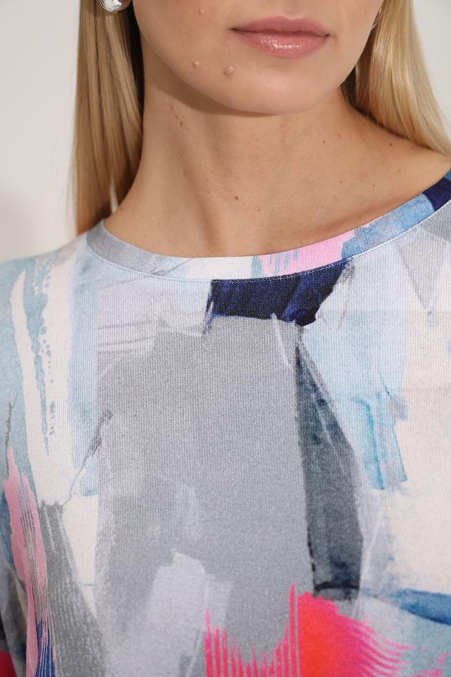 Особенностью модели является оригинальный абстрактный принт, выполненный в сочетании синих, розовых и серых оттенков. Этот принт делает пуловер уникальным и привлекательным. Состав: 95% вискоза, 5% эластан.