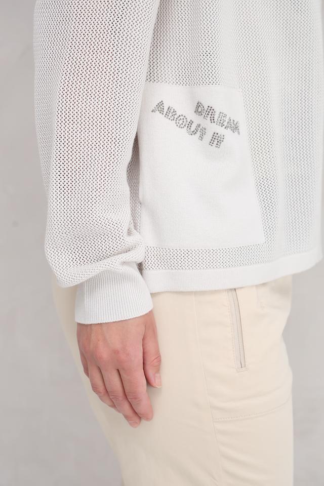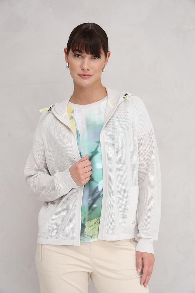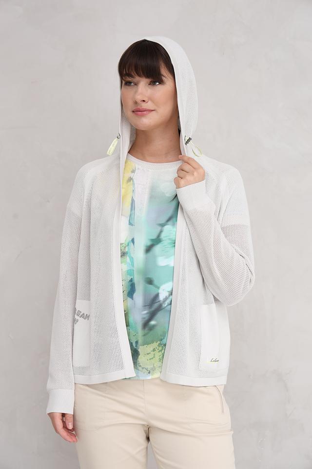 Этот жакет от Lecomte выполнен в светло-сером цвете и имеет оригинальную сетчатую текстуру. Модель с капюшоном и застежкой-молнией, что делает ее практичной и удобной в носке.