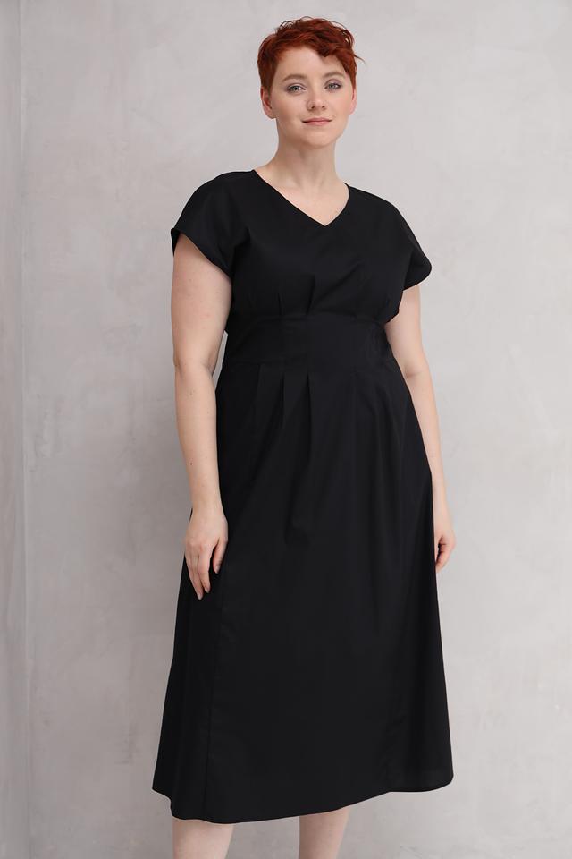 Модель имеет V-образный вырез, который визуально удлиняет шею и делает образ более изящным. Короткие рукава обеспечивают комфорт в тёплую погоду. Платье имеет слегка приталенный силуэт и юбку А-образного кроя, что делает его подходящим для разных типов фигур.