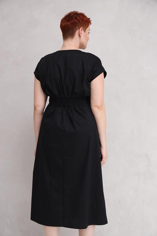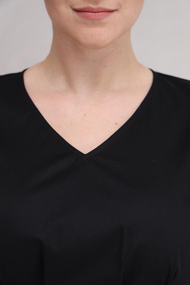 Чёрное платье от Lecomte – это элегантная и комфортная модель с V-образным вырезом и короткими рукавами. Платье выполнено из хлопка с добавлением эластана, что обеспечивает приятные тактильные ощущения и свободу движений. Состав: хлопок 97%, эластан 3%