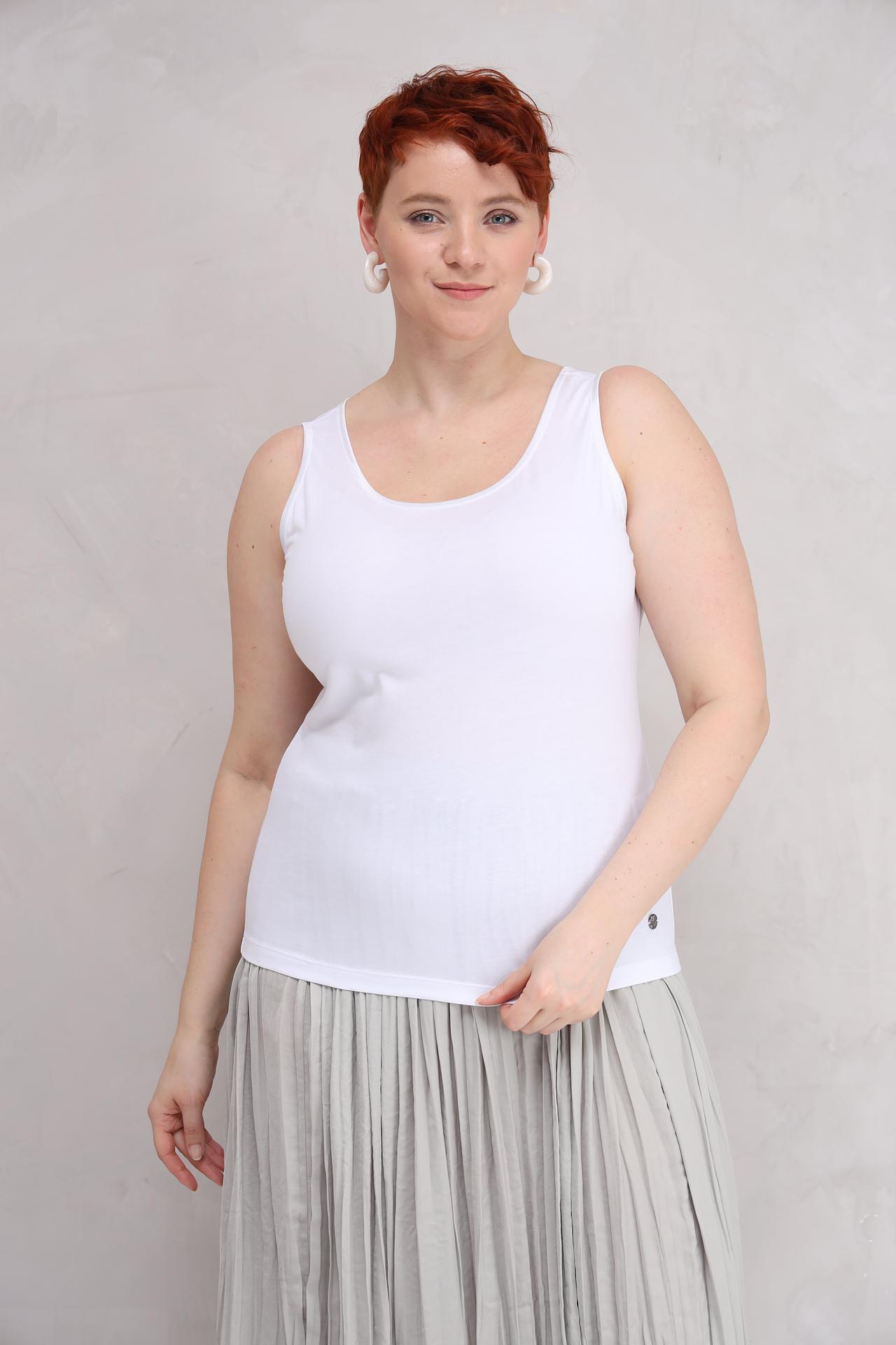 Идеальный базовый топ Lecomte выполнен в универсальном белом цвете, что делает его незаменимой частью женского гардероба. Эта женская майка прекрасно подходит для создания многослойных образов и как самостоятельный элемент повседневной одежды. Модель с классическим округлым вырезом горловины и комфортной посадкой.