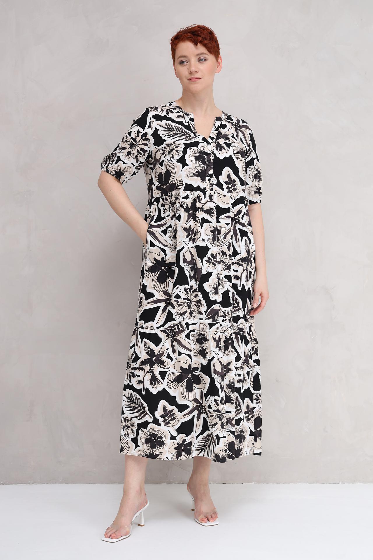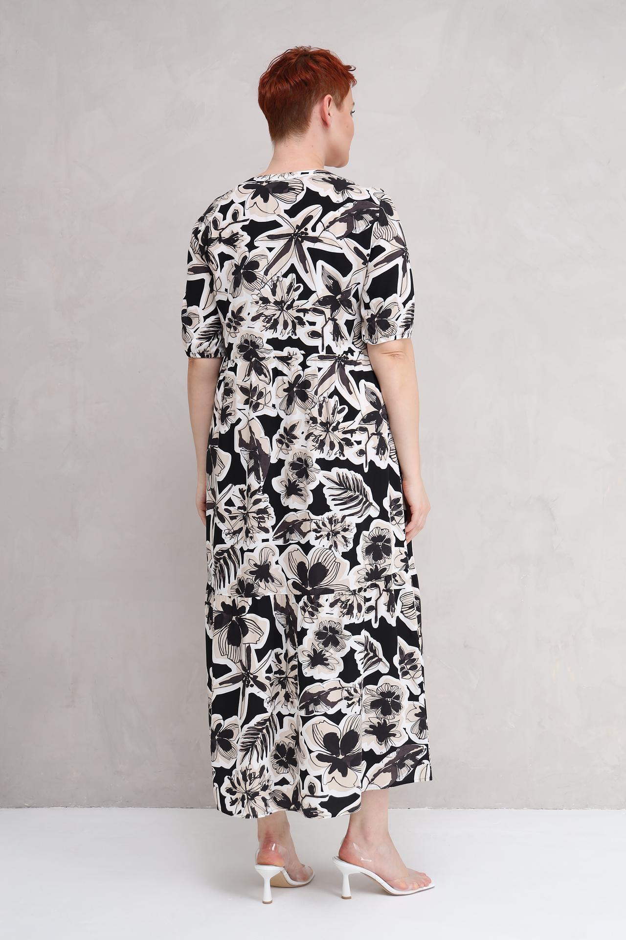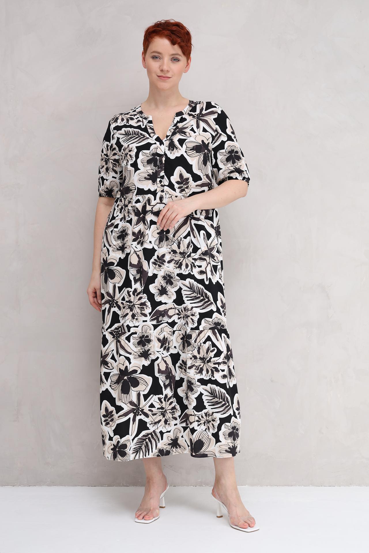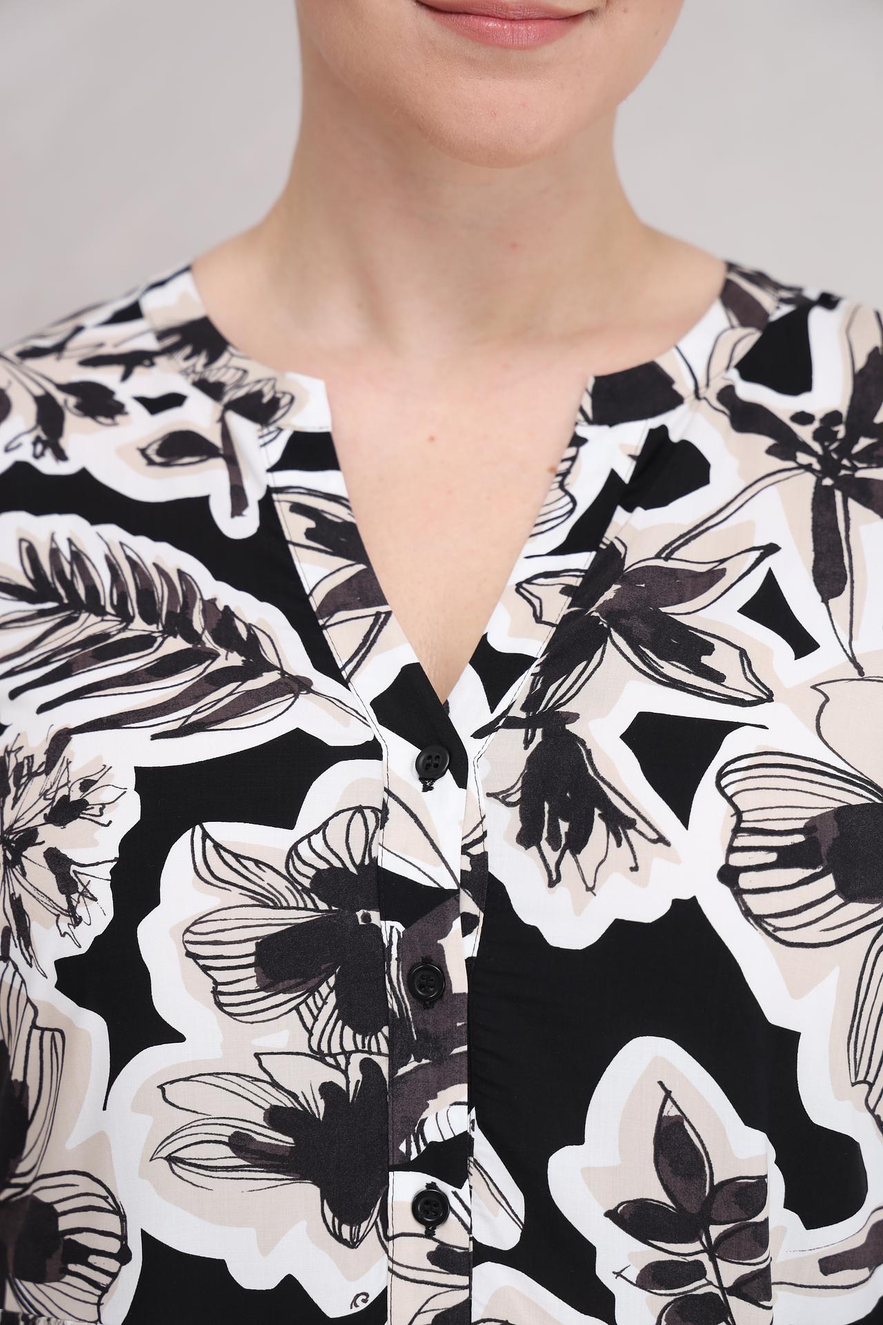 - Дизайн: Яркий цветочный принт на черном фоне выглядит стильно и выразительно. V-образный вырез с небольшой планкой на пуговицах добавляет изюминку.