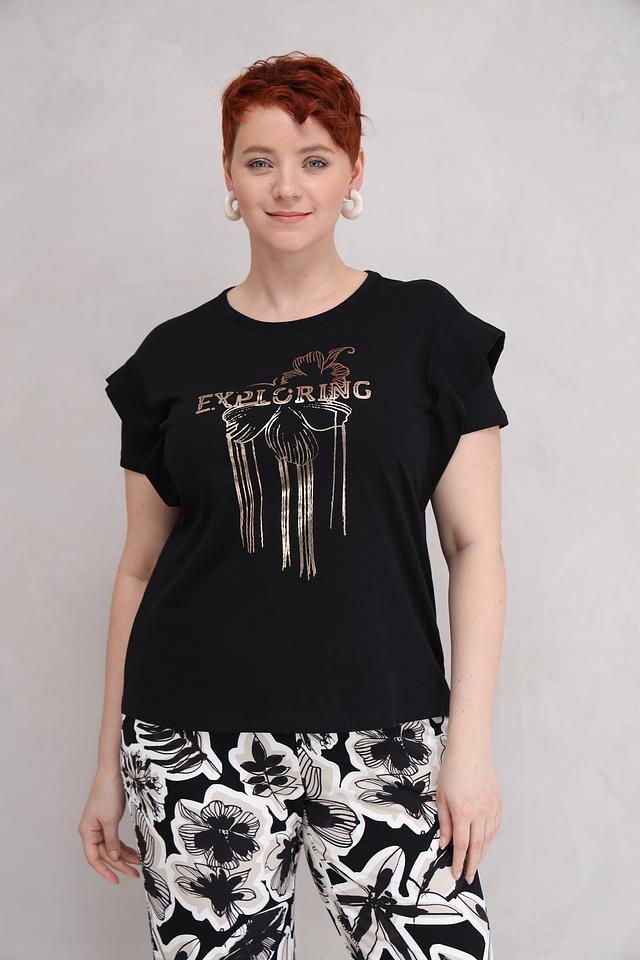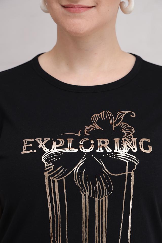 Чёрная футболка Lecomte с оригинальным золотистым принтом "Exploring". Изготовлена из 100% хлопка, обеспечивающего комфорт и воздухопроницаемость. Стильный крой с объёмными рукавами. Состав: хлопок 100%