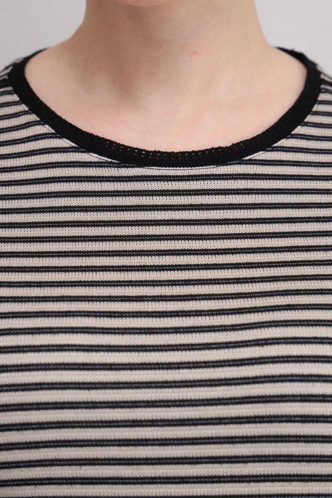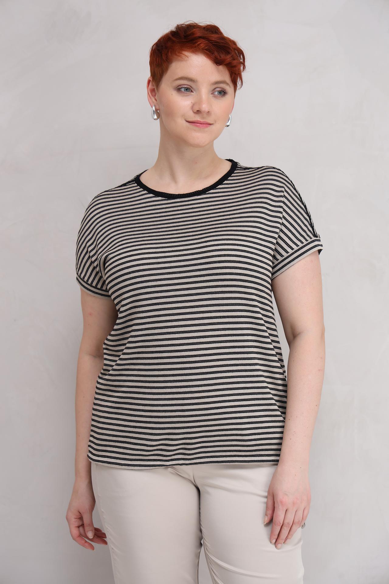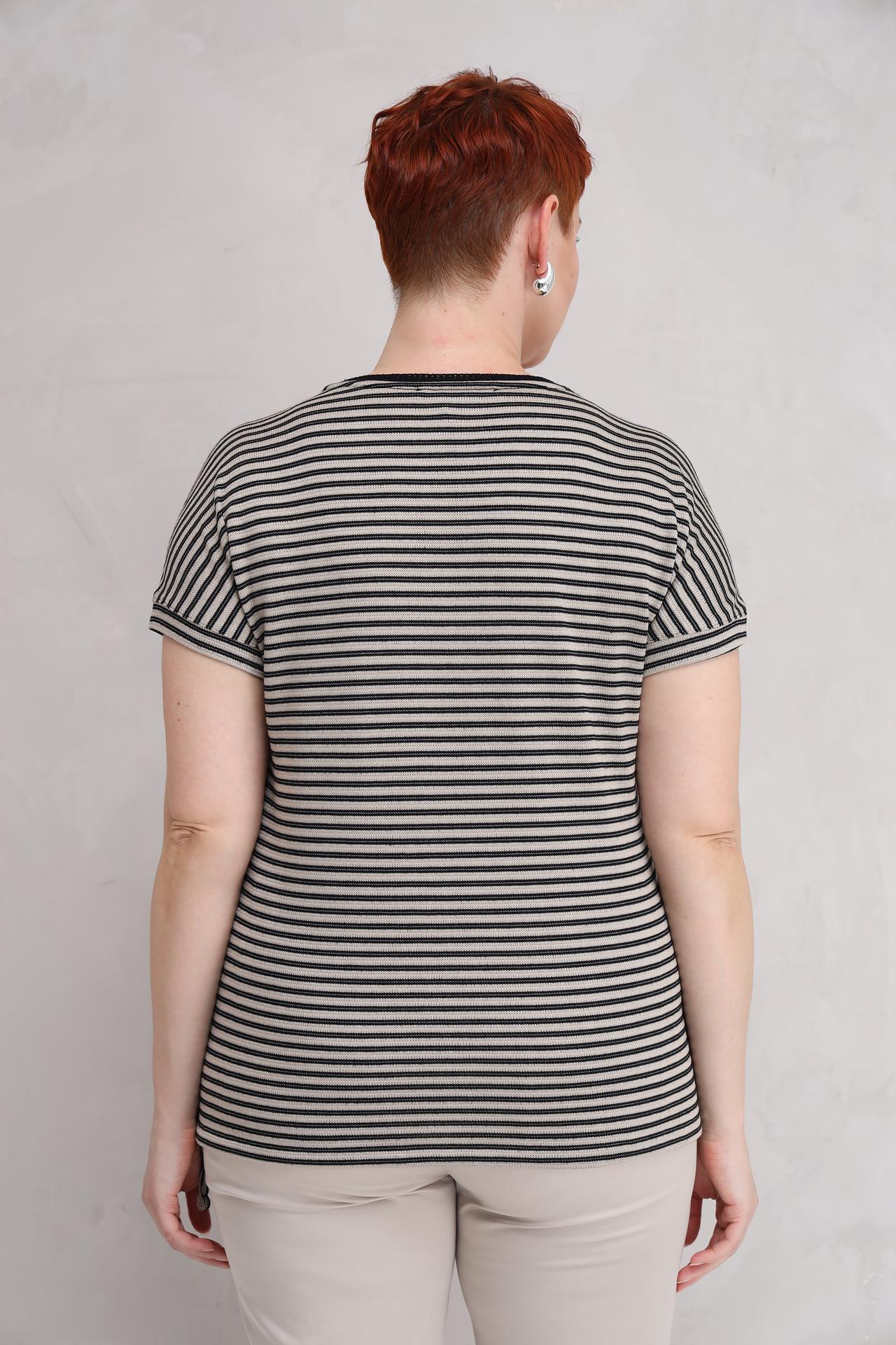 - Универсальный дизайн: Полосатый принт и классический крой позволяют легко сочетать футболку с различными элементами гардероба.