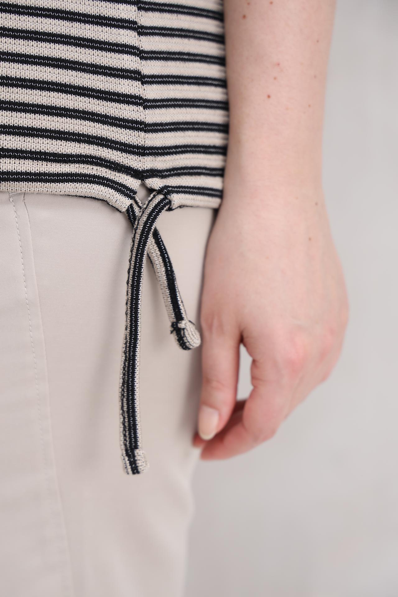 Эта футболка идеально подходит для работы в офисе, прогулок по городу или встреч с друзьями. Приятная к телу ткань позволяет коже дышать, обеспечивая комфорт в течение всего дня. Полосатый принт придает образу свежесть и динамичность. Дополнительные элементы в виде завязок по бокам добавляют неповторимый шарм.