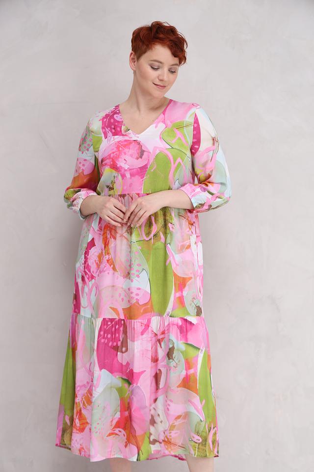 Платье Lecomte с ярким цветочным принтом выполнено из 100% вискозы, обеспечивая комфорт и лёгкость. Модель имеет V-образный вырез, рукава 3/4 и многослойную юбку. Состав: вискоза 100%