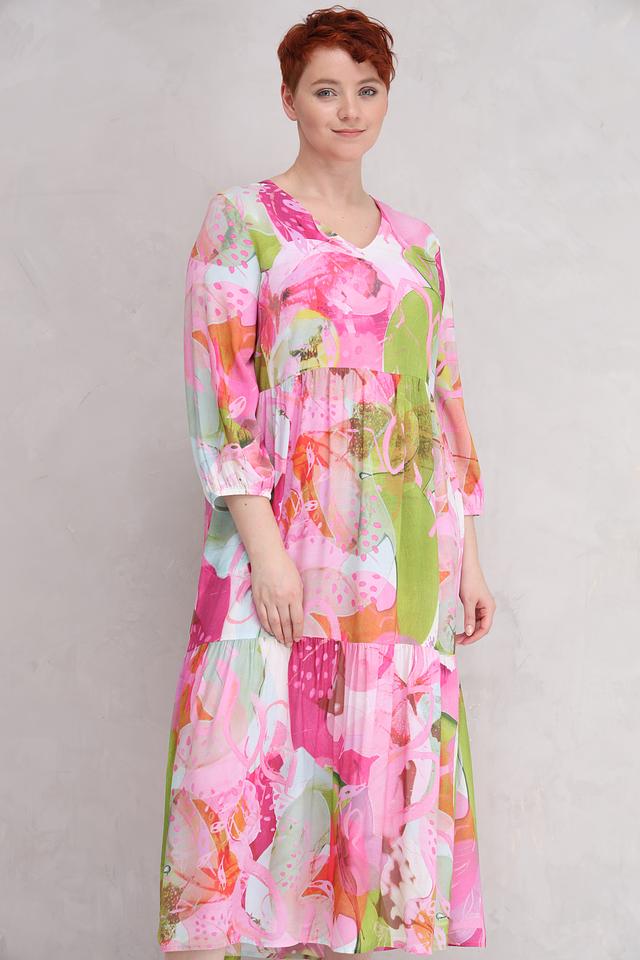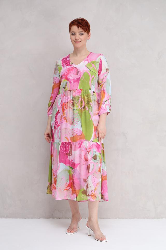 Модель отличается ярким цветочным принтом, который придает ей неповторимый вид. Платье имеет V-образный вырез, короткие рукава и многослойную юбку, создающую лёгкий и воздушный силуэт.