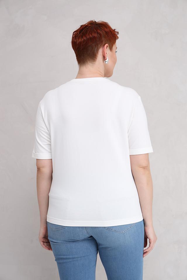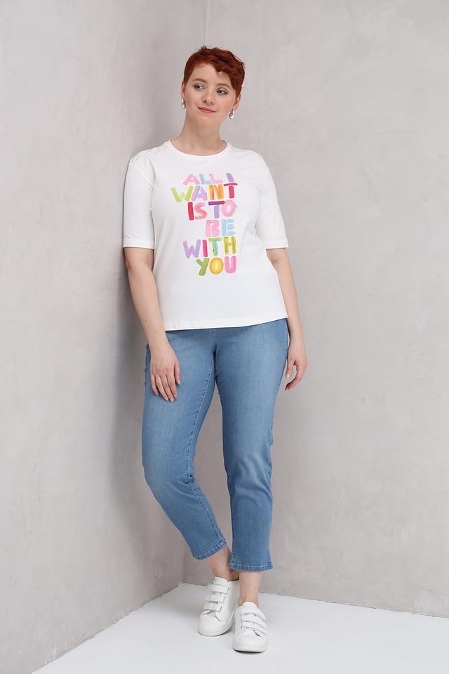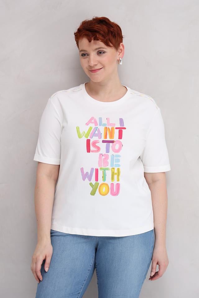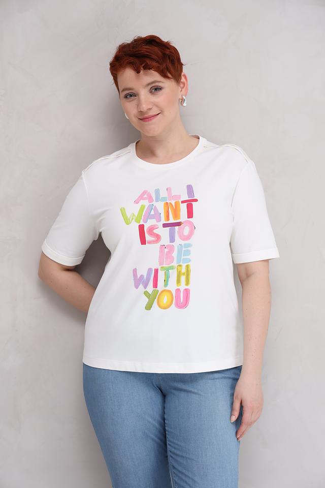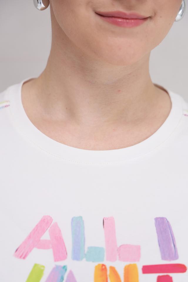 Основной цвет футболки – белый, что делает ее универсальной и легко сочетаемой с другими элементами одежды. Главная особенность модели – яркий и привлекательный принт с надписью, выполненный в различных цветах.