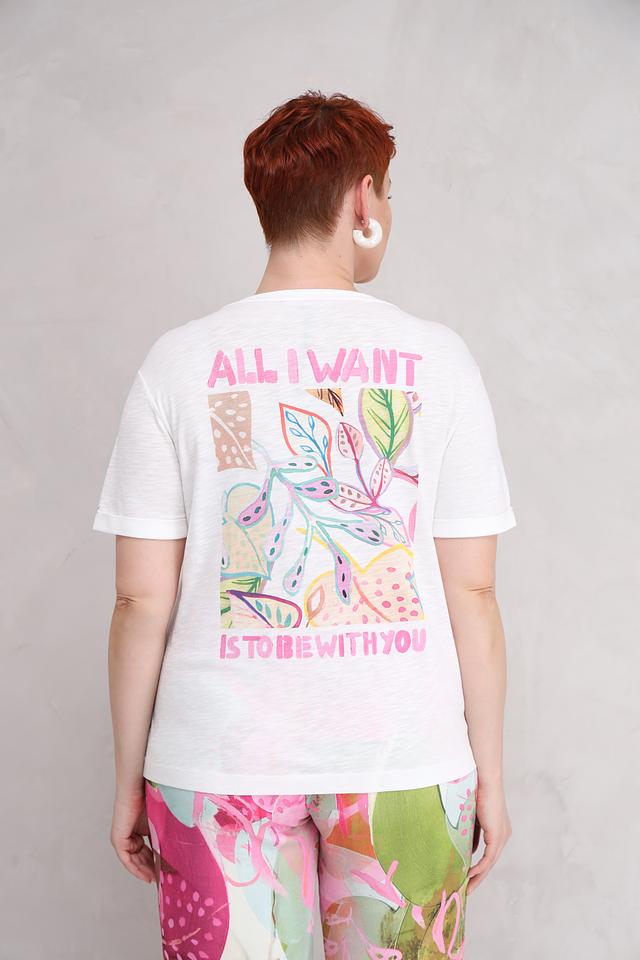 Эта стильная футболка от Lecomte станет отличным дополнением к вашему гардеробу. Выполнена в белом цвете и украшена ярким, красочным принтом с изображением листьев и надписью "ALL I WANT IS TO BE WITH YOU".